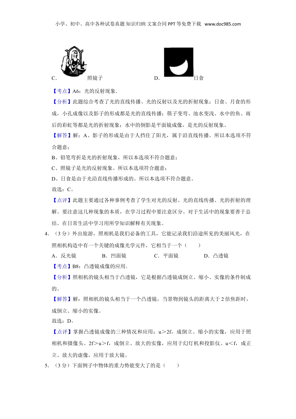 小学、初中、高中各种试卷真题知识归纳文案合同PPT等免费下载www.doc985.com2015年湖南省怀化市中考物理试卷(教师版)一、选择题(本题包括16小题,每小题3分,共48分。每小题只有一个选项符合题意)1.(3分)以下单位中,表示功率单位的是()A.千克B.瓦特C.牛顿D.米【考点】2S:物理量的单位及单位换算.菁优网版权所有【分析】根据对常见物理量及其单位的掌握作答。【解答】解:在国际单位制中,A、千克是质量的主单位。不符合题意;B、瓦特是功率的主单位。符合题意;C、牛顿是力的主单位。不符合题意;D、米是长度的主单位。不符合题意。故选:B。【点评】此题考查的是我们对常见物理量及其单位的掌握情况,属于识记性知识的考查,是一道基础题,容易解答。2.(3分)“教室外狂风暴雨,雷声大作”,这里的“雷声大作”指的是声音特征中的()A.响度B.音调C.音色D.反射【考点】9I:音调、响度与音色的区分.菁优网版权所有【分析】声音的特征有音调、响度、音色;音调表示声音的高低,响度表示声音的大小,音色是声音的品质与特色。【解答】解:“教室外狂风暴雨,雷声大作”,这里的“雷声大作”是指声音很大,所以指的是声音特征中的响度。故选:A。【点评】声音的音调、响度、音色三个特征是从三个不同角度描述声音的,且影响三个特征的因素各不相同。3.(3分)下面列举的四个光现象中,属于光的反射现象的是()A.踩影子B.铅笔弯折了小学、初中、高中各种试卷真题知识归纳文案合同PPT等免费下载www.doc985.comC.照镜子D.日食【考点】A6:光的反射现象.菁优网版权所有【分析】此题综合考查了光的直线传播、光的反射以及光的折射现象;日食、月食的形成,小孔成像以及影子的形成都是光的直线传播;筷子变弯、池水变浅、水中的鱼、雨后的彩虹等都是光的折射现象;水中的倒影是平面镜成像,是光的反射现象。【解答】解;A、影子的形成是由于人挡住了阳光,属于沿直线传播。所以本选项不符合题意;B、铅笔弯折是光的折射现象,所以本选项不符合题意;C、照镜子是光的反射现象。所以本选项符合题意;D、日食是由于光沿直线传播形成的。所以本选项不符合题意。故选:C。【点评】此题主要通过各种事例考查了学生对光的反射、光的直线传播、光的折射的理解。要注意这几种现象的本质,在学习过程中要注意区分。对于生活中的现象要善于总结。在日常生活中学习用所学知识解释有关现象。4.(3分)外出旅游,照相机是我们必备的工具,它能记录我们沿途所见的美丽风光,在照相机构造中有一个关键的成像光学元件,它相当于一个()A.反光镜B.凹面镜C.平面镜D.凸透镜【考点】B8:凸透镜成像的应用.菁优网版权所有【分析】照相机的镜头相当于凸透镜,它是根据凸透镜成倒立、缩小、实像的条件制成的。【解答】解:照相机的镜头相当于一个凸透镜,当景物到镜头的距离大于2倍焦距时,成倒立、缩小的实像。故选:D。【点评】掌握凸透镜成像的三种情况和应用:u>2f,成倒立、缩小的实像,应用于照相机和摄像头。2f>u>f,成倒立、放大的实像,应用于幻灯机和投影仪。u<f,成正立、放大的虚像,应用于放大镜。5.(3分)下面例子中物体的重力势能变大了的是()小学、初中、高中各种试卷真题知识归纳文案合同PPT等免费下载www.doc985.comA.铁球从斜面顶端滚下来B.骑自行车冲上坡顶C.飞机在高空水平飞行D.立在山顶上的石头【考点】FM:势能大小的比较.菁优网版权所有【分析】重力势能大小的影响因素:质量、被举得高度。质量越大,高度越高,重力势能越大。【解答】解:A、铁球从斜面顶端滚下来,质量不变,高度减小,重力势能减小,故A不符合题意;B、骑自行车冲上坡顶,质量不变,高度增大,重力势能增大,故B符合题意;C、飞机在高空水平飞行,质量不变,高度不变,重力势能不变,故C不符合题意;D、立在山顶上的石头,质量不变,高度不变,重力势能不变,故D不符合题意。故选:B。【点评】掌握动能、重力势能的影响因素,用控制变量法,判断重力势能的变化情况,属于一道基础题。6.(3分)下列现象中,是通过做功改变物体内能的是()A.冬天在火炉边烤火B.冬...
