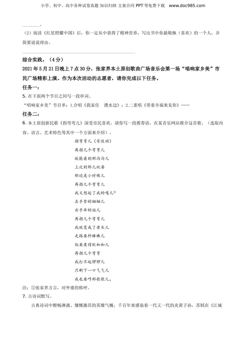 小学、初中、高中各种试卷真题知识归纳文案合同PPT等免费下载www.doc985.com湖南省张家界市2021年中考语文试题1.阅读下面的语段,完成各题。历史是最生动的教科书,是最丰富的营养剂,一代代仁人志士(),救民族于存亡之时;一代代革命先烈(),救人民于水火之中;一代代新中国的建设者为了国家的繁荣富强而鞠躬尽cuì_______。回顾历史,不是为了从成功中寻求慰藉__________,而是为了让红色基因()。激励青年一代为实现体大中国梦而()。(1)在横线上写出相应的拼音和汉字。①鞠躬尽cuì_______②慰藉__________(2)依次填入文中括号里的词语最合语境的一项是()A.前仆后继赴汤蹈火薪火相传不懈奋斗B.冲锋陷阵呕心沥血熠熠闪光矢志不渝C.冲锋陷阵赴汤蹈火熠熠闪光不懈奋斗D.前仆后继呕心沥血薪火相传矢志不渝2.下列各句没有语病的一项是()A.第12版《新华字贵》收录了“拼购”“刷屏”等网络词语,意味着一些网络词语被更广泛地使用和接受。B.党的十八大以来,我国推动生态环境保护力度之大前所未有,环境污染防治行动成效明显。C.三亚国家水稻公园示范点的“超优千号”杂交水程,平均亩产1004.83公斤,比预测亩产量多了约100公斤左右。D.有识之士认为,能否科学设计家庭作业是实现家校良性互动、家庭作业回归育人本位的重要条件之一。3.下列句子排序恰当的一项是()①有人说:生活太单调了。不能创造。②平凡无过于一张白纸,八大山人挥毫画他几笔,便成为一幅名贵的杰作。③教育者要善于创造值得自己崇拜的创造理论和创造技术。④有人说:环境太平凡,不能创造。⑤可见平凡单调,只是懒惰者之遁词。⑥单调无过于坐监牢,但是就在监牢中,产生了《易经》之卦辞,产生了《正气歌》。A.③④②①⑥⑤B.③①②④⑥⑤C.①④②⑥⑤③D.①⑥②④③⑤4.名著阅读。(1)填空:《红星照耀中国》又名《__________》,是美国著名记者埃德加·斯诺的一部纪实作品、全书共12篇,写了两个层面的事实:一是作者1936年6月至10月采访“红色中国”的过程;二是:______小学、初中、高中各种试卷真题知识归纳文案合同PPT等免费下载www.doc985.com________。(2)阅读《红星照耀中国》后,你一定从中获得了精神营养,写出书中你最敬佩(喜欢)的一个人,并简要说说理由。____________________________________________________综合实践。(4分)2021年5月21日晚上7点30分,张家界本土原创歌曲广场音乐会第一场“唱响家乡美”市民广场精彩上演。作为本次活动的志愿者,请你完成以下任务。任务一:5.在下面两个节目之间写一段串词。“唱响家乡美”节目单:1.合唱《我家住在澧水边》;2.二重唱《带着幸福来见你》……任务二:6.本土原创新民歌《拐弯弯儿》深受市民喜欢。请你写一段推荐语,在某音乐网站推介这首歌。(选取内容、语言、艺术特色等其中一个方面来介绍)。拐弯弯儿(有改动)再拐几个弯弯儿就能看到那沟沟儿上次到那儿玩耍那还是小时候儿再拐几个弯弯儿我又想起了我的嘎儿①左手拿的锄锄儿右手牵的娃儿再拐几个弯弯儿我就变成了老头儿走路要杵棒棒儿饭要煮得软和和儿再拐几个弯弯我打不起锣锣儿只剩下一口气气儿我也要哼那歌歌儿。注:①张家界方言,对外婆的称呼。7.古诗词默写。古典诗词中酣畅淋漓、慷慨激昂的英雄气概,千百年来感染着一代又一代的炎黄子孙,苏轼在《江城小学、初中、高中各种试卷真题知识归纳文案合同PPT等免费下载www.doc985.com子·密州出猎》中用“①___________________,___________________”表达他杀敌报国的远大抱负;李贺在《雁门太守行》中用“②___________________,___________________”展现他忠君报国的赤诚之心;文天祥在《过零丁洋》中用“③___________________,___________________”抒发他视死如归的英雄豪情。二、阅读(38分)(一)(4分)8.阅读下面古诗,回答小题。汉江临泛王维[唐代]楚塞三湘接,荆门九派①通。江流天地外,山色有无中。郡邑②浮前浦③,波澜动远空。襄阳好风日,留醉与山翁。注释:①九派:这里指江西九江。②郡邑:指汉江两岸的城镇。③浦:水边。张家界某电视台邀请你参加《汉江临泛》的短视频拍摄,需要你帮助...