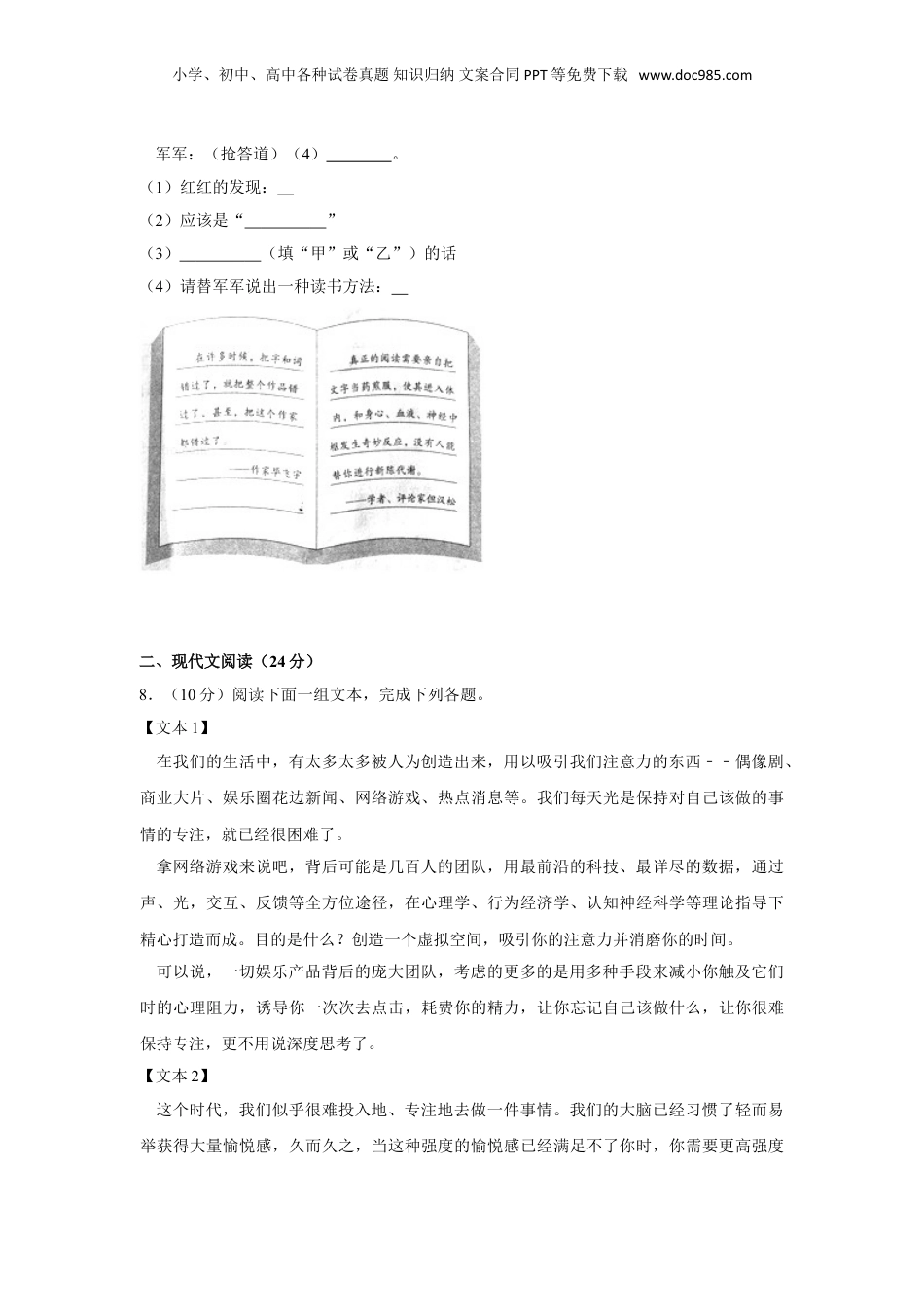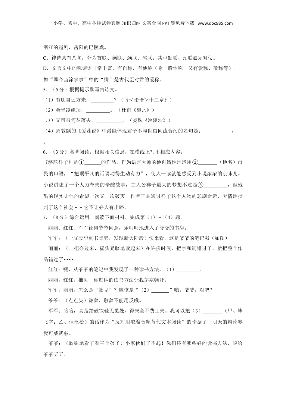 小学、初中、高中各种试卷真题知识归纳文案合同PPT等免费下载www.doc985.com2018年湖南省岳阳市中考语文试卷一、基础•运用(26分)1.(4分)阅读下面的文字,给加点字注音,根据拼音写汉字。相信自己吧!相信你自己的思想,相信你内心深处所确认的东西吧。把自己的心智公之于众,并努力实践。因为蕴藏在人身上的潜力是无尽的,你能胜任什么事情,不但别人无法知xiǎo,而且若不动手尝试,你对自己的这种能力也会一直蒙昧不察。只要做到这样,自己拔cuì超群就更有可能。2.(2分)依次填入下列句子横线处的词语,最恰当的一项是()所谓成功,就是专心的人彼此之间长期竞争而产生的_____,专心未必就能夺得冠军,还要看天分和机缘。然而在“专心”的行列里,_____站在最后一名,也还是置身于精英之列,比那些玩忽怠惰,因循无知的人_____很多。A.结果虽然率先B.后果即使领先C.结果即使领先D.后果虽然率先3.(2分)下面语段中标序号的句子都有语病,没改正确的一项是()用一把毫毛,变出千百个一模一样的猴子﹣﹣《西游记》里的神话正在变为现实。①2018年1月25日,诞生近两个多月的中国克隆猴“中中”和“华华”的照片登上国际权威学术期刊《细胞》封面,这意味着中国科学家成功突破了现有技术无法克隆灵长类动物的世界难关。②自1996年第一只克隆羊“多莉”诞生以来,使各国科学家先后克隆了牛、鼠等动物,但一直没有突破与人类最相近的非人灵长类动物克隆的难关。③科学家曾普遍认为现有技术不是无法克隆灵长类动物。④中科院神经科学研究所经过5年努力,成功突破了世界生物前沿。A.句子①删去“近”或“多”B.句子②删去“使”C.句子③删去“不是”D.句子④在句末加“的秘密”4.(2分)下列有关传统文化常识的表述不正确的一项是()A.古代把星座称作星宿。如《范进中举》中“果然天上‘文曲星’是打不得的”句中的“文曲星”,按旧时迷信说法,指主管文运的星宿。B.我国的戏曲历史悠久,很多地方形成了具有浓郁地方特色的剧种,如安徽的黄梅戏、小学、初中、高中各种试卷真题知识归纳文案合同PPT等免费下载www.doc985.com浙江的越剧,岳阳的巴陵戏。C.律诗共有八句,分为首联、颔联、颈联、尾联。其中颔联、颈联必须对仗。D.文言文中的称谓语非常丰富,有自称,有他称(除一般他称,又有爱称、敬称等)。如“卿今当涂掌事”中的“卿”是古代臣对君的爱称。5.(5分)根据提示默写古诗文。(1)有朋自远方来,?(《<论语>十二章》)(2)会当凌绝顶,。(杜甫《望岳》)(3)无可奈何花落去,。(晏殊《浣溪沙》)(4)周敦颐的《爱莲说》中最能体现君子不与世俗同流合污的名句是:,。6.(3分)名著阅读。根据相关信息,在横线上写出相应内容。《骆驼祥子》是①的作品,作为语言大师的他创造性地运用②(地名)市民的口语,“把顶平凡的话调动得生动有力”,使人一读就能感受到小说浓浓的京味儿。小说讲述了一个人力车夫的辛酸故事,主人公祥子最大的梦想不过是③,但残酷的现实让他的希望一次又一次破灭。作者正是通过祥子这个人物的悲剧命运,无情地批判了这个社会﹣﹣它不让好人有出路。7.(8分)综合运用。阅读下面材料,完成第(1)﹣(4)题。丽丽、红红、军军征得爷爷同意,乐呵呵地进入了爷爷的书房。军军:(一屁股坐到书桌旁,发现新大陆般)快来看,这是爷爷的笔记哦(如图)丽丽:(一把夺过来,摇头晃脑地读起来)在许多时候,把字和词错过了,就把整个作品错过了……红红:嘿,从爷爷的笔记中我发现了一种读书方法,(1)。丽丽:红红,拙见!你归纳的读书方法让我茅塞顿开。军军:丽丽,怎么是“拙见”?应该是“(2)”喲。爷爷,对吧?爷爷:(点点头)谦辞、敬辞不能用反哦。军军:哈哈,真是踏破铁鞋无觅处,得来全不费工夫。我可以把(3)(甲、毕飞字;乙、但汉松)的话作为“反对用浓缩音频替代文本阅读”的论据了,明天的辩论赛我可威武啦。爷爷:(欣慰地看了看三个孩子)小家伙们了不起!你们还有哪些好的读书方法,说给爷爷听听。小学、初中、高中各种试卷真题知识归纳文案合同PPT等免费下载www.doc985.com军军:(抢答道)(4...