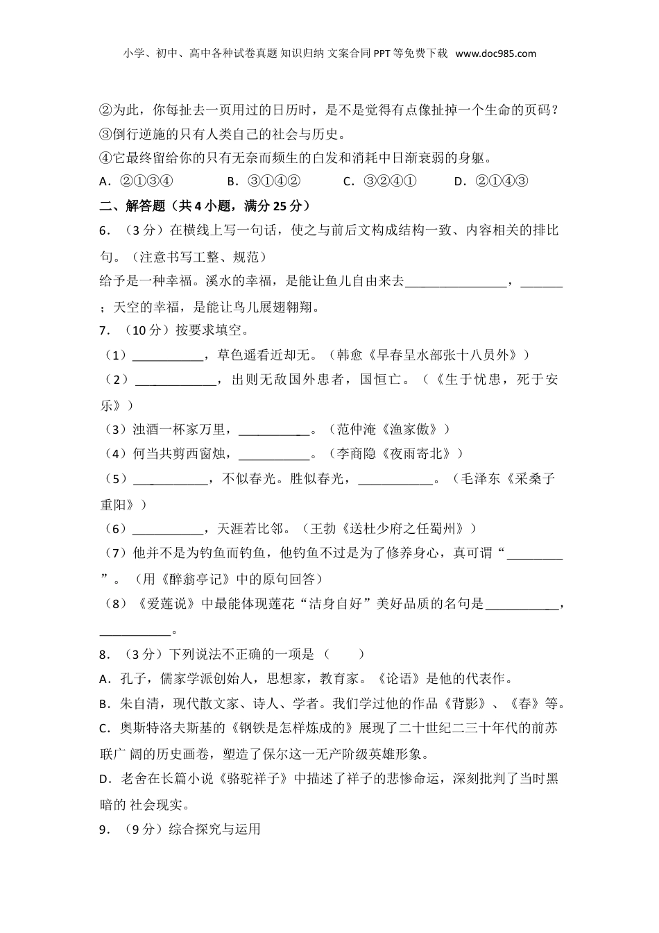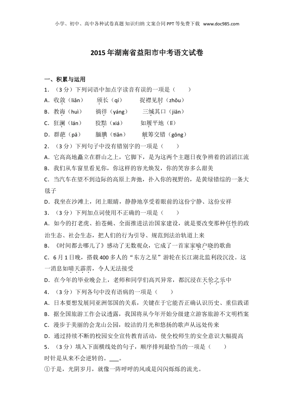 小学、初中、高中各种试卷真题知识归纳文案合同PPT等免费下载www.doc985.com2015年湖南省益阳市中考语文试卷一、积累与运用1.(3分)下列词语中加点字读音有误的一项是()A.收敛(liǎn)颀长(qí)捉襟见肘(zhǒu)B.教诲(huì)徜徉(yáng)三缄其口(jiān)C.狂澜(lán)狡黠(xiá)如履平地(lǐ)D.群葩(pā)腼腆(tiǎn)觥筹交错(gōng)2.(3分)下列句子中没有错别字的一项是()A.它高高地矗立在群山之上,它脚下,是为这两个主题日夜争辨着的滔滔江流B.我们从车窗里看见你,你这样的容光焕发,你的笑容多么甜美C.当汽车在望不到边际的高原上奔弛,扑入你的视野的,是黄绿错综的一条大毯子D.我坐在沙滩上,闭上眼睛,静静地享受着眼前的这份宁静、这份安祥3.(3分)下列加点词使用不正确的一项是()A.如今的打老虎、拍苍蝇、全面推进法治国家建设,就是要改变那种任性的政治生态、社会生态,把人们的行为引导、规范到法治轨道上来B.《时间都去哪儿了》感动了无数观众,它成了一首家家喻户晓的歌曲C.6月1日晚,搭载400多人的“东方之星”游轮在长江湖北监利段沉没。这一消息如晴天霹雳,令人无法接受D.在今年的毕业晚会上,老师和同学们高兴异常,都沉浸在天伦之乐中4.(3分)下列各句中没有语病的一项是()A.日本要想发展同亚洲邻国的关系,关键在于它能否正确认识历史、重信践诺B.据全国旅游工作会议透露,我国将从今年开始分级建立游客旅游不文明档案C.漫步于美丽的会龙山公园,皎洁的月光和悠扬的歌声从远处传来D.通过持续不断的校园安全宣传教育活动,使全校师生的安全意识大幅提高5.(3分)填入下面横线处的句子,顺序排列最恰当的一项是()时针是从来不会逆转的。。①于是,光阴岁月,就像一阵呼呼的风或是闪闪烁烁的流光。小学、初中、高中各种试卷真题知识归纳文案合同PPT等免费下载www.doc985.com②为此,你每扯去一页用过的日历时,是不是觉得有点像扯掉一个生命的页码?③倒行逆施的只有人类自己的社会与历史。④它最终留给你的只有无奈而频生的白发和消耗中日渐衰弱的身躯。A.②①③④B.③①④②C.③②④①D.②①④③二、解答题(共4小题,满分25分)6.(3分)在横线上写一句话,使之与前后文构成结构一致、内容相关的排比句。(注意书写工整、规范)给予是一种幸福。溪水的幸福,是能让鱼儿自由来去,;天空的幸福,是能让鸟儿展翅翱翔。7.(10分)按要求填空。(1),草色遥看近却无。(韩愈《早春呈水部张十八员外》)(2),出则无敌国外患者,国恒亡。(《生于忧患,死于安乐》)(3)浊酒一杯家万里,。(范仲淹《渔家傲》)(4)何当共剪西窗烛,。(李商隐《夜雨寄北》)(5),不似春光。胜似春光,。(毛泽东《采桑子重阳》)(6),天涯若比邻。(王勃《送杜少府之任蜀州》)(7)他并不是为钓鱼而钓鱼,他钓鱼不过是为了修养身心,真可谓“”。(用《醉翁亭记》中的原句回答)(8)《爱莲说》中最能体现莲花“洁身自好”美好品质的名句是,。8.(3分)下列说法不正确的一项是()A.孔子,儒家学派创始人,思想家,教育家。《论语》是他的代表作。B.朱自清,现代散文家、诗人、学者。我们学过他的作品《背影》、《春》等。C.奥斯特洛夫斯基的《钢铁是怎样炼成的》展现了二十世纪二三十年代的前苏联广阔的历史画卷,塑造了保尔这一无产阶级英雄形象。D.老舍在长篇小说《骆驼祥子》中描述了祥子的悲惨命运,深刻批判了当时黑暗的社会现实。9.(9分)综合探究与运用小学、初中、高中各种试卷真题知识归纳文案合同PPT等免费下载www.doc985.com“各地中小学把足球列入体育课教学内容,加大学时比重。以扶持特色带动普及。对基础较好、积极性较高的中小学重点扶持,全国中小学校园足球特色学校在现有5000多所基础上,2020年达到2万所,2025年达到5万所,其中开展女子足球的学校占一定比例……”(摘自2015年3月16日公布的《中国足球改革发展总体方案》)(1)请探究上面这段文字,用自己的语言说说从中获得的信息。(2)永州市某中学将举行以“足球梦,梦起航”为主题的校园足球文化节,请你为校园足球...