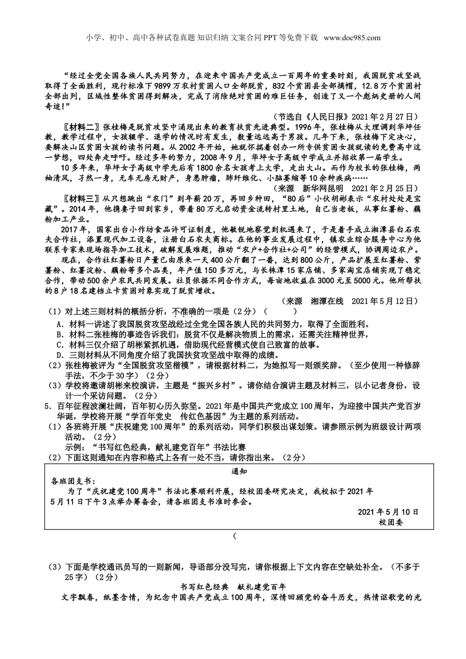 小学、初中、高中各种试卷真题知识归纳文案合同PPT等免费下载www.doc985.com2021年湘潭市初中学业水平考试语文试题卷1.本试卷共四道大题,25建小题。试卷满分120分,考试时量120分钟。2.本试卷所有答案均须填写在答题卷相应的位置上,否则不予计分。一、现代文阅读(34分)(一)论述类文本阅读(6分)宇宙也有“高速公路”李明涛①据国际学术期刊《科学进展》日前报道,科学家在太阳系中发现了新的星际“高速公路”。小天体可以“借道”星际高速公路,用几十年时间完成从小行星带到海王星之外的轨道迁移,此前学术界普遍认为该迁移过程需要几十万至百万年时间。②在宇宙中航行,离不开引力,也藏有“高速公路”。星际高速公路,就是太阳系中一系列相互连接的空间流形管道构成的超级运输网络。这些空间流形管道与太阳系天体的拉格朗日点密切相关。不同天体附近的流形管道在空间中可以相互连接,由此形成庞大的星际高速公路网络。在星际高速公路网络上运行的物体,无需消耗任何燃料便可从太阳系一处转移到另一处。③早在1997年,美国科学家就利用星际高速公路理论,为“创世纪号”航天器设计了低能量转移轨道。该航天器在从2001年发射后到返回地球的过程中,几乎没有消耗任何燃料。2011年,中国“嫦娥二号”探月卫星完成任务后,利用剩余不多的燃料“搭乘”星际高速公路飞向日地系统第二拉格朗日点,成为世界上第一个从月球飞向日地系统第二拉格期日点的深空探测器。④星际高速公路虽不是新理论,但它在太阳系小天体快速轨道运输中发挥的重要作用却是首次被发现,颠覆了人们对小天体轨道迁移速度的认知,也表明当今太阳系仍然处在快速演化的过程中。作为太阳系中引力最强的行星,木星附近的流形管道对太阳系中小天体的快速轨道迁移起主导作用,是太阳系星际高速公路网络中的“霸主”。小天体可以沿着流形管道抵达木星附近,在木星强大引力作用下,要么被木星俘获,要么被木星弹出到海王星轨道之外,甚至弹出太阳系,成为进入恒星际空间的流浪天体。⑤当然,其他星系也存在类似的星际高速公路,让一些“不速之客”造访太阳系。2017年,人类发现了首颗闯入太阳系的星际访客“奥陌陌”;2020年,第二颗星际访客“鲍里索夫”被发现。它们的到来很有可能与其母星的星际高速公路网络有关。⑥星际高速公路理论为设计创新的空间任务轨道方案提供了基础,有望进一步应用于未来的月球与深空探测中。该理论还增进了人们对太阳系中小天体轨道迁移规律的理解,星际高速公路令小天体在太阳系中的迁移速度加快,增加了小天体与行星发生碰撞的概率。据美国宇航局研究,1994年“苏梅克—列维9号”替星就是因为进入木星系统拉格朗日点附近的星际高速公路网络,最终撞击木星。星际高速公路的混沌效应也增加了小天体轨道预报误差和小天体碰撞概率的不确定性,加大了小天体的监测预警难度,对防御潜在威胁小行星提出了挑战。⑦目前,我们对星际高速公路的认知仍然有限,小行星是否会搭乘星际离速公路到达地球?如何及时发现星际高速公路网络上运行的具有潜在威胁的小行星?未来人类能否借助星际高速公路网络更快地飞出太阳系?要回答这些问题,科学家还需要进行更深入的研究。(《人民日报》2021年5月17日)1.阅读全文,判断下列说法与原文意思不相符的一项是(2分)()A.在星际高速公路网络上运行的物体,需要消耗较多燃料便可从太阳系一处转移到另一处。B.中国“嫦娥二号”探月卫星是世界上第一个从月球飞向日地系统第二拉格朗日点的深空探测器。C.“奥陌陌”的到来很有可能与其母星的星际高速公路网络有关。D.星际高速公路理论有较大的应用价值,来来有可能应用于月球与深空探测中。2.文中划线句使用了什么说明方法?有何作用?(2分)3.很多读者喜欢文章的最后一段,试阐释其妙处。(2分)(二)实用类文本阅读(14分)4.阅读下面三则材料,完成后面的题目。〖材料一〗2021年2月25日,北京人民大会堂,全国脱贫攻坚总结表彰大会隆重举行,习近平总书记在这里的庄严宣告,传遍了万水千山:小学、初中、高中各种试卷真题知识归纳文案合同PPT等免费下载www.doc985.com“经过全党全国各族人民...