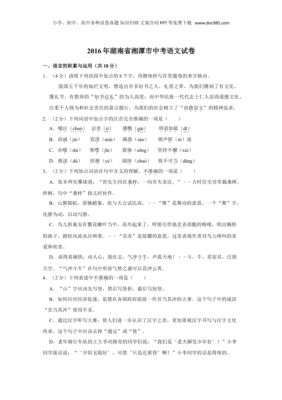 小学、初中、高中各种试卷真题知识归纳文案合同PPT等免费下载www.doc985.com2016年湖南省湘潭市中考语文试卷一、语言的积累与运用(共18分)1.(4分)请将下列语段中加点的8个字,用楷体抄写在答题卷的米字格内。我国五千年的灿烂文明,塑造出许多好书之人,礼贤之辈,为我们镌刻了有文化、懂礼节、有教养的“知书达礼”的为人高度;而中华民族一代代志士仁人崇尚道德文化,注重个人修为和社会责任的嘉言懿行,为我们的社会树立了“尚德崇文”的精神追求。2.(2分)下列词语中加点字的注音完全准确的一项是()A.啜泣(chuò)诘责(jí)感慨(gài)周道如砥(dǐ)B.训诫(jiè)荒谬(miù)确凿(záo)销声匿(nì)迹C.吞噬(shí)寒噤(jīn)震悚(sǒng)坚持不懈(xiè)D.亵渎(dù)扶掖(yè)阔绰(chuò)锐不可当(dǎng)3.(2分)下列加点词语在句中含义的理解,不准确的一项是()A.张乡绅先攀谈道:“世先生同在桑梓,一向有失亲近。”﹣﹣古时住宅旁常栽桑树、梓树,句中“桑梓”指儿时伙伴。B.山舞银蛇,原驰蜡象,欲与天公试比高。﹣﹣“舞”是舞动的意思。一个“舞”字,化静为动,以动写静。C.鸟儿将巢安在繁花嫩叶当中,高兴起来了,呼朋引伴地卖弄清脆的喉咙,唱出婉转的曲子,跟轻风流水应和着。﹣﹣“卖弄”是炫耀的意思,这里表现作者对鸟儿啼叫的喜爱和欣赏。D.说得真痛快,动人心,鼓壮志,气冲斗牛,声震天地!﹣﹣斗,牛,星宿名,泛指天空。“气冲斗牛”在句中形容气势之盛可以直冲云霄。4.(2分)下列表述中不准确的一项是()A.“山”字应该先写竖,然后写竖折,最后写短竖。B.如何应对经济低迷,是摆在各国政府面前一件首当其冲的大事。这个句子中的成语“首当其冲”使用不妥。C.通过汉字听写大赛,使人们进一步认识了汉字之美,更加重视汉字书写与汉字文化传承。这个句子中应该去掉“通过”或“使”。D.老年骑行车队的王大爷对路旁的同学们说:“我们是‘老夫聊发少年狂’!”小李同学接话说:“‘夕阳无限好’,可惜‘只是近黄昏’啊!”小李同学的话是得体的。小学、初中、高中各种试卷真题知识归纳文案合同PPT等免费下载www.doc985.com二、填空题(共1小题,每小题8分,满分8分)5.(8分)默写填空(1)且壮士不死即已,死即举大名耳,!(《陈涉世家》)(2),水中藻、荇交横,盖竹柏影也。(《记承天寺夜游》)(3)为什么我的眼里常含泪水?……(《我爱这土地》)(4),随风直到夜郎西。(《闻王昌龄左迁龙标遥有此寄》)(5),直挂云帆济沧海。(《行路难》)(6)大漠孤烟直,。(《使至塞上》)(7)初夏的湘江,江水上涨,江面变得开阔,一叶小舟,驶向远方。此番景象,不由使人想起王湾《次北固山下》一诗中“,”描绘的景象。二、综合性学习(共14分)6.(4分)仔细观察右边的漫画,按要求答题。(1)画面上为什么设计一只头上标示“2016”字样的猴的形象?(2)这幅漫画的寓意是什么?7.(10分)有一天,你带来了一幅书法作品的图片(如图所示),与同班同学小军、小文和小山等几个同学一起,展开了讨论。(1)热爱书法的小文一下就看出来了,形式上,这幅作品是一副对联。小文认出上联是“世上疮痍诗中圣哲”。下联的后四个字是“笔底波澜”,前四个字是什么呢?你补充道:“是‘’。”(2)上联题写了“工部草堂补壁”字样。联系对联的内容,你们断定对联是歌颂唐代诗人的。小军补充道:“‘补壁’是书画作者把作品赠人时候的谦词,意思是水平拙劣,不足登大雅之堂,就权且给你糊墙吧。我们生活中也常会用到这样的谦词,例如谦称自己的家为‘’;用自己的看法引出别人意见,说是‘’。”(3)小军问大家:“下联中‘波澜’两字又怎么理解呢?”你说:“回顾一下咱们学过的这位大诗人的作品就知道,这‘波澜’可以这样理解,。”小学、初中、高中各种试卷真题知识归纳文案合同PPT等免费下载www.doc985.com(4)小山又提出了一个问题:“上联中的‘诗中’两字换成‘文章’,会不会更好?”小文从两个方面解释了不能更换的理由:“”。三、阅读课文选段,按要求答题.(16分)8.(6分)阅读课文选段...