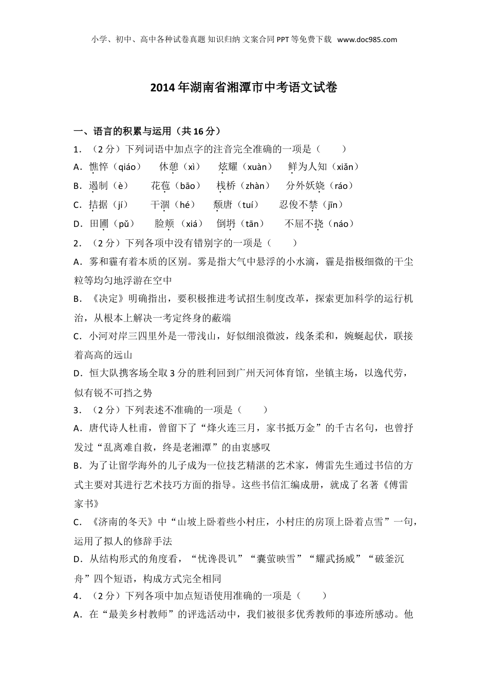 小学、初中、高中各种试卷真题知识归纳文案合同PPT等免费下载www.doc985.com2014年湖南省湘潭市中考语文试卷一、语言的积累与运用(共16分)1.(2分)下列词语中加点字的注音完全准确的一项是()A.憔悴(qiáo)休憩(xì)炫耀(xuàn)鲜为人知(xiǎn)B.遏制(è)花苞(bāo)栈桥(zhàn)分外妖娆(ráo)C.拮据(jí)干涸(hé)颓唐(tuí)忍俊不禁(jīn)D.田圃(pǔ)脸颊(xiá)倒坍(tān)不屈不挠(náo)2.(2分)下列各项中没有错别字的一项是()A.雾和霾有着本质的区别。雾是指大气中悬浮的小水滴,霾是指极细微的干尘粒等均匀地浮游在空中B.《决定》明确指出,要积极推进考试招生制度改革,探索更加科学的运行机治,从根本上解决一考定终身的蔽端C.小河对岸三四里外是一带浅山,好似细浪微波,线条柔和,婉蜒起伏,联接着高高的远山D.恒大队携客场全取3分的胜利回到广州天河体育馆,坐镇主场,以逸代劳,似有锐不可挡之势3.(2分)下列表述不准确的一项是()A.唐代诗人杜甫,曾留下了“烽火连三月,家书抵万金”的千古名句,也曾抒发过“乱离难自救,终是老湘潭”的由衷感叹B.为了让留学海外的儿子成为一位技艺精湛的艺术家,傅雷先生通过书信的方式主要对其进行艺术技巧方面的指导。这些书信汇编成册,就成了名著《傅雷家书》C.《济南的冬天》中“山坡上卧着些小村庄,小村庄的房顶上卧着点雪”一句,运用了拟人的修辞手法D.从结构形式的角度看,“忧谗畏讥”“囊萤映雪”“耀武扬威”“破釜沉舟”四个短语,构成方式完全相同4.(2分)下列各项中加点短语使用准确的一项是()A.在“最美乡村教师”的评选活动中,我们被很多优秀教师的事迹所感动。他小学、初中、高中各种试卷真题知识归纳文案合同PPT等免费下载www.doc985.com们几十年扎根山寨乡村,为了那里的孩子,有的老师奉献了自己的全部,鞠躬尽瘁,马革裹尸,无怨无悔B.某餐馆老板准备在门口贴一副对仗工整的对联。上联想好了:盘中餐粒粒皆辛苦弃之可惜;下联还只有后面四个字“量力而行”,想请隔壁的你帮忙补全下联前八个字。你给老板的答案是:一杯酒口口香又甜C.晚餐后,一家人就各忙各的了:爸爸打开了电脑,妈妈在追那部让她魂牵梦绕的连续剧,我则来到了自己那个小书房,按亮了台灯,打开了作业本。我们各得其所,互不干扰D.执著的故事不老﹣﹣愚公移山,夸父逐日,精卫填海;执著的人物不朽﹣﹣闻鸡起舞的祖逖,悬梁刺股的勾践。执著是坚持不懈,是锲而不舍,是一支永无休止符的进行曲5.(8分)默写填空。①曾子曰:“吾日三省吾身:??传不习乎?”(《论语》)②?。不知天上宫阙,今夕是何年。(《水调歌头》)③而或,皓月千里,浮光跃金,静影沉璧,,此乐何极!(《岳阳楼记》)④面对历史,安倍一心想为日本“松绑”,崇尚强权与武力,但恰恰忘记了最简单的也是被历史无数次验证的一点:“,失道者寡助。寡助之至,亲戚畔之。多助之至,天下顺之。”⑤李清照《醉花阴》一词的末尾,以“莫道不消魂,帘卷西风”渲染环境气氛,结句“”以花喻人,既见其形,又传其神,以其写相思之情,不露,不俗,含蓄蕴藉,精当无比。二、综合性学习(共16分)6.(4分)阅读下面材料,回答后面的问题。【材料一】礼、义、廉、耻,被称为“国之四维”,在中华民族传统文化中占有重要的地位。小学、初中、高中各种试卷真题知识归纳文案合同PPT等免费下载www.doc985.com【材料二】《水浒传》中杨志押送的“生辰纲”,被认为是“不义之财”。吴用等好汉仗义疏财,劫富济贫,设计智取了“生辰纲”,历来为人所称道。【材料三】“宝贝回家”志愿者协会,帮助很多家庭找到了失踪、流浪的孩子。那些志愿者的努力和付出,被人们称为“义举”。【材料四】今年局部地区遭受罕见洪灾,目前各灾区正在紧张地恢复重建。而一些不法厂商却见利忘义,借灾敛财,乘机囤积居奇,哄抬物价,造成建材价格一路疯涨。【材料五】《论语》有:“子曰:‘不义而富且贵,于我如浮云。’”《孟子》云:“生,亦我所欲也;义,亦我所欲也。二者不可得兼,舍生而取义者也。”(1)阅读上述材料,说说你...