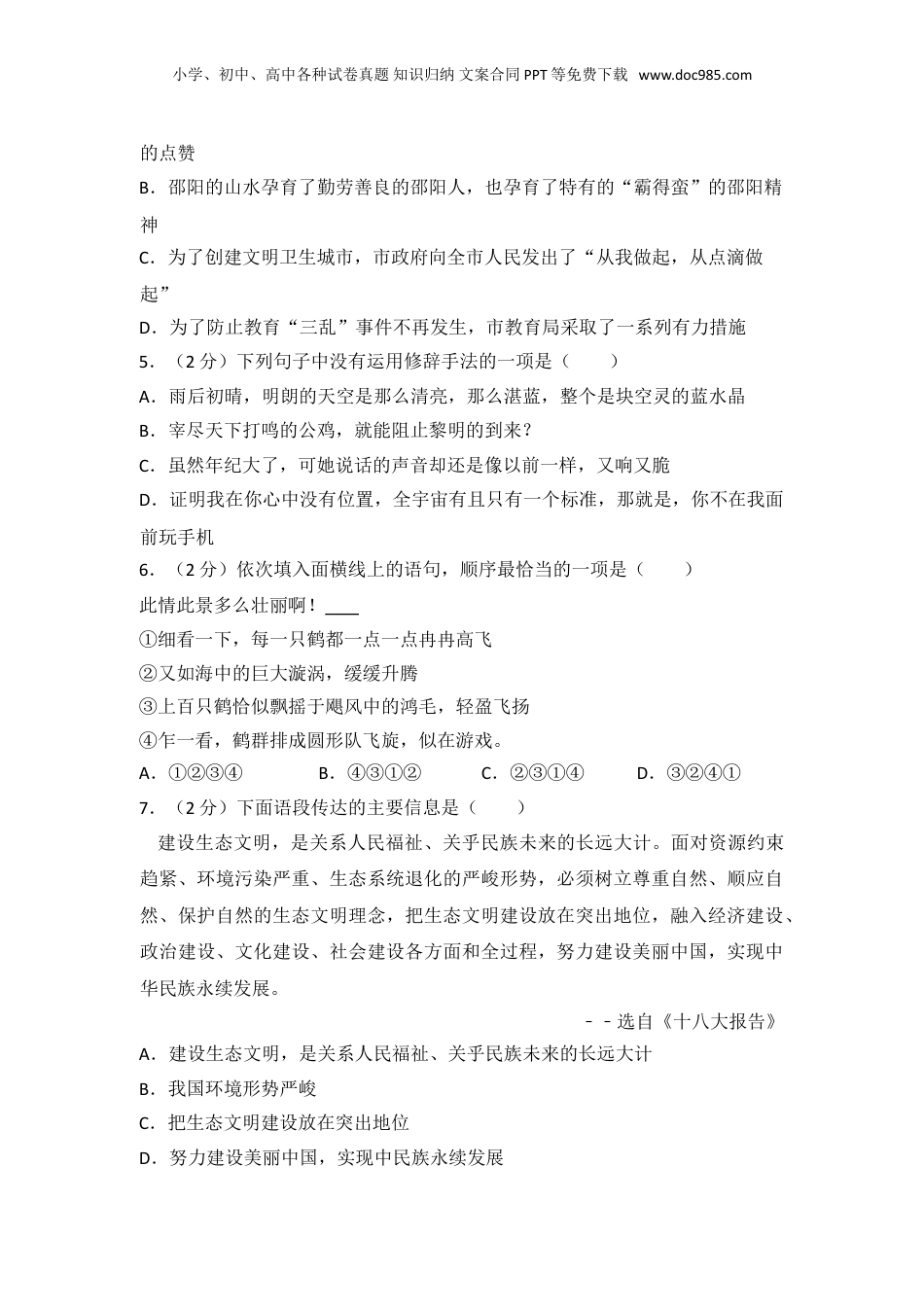 小学、初中、高中各种试卷真题知识归纳文案合同PPT等免费下载www.doc985.com2014年湖南省邵阳市中考语文试卷一、选择题(每小题0分,共24分)1.(2分)所有的波斓壮阔都会化为细波,所有的锣鼓欢鸣都会归于岑寂,热血沸腾的青春带着它浩浩dàngdàng的气势一路走远,只留下平庸生活里难以消解的冗繁、干枯、琐碎、躁热。但我仍然想找回青春那gǔgǔ流动的热血,去和曲折命运勇敢单挑。根据拼音写汉字,给加点字注音,完全正确的一项是()A.汤汤汩汩céngrǒngB.荡荡股股cénchénC.汤汤股股cénchénD.荡荡汩汩cénrǒng2.(2分)所有的波斓壮阔都会化为细波,所有的锣鼓欢鸣都会归于岑寂,热血沸腾的青春带着它浩浩dàngdàng的气势一路走远,只留下平庸生活里难以消解的冗繁、干枯、琐碎、躁热。但我仍然想找回青春那gǔgǔ流动的热血,去和曲折命运勇敢单挑。文中有两处错别字,以下更正完全正确的一项是()A.“波斓”改为“波澜”;“躁热”改为“燥热”B.“波斓”改为“波澜”;“琐碎”改为“锁碎”C.“沸腾”改为“沸滕”;“躁热”改为“燥热”D.“琐碎”改为“锁碎”;“沸腾”改为“沸滕”3.(2分)下列句子中加点成语使用不当的一项是()A.经过几年锲而不舍的努力,广州恒大队终于实现了中国足球顶级联赛“三连冠”的梦想B.网传天燃气要涨价,争先恐后前往燃气公司购气的市民济济一堂C.马航失联事件的发生,尽管马来政府一再解释,但仍然难辞其咎D.日本在亚信峰会上的发言与其实际行为大相径庭4.(2分)下列句子中没有语病的一项是()A.在《出彩中国人》栏目中,让人眼花缭乱的歌声和绚丽的舞台赢得广大观众小学、初中、高中各种试卷真题知识归纳文案合同PPT等免费下载www.doc985.com的点赞B.邵阳的山水孕育了勤劳善良的邵阳人,也孕育了特有的“霸得蛮”的邵阳精神C.为了创建文明卫生城市,市政府向全市人民发出了“从我做起,从点滴做起”D.为了防止教育“三乱”事件不再发生,市教育局采取了一系列有力措施5.(2分)下列句子中没有运用修辞手法的一项是()A.雨后初晴,明朗的天空是那么清亮,那么湛蓝,整个是块空灵的蓝水晶B.宰尽天下打鸣的公鸡,就能阻止黎明的到来?C.虽然年纪大了,可她说话的声音却还是像以前一样,又响又脆D.证明我在你心中没有位置,全宇宙有且只有一个标准,那就是,你不在我面前玩手机6.(2分)依次填入面横线上的语句,顺序最恰当的一项是()此情此景多么壮丽啊!①细看一下,每一只鹤都一点一点冉冉高飞②又如海中的巨大漩涡,缓缓升腾③上百只鹤恰似飘摇于飓风中的鸿毛,轻盈飞扬④乍一看,鹤群排成圆形队飞旋,似在游戏。A.①②③④B.④③①②C.②③①④D.③②④①7.(2分)下面语段传达的主要信息是()建设生态文明,是关系人民福祉、关乎民族未来的长远大计。面对资源约束趋紧、环境污染严重、生态系统退化的严峻形势,必须树立尊重自然、顺应自然、保护自然的生态文明理念,把生态文明建设放在突出地位,融入经济建设、政治建设、文化建设、社会建设各方面和全过程,努力建设美丽中国,实现中华民族永续发展。﹣﹣选自《十八大报告》A.建设生态文明,是关系人民福祉、关乎民族未来的长远大计B.我国环境形势严峻C.把生态文明建设放在突出地位D.努力建设美丽中国,实现中民族永续发展小学、初中、高中各种试卷真题知识归纳文案合同PPT等免费下载www.doc985.com二、解答题(共1小题,满分16分)8.(16分)阅读下面的选文,完成下列各题。【甲】予观夫巴陵胜状,在洞庭一湖。衔远山,吞长江,浩浩汤汤,横无际涯;朝晖夕阴,气象万千。此则岳阳楼之大观也。前人之述备矣。然则北通巫峡,南极潇湘,迁客骚人,多会于此。览物之情,得无异乎?若夫霪雨霏霏,连月不开,阴风怒号,浊浪排空;日星隐耀,山岳潜形;商旅不行,樯倾楫摧;薄暮冥冥,虎啸猿啼。登斯楼也,则有去国怀乡,忧谗畏讥,满目萧然,感极而悲者矣。至若春和景明,波澜不惊,上下天光,一碧万顷;沙鸥翔集,锦鳞游泳;岸芷汀兰,郁郁青青。而或长烟一空,皓月千里,浮光跃金,静影沉璧,渔歌互答,此乐何极!登斯楼也,则有...