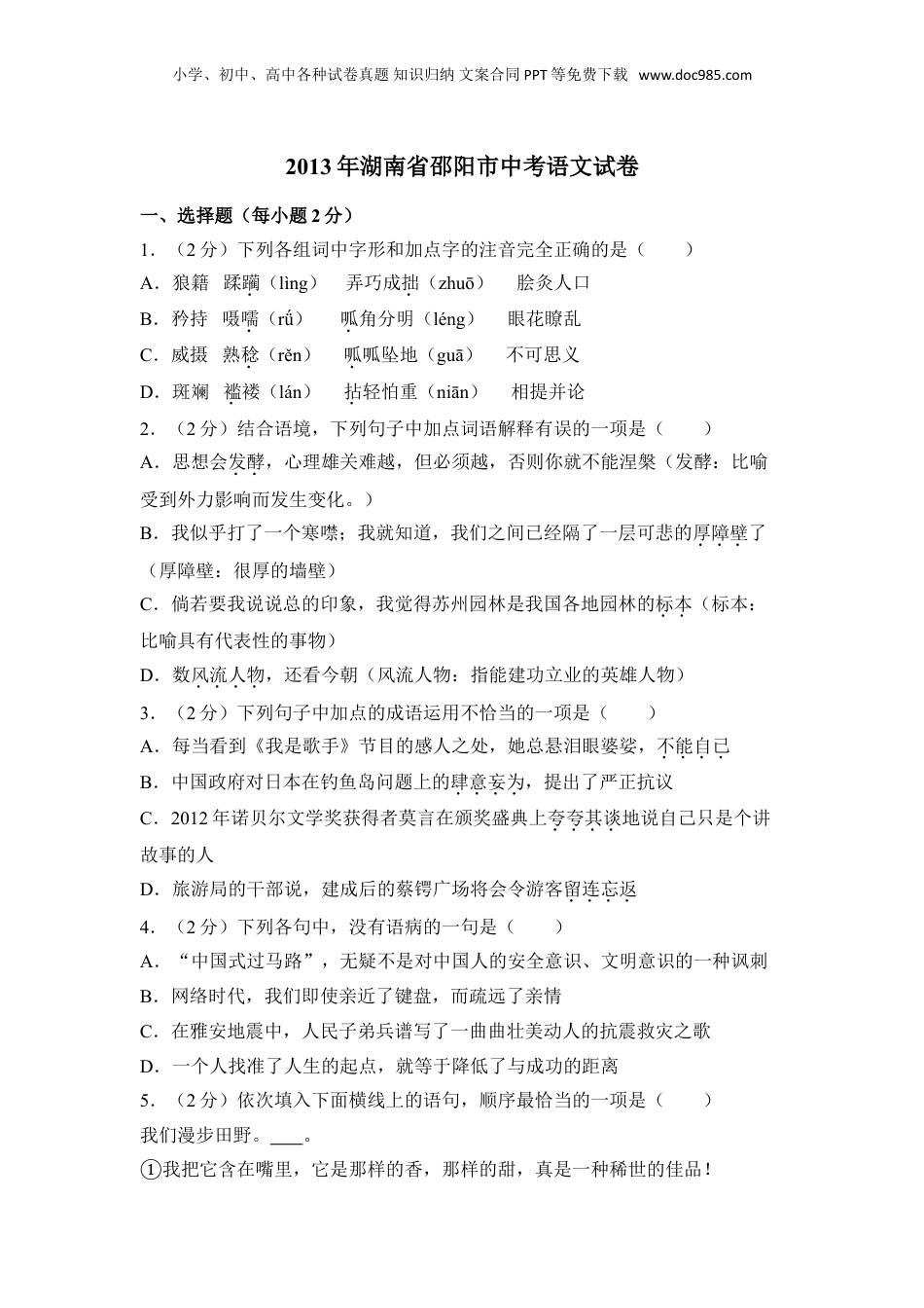 小学、初中、高中各种试卷真题知识归纳文案合同PPT等免费下载www.doc985.com2013年湖南省邵阳市中考语文试卷一、选择题(每小题2分)1.(2分)下列各组词中字形和加点字的注音完全正确的是()A.狼籍蹂躏(lìng)弄巧成拙(zhuō)脍灸人口B.矜持嗫嚅(rǘ)呱角分明(léng)眼花瞭乱C.威摄熟稔(rěn)呱呱坠地(guā)不可思义D.斑斓褴褛(lán)拈轻怕重(niān)相提并论2.(2分)结合语境,下列句子中加点词语解释有误的一项是()A.思想会发酵,心理雄关难越,但必须越,否则你就不能涅槃(发酵:比喻受到外力影响而发生变化。)B.我似乎打了一个寒噤;我就知道,我们之间已经隔了一层可悲的厚障壁了(厚障壁:很厚的墙壁)C.倘若要我说说总的印象,我觉得苏州园林是我国各地园林的标本(标本:比喻具有代表性的事物)D.数风流人物,还看今朝(风流人物:指能建功立业的英雄人物)3.(2分)下列句子中加点的成语运用不恰当的一项是()A.每当看到《我是歌手》节目的感人之处,她总悬泪眼婆娑,不能自已B.中国政府对日本在钓鱼岛问题上的肆意妄为,提出了严正抗议C.2012年诺贝尔文学奖获得者莫言在颁奖盛典上夸夸其谈地说自己只是个讲故事的人D.旅游局的干部说,建成后的蔡锷广场将会令游客留连忘返4.(2分)下列各句中,没有语病的一句是()A.“中国式过马路”,无疑不是对中国人的安全意识、文明意识的一种讽刺B.网络时代,我们即使亲近了键盘,而疏远了亲情C.在雅安地震中,人民子弟兵谱写了一曲曲壮美动人的抗震救灾之歌D.一个人找准了人生的起点,就等于降低了与成功的距离5.(2分)依次填入下面横线上的语句,顺序最恰当的一项是()我们漫步田野。。①我把它含在嘴里,它是那样的香,那样的甜,真是一种稀世的佳品!小学、初中、高中各种试卷真题知识归纳文案合同PPT等免费下载www.doc985.com②在林间草地上我意外地发现了一颗晚熟的硕大的草莓。③这香甜把我的思绪引向了六月,那是草莓最盛的时光。④它那沁人心脾的气味,在我的嘴角唇边久久地不曾消逝。A.④②①③B.①③②④C.③④②①D.②①④③6.(2分)下列文学文化常识的表述有误的一项是()A.李清照是宋代著名女词人,号易安居士,婉约派的代表人物之一B.表,古代一种文体,是臣下给皇帝的奏章;铭,古代刻在器物上用来警戒自己或者称述功德的文字,后来成为一种文体C.近体诗分为律诗和绝句。律诗分四联,依次是首联、颈联、颔联、尾联D.汉语中常用“桑梓”指代故乡,“烽烟”指代战争,“桃李”指代学生,“手足”指代兄弟7.(2分)口语交际。近年来,校园安全事故频发。父母经常给在外求学的小亮打电话,反复叮嘱他注意安全。下列回复最得体的一项是()A.放心,我死不了,别总是杞人忧天B.怎么这么啰嗦啊?我不是活得好好的吗?C.你们放心,我会时刻注意安全的D.死有什么可怕的?那是每个人最后的归宿二、解答题(共1小题,满分16分)8.(16分)阅读下面的选文,完成各题。【甲】至于负者歌于途,行者休于树,前者呼,后者应,伛偻提携,往来而不绝者,滁人游也。临溪而渔,溪深而鱼肥,酿泉为酒,泉香而酒洌,山肴野蔌,杂然而前陈者,太守宴也。宴酣之乐,非丝非竹,射者中,弈者胜,觥筹交错,起坐而喧哗者,众宾欢也。苍颜白发,颓然乎其间者,太守醉也。已而夕阳在山,人影散乱,太守归而宾客从也。树林阴翳,鸣声上下,游入去而禽鸟乐也。然而禽鸟知山林之乐,而不知人之乐;人知从太守游而乐,而不知太守之乐其乐也。醉能同其乐,醒能述以文者,太守也。太守谓谁?庐陵欧阳修也。﹣﹣节选自欧阳修《醉翁亭记》【乙】小学、初中、高中各种试卷真题知识归纳文案合同PPT等免费下载www.doc985.com中岁颇好道,晚家南山陲。兴来每独往,胜事空自知。行到水穷处,坐看云起时。偶然值林叟,谈笑无还期。﹣﹣王维《终南别业》(1)下列加点词语解释有误的一项是。A.杂然而前陈者(杂然:杂乱的样子)B.而不知太守之乐其乐也(乐:以……为乐)C.胜事空自知(空:没有)D.偶然值林叟(值:遇到)(2)下列句子朗读停顿正确的一项是。A.至于负/者歌/于途B.然而/...