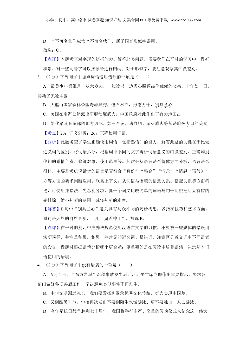小学、初中、高中各种试卷真题知识归纳文案合同PPT等免费下载www.doc985.com2015年湖南省娄底市中考语文试卷(教师版)一、语言积累与运用(30分)1.(2分)下列词语中加点字注音完全正确的一项是()A.恫吓(dòng)熟稔(rěn)拈轻怕重(zhān)B.纶巾(guān)隘口(yì)锲而不舍(qiè)C.荤菜(yūn)蓦地(mò)义愤填膺(yīng)D.虬枝(qiú)濡湿(rú)唾手可得(tuò)【考点】13:注音.菁优网版权所有【分析】此题考查学生对字音的把握,解答此题的关键是平时要使用普通话,遇到不会读的或拿不准的要勤查字典,特别注意易错字的积累与整理。对一些形声字、形近字、多音字要注意准确辨析。【解答】A.“拈轻怕重”的“拈”应读:niān;B.“隘口”的“隘”应读:ài;C.“荤菜”的“荤”应读:hūn;D.正确;故选:D。【点评】平时遇到不会读的字,一定不要轻易放过,对于自己容易出错的字音要努力识记。2.(2分)下列词语中没有错别字的一项是()A.憧憬劳碌引经据典人情事故B.陆离班斓养尊处优劫后余生C.陈迹无端精兵简政鸡犬不宁D.妖娆叱骂不可名壮怀古伤今【考点】14:常见易错字.菁优网版权所有【分析】本题要结合字形知识来分析。在我们平时的学习中,要注意根据同音字的读音进行归纳,对于形似字的特点进行总结。【解答】A.“人情事故”应为“人情世故”,属于同音字误用;B.“班斓”应为“斑斓”,属于同音形似字误用;C.没有错别字;小学、初中、高中各种试卷真题知识归纳文案合同PPT等免费下载www.doc985.comD.“不可名壮”应为“不可名状”,属于同音形似字误用。故选:C。【点评】本题考查对字形的辨析能力。解答此类问题,需要我们在平时的学习中,做好积累。对一些同音字可以按读音进行归纳;对于形似字,要注意观察其细微差别。3.(2分)下列句子中加点词语运用错误的一项是()A.最美少年梁维月,从六岁起,一边读书一边悉心照顾高位截瘫的父亲,十年如一日,感动了无数中国B.大熊山国家森林公园奇峰异秀,怪石林立,形态万千,别具匠心C.美国在南海公然派出军舰炫耀武力,中国政府对此作出了有力地回击D.新化菜具有浓郁的地方风味,如三合汤、猪血粑、柴火腊肉等都是脍炙人口的美食【考点】23:词义辨析;26:正确使用词语.菁优网版权所有【分析】此题考查了学生正确使用词语(包括熟语)的能力。解答此题的关键在于比较近义词的区别,将词语拆分,根据词中不同的文字辨析词语意义的细微差别,正确辨别他们的感情色彩、修饰对象、使用范围等。其次是从语言是否得体方面分析,语言是否得体,主要是考虑说话者的语言是否符合“身份”“场合”“情景”“情感(语气)”方等方面的要求判断选用。联系上下文,从词语与语境的语意关系、搭配关系等方面筛选,可使用排除法,先总观各项,抓一个词义比较简单的词语与句子比照把明显有错的先排除,缩小判断的范围,减轻判断的难度。【解答】B句中“别具匠心”意为具有与众不同的巧妙构思,多指在技巧和艺术方面。原句是天然的自然景观,可用“鬼斧神工”。故选B。【点评】在平时的复习中应养成规范使用汉语言文字的习惯,不要被一些媒体的错误用法所误导,并注重积累。积累一些常见的近义词、易错词,注意区分近义词中不同语素的含义,做题时根据语境分析哪个更合适;更重要的是在阅读中培养语感,注意基本词语使用的语境。4.(2分)下列句子中没有语病的一项是()A.6月1日,“东方之星”沉船事故发生后,习近平主席立即作出重要指示,要求各部门做好各项善后工作,坚决避免类似事件不再发生。B.中华文明源远流长,我们要发扬和继承优秀文化传统,努力实现中国梦。C.又到酷暑时节,学校再次发出不要到陌生水域游泳、更不要独自一人去游泳。D.今年是抗日战争胜利七十周年,我国将举行庄严、隆重的阅兵仪式来纪念这一伟大小学、初中、高中各种试卷真题知识归纳文案合同PPT等免费下载www.doc985.com的历史事件。【考点】79:病句辨析与修改.菁优网版权所有【分析】本题考查对字音、字形的辨析能力。解答此类问题,需要我们在平时的学习中,做好积累。对一些多音字读音要结合语境...