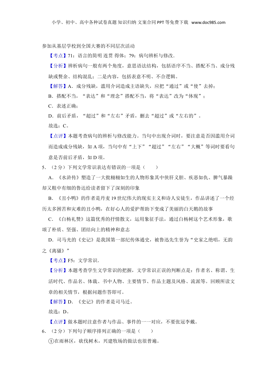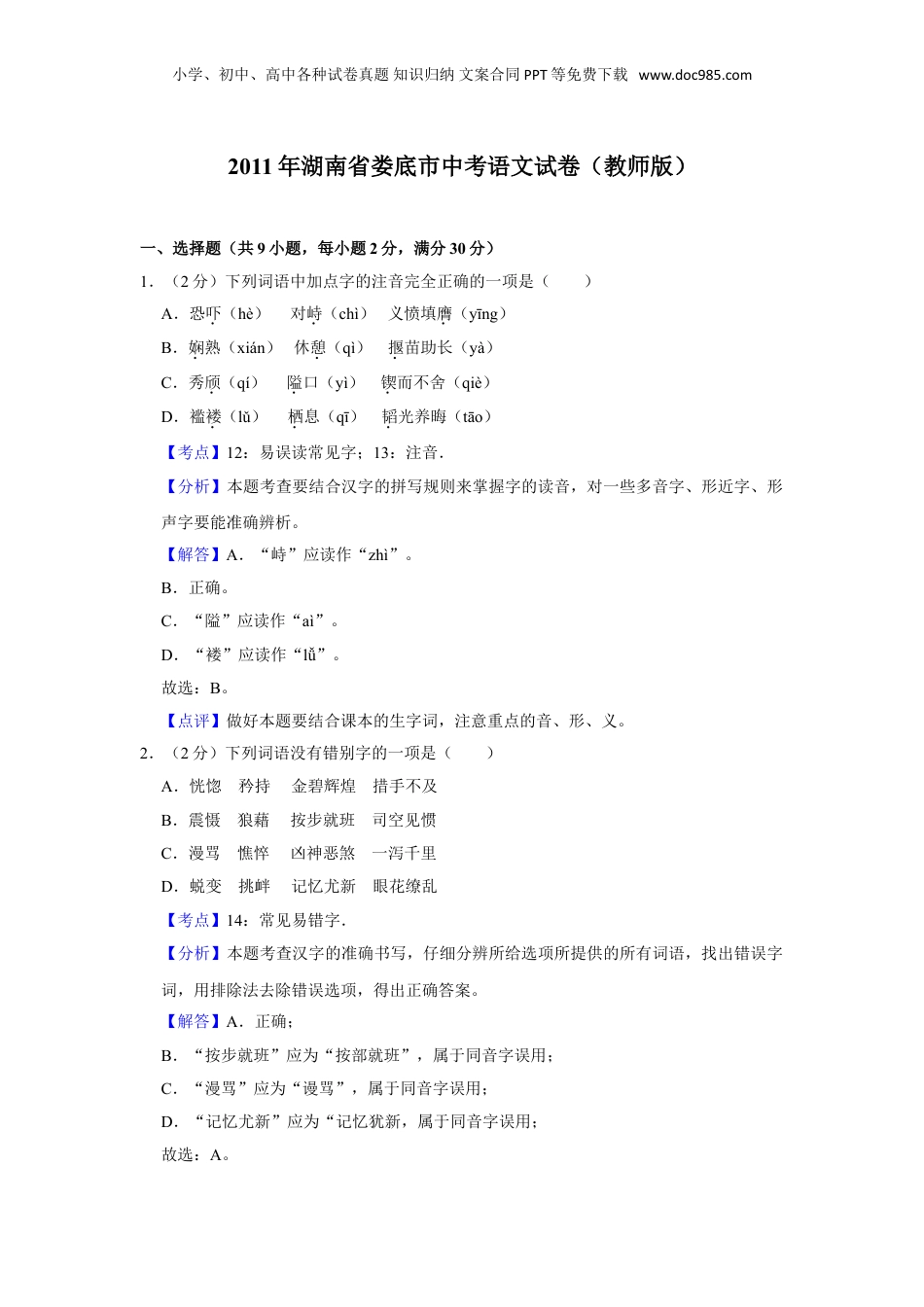 小学、初中、高中各种试卷真题知识归纳文案合同PPT等免费下载www.doc985.com2011年湖南省娄底市中考语文试卷(教师版)一、选择题(共9小题,每小题2分,满分30分)1.(2分)下列词语中加点字的注音完全正确的一项是()A.恐吓(hè)对峙(chì)义愤填膺(yīng)B.娴熟(xián)休憩(qì)揠苗助长(yà)C.秀颀(qí)隘口(yì)锲而不舍(qiè)D.褴褛(lǔ)栖息(qī)韬光养晦(tāo)【考点】12:易误读常见字;13:注音.菁优网版权所有【分析】本题考查要结合汉字的拼写规则来掌握字的读音,对一些多音字、形近字、形声字要能准确辨析。【解答】A.“峙”应读作“zhì”。B.正确。C.“隘”应读作“aì”。D.“褛”应读作“lǚ”。故选:B。【点评】做好本题要结合课本的生字词,注意重点的音、形、义。2.(2分)下列词语没有错别字的一项是()A.恍惚矜持金碧辉煌措手不及B.震慑狼藉按步就班司空见惯C.漫骂憔悴凶神恶煞一泻千里D.蜕变挑衅记忆尤新眼花缭乱【考点】14:常见易错字.菁优网版权所有【分析】本题考查汉字的准确书写,仔细分辨所给选项所提供的所有词语,找出错误字词,用排除法去除错误选项,得出正确答案。【解答】A.正确;B.“按步就班”应为“按部就班”,属于同音字误用;C.“漫骂”应为“谩骂”,属于同音字误用;D.“记忆尤新”应为“记忆犹新,属于同音字误用;故选:A。小学、初中、高中各种试卷真题知识归纳文案合同PPT等免费下载www.doc985.com【点评】本题考查学生对汉字字形的书写能力。解答此类题目,需要我们在平时的学习中做好积累,注意对形似字、生僻字的写法,做到书写规范,不出错别字。3.(2分)下列句子中加点的成语运用错误的一项是()A.《闪闪的红星》是一部优秀的儿童影片,上世纪七十年代至今一直脍炙人口,深受广大人民群众的喜爱B.两岸实现“三通”以来,去台湾和大陆观光旅客滔滔不绝,呈现出“两岸一家亲”的交往热潮C.今年上半年长江中下游出现60年罕见旱情,湖泊干枯、河流断流、农田开裂,灾区人民心急如焚D.骇人听闻的药家鑫故意杀人案引起社会各界的广泛关注,它警示我们要切实加强对青少年道德和法律的教育【考点】26:正确使用词语;49:成语.菁优网版权所有【分析】本题要结合积累的成语来分析。在平时的学习中,我们对于遇到的成语要做好积累,可以从词意、感情色彩和习惯用法等方面进行归纳。【解答】A.“脍炙人口”指美味人人爱吃。比喻好的诗文受到人们和称赞和传讼。该成语运用恰当;B.“滔滔不绝”指说话连续不断。该成语理解错误;C.“心急如焚”形容非常着急。该成语运用恰当;D.“骇人听闻”使人听了非常吃惊、害怕。该成语运用恰当。故选:B。【点评】本题考查对成语的运用能力。解答此类问题,需要我们正确理解成语的意思,辨清成语的感情色彩,还要结合语境分析其运用是否恰当。4.(2分)下列句子没有语病的一项是()A.通过今年食盐抢购事件,使我们看到了我们国国民的心理承受能力和科普常识都有待提高B.中国撤离在利比亚的公民行动,表达了党和政府坚持“立党为公,执政为民”和“外交为民”的理念C.在今年的全国两会上,许多代表指出:环境污染、交通拥堵、发展成本过高,已成为城市发展必须面对的重大课题D.全国青少年科技创新大赛具有广泛的活动基础,每年有超过1000万名左右的前少年小学、初中、高中各种试卷真题知识归纳文案合同PPT等免费下载www.doc985.com参加从基层学校到全国大赛的不同层次活动【考点】71:语言的简明连贯得体;79:病句辨析与修改.菁优网版权所有【分析】辨析病句一般有两个角度,意思语法结构,包括语序不当、搭配不当、成分残缺或赘余、结构混乱;二是内容,包括表意不明、不合逻辑。【解答】A.成分残缺,滥用介词造成主语缺失,应把“通过”或“使”去掉;B.搭配不当,“表达”和“理念”搭配不当,将“表达”改为“体现”;C.表述正确;D.前后矛盾,“超过”和“左右”矛盾,删去“超过”或“左右的”。故选:C。【点评】本题考查病句的辨析与修改能力。当句中出现介词时,要注意是否因滥用介词而造成成分残缺,如A项,当句...