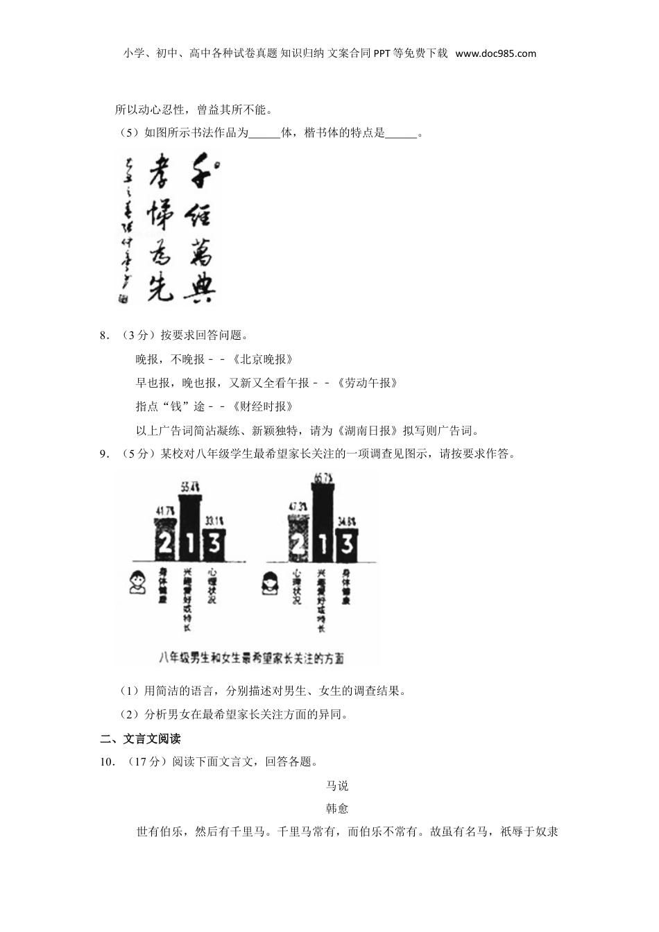 小学、初中、高中各种试卷真题知识归纳文案合同PPT等免费下载www.doc985.com2019年湖南省娄底市中考语文试卷一、语言积累与还用1.(2分)下列词语中,字音字形完全正确的一项是()A.秀颀(qí)言讫(qǐ)鸿篇巨制笑容可拘B.吞噬(shì)愧怍(zhà)兵慌马乱略胜一筹C.恻隐(cè)酝酿(niàng)不言而喻大庭广众D.拾级(shí)慰藉(jiè)鸦雀无声言简意赅2.(2分)下列各句中,加点成语使用不恰当的一项是()A.在全市开展的扫黑除恶整治工作中,劫后余生的“村霸”刘某痛改前非,成了全村最热心的保洁员。B.美国政府为了遏制中国的崛起,先是孟晚舟事件,然后介入安卓系统与华为的合作,真可谓是煞费苦心。C.为了促进当地经济发展,娄底市政府因地制宜,大力打造旅游业,吸引了众多前客驻足观赏。D.实现大数据、人工智能等先进技术与教育的深度融合,对每一个教育工作者来说任重道远。3.(2分)下列各句中,没有语病的一项是()A.如期打赢脱贫攻坚战,是当前最紧要的民生工作,也是目前在中部地区崛起中实现湖南高质量发展的当务之急。B.在纪念“五四”运动100周年大会上,习总书记提出,我们要主动走近青年、倾听青年,做青年朋友的知心人。C.教育部在做出这项战略部署时,特别强调职业院校要加强对此项工作的引导,避免不再出现片面的“考证热”。D.好的演讲材料不是抄来的,而是演讲者对事实、数据等进行认真研究、整理、搜集的结果。4.(2分)下列文学常识的表述,不正确的一项是()A.新闻报道的特点是内容真实、时效性强、语言简明,分消息、通讯、特写等类型,《别了,“不列颠尼亚”》是一篇通讯。B.明代宋濂的《送东阳马生序》,以自己年轻时求学的艰辛告诫年轻人要刻苦学习,小学、初中、高中各种试卷真题知识归纳文案合同PPT等免费下载www.doc985.com至今仍有很强的教育意义。C.《平凡的世界》展现了黄土高原古朴的民风、独特的习俗,表现了主人公淳厚朴实的品质、坚定的人生目标和坚韧不拔的奋斗精神。D.英国女作家、教育家海伦•凯勒在《我的老师》中,真实记叙了莎利文老师耐心教育“我”并使“我”成长进步的感人事迹。5.(2分)下列各句中,标点符号使用不正确的一项是()A.出生于贫困家庭的保尔•柯察念,特别喜欢读《牛虻》《斯巴达克斯》等作品,经常给战友们朗读或讲故事。B.我梦见了那条熟悉的大街,像我当时一样大小的孩子们,在街上奔、嬉闹,他们的笑脸显得格外好看……C.“新一代人工智能技术与5G网络的结合,会让以前觉得难以实现的事情变得简单。”史广顺说:“这将催生更名创新运用及业态。”D.善于学习,就能收到事半功倍之效;不善于学习,其结果或者事倍功半,或者劳而无功,甚至会适得其反。6.(2分)将①﹣⑥句连缀成语意连贯的一段话,排序正确的一项是()①像文韬武略的辛弃疾沦为田舍菜翁,把一腔孤愤化为词间沟壑,青史留名。②苦而不言不是什么亏都吃下去,而是少抱怨,因为所有的苦难还得自己去解决。③喜而不语是不炫耀,不能为了白己高兴而让别人不快乐。④苦而不言,喜而不语,是一种人生智慧。⑤像炎樱常在经济困难的好友张爱玲面前大谈投资理财,最后两人感情淡漠。A.②⑤③①④B.④②①③⑤C.⑤①④②③D.②④③⑤①7.(10分)填空。(1)蒹葭萋萋,。所谓伊人,。(《蒹葭》)(2),寒光照铁衣。将军百战死,。(《木兰诗》)(3)李老从单位退体后,回到家乡为村里的留守儿童办起了图书室,他的这种精神正是“,”的写照。(龚自珍《已亥余诗》)(4)“新时代中国青年处在中华民族发展的最好时期,既面临着难得的建功立业的人生际遇,也面临著‘天将降大任于斯人’的时代使命。”此处用典出自《孟子》,原文是“故天将降大任于是人也,必先,劳其筋骨,饿其体肤,空乏其身,,小学、初中、高中各种试卷真题知识归纳文案合同PPT等免费下载www.doc985.com所以动心忍性,曾益其所不能。(5)如图所示书法作品为体,楷书体的特点是。8.(3分)按要求回答问题。晚报,不晚报﹣﹣《北京晚报》早也报,晚也报,又新又全看午报﹣﹣《劳动午报》指点“钱”途﹣﹣《财经时报》以上广告词简沾凝...
