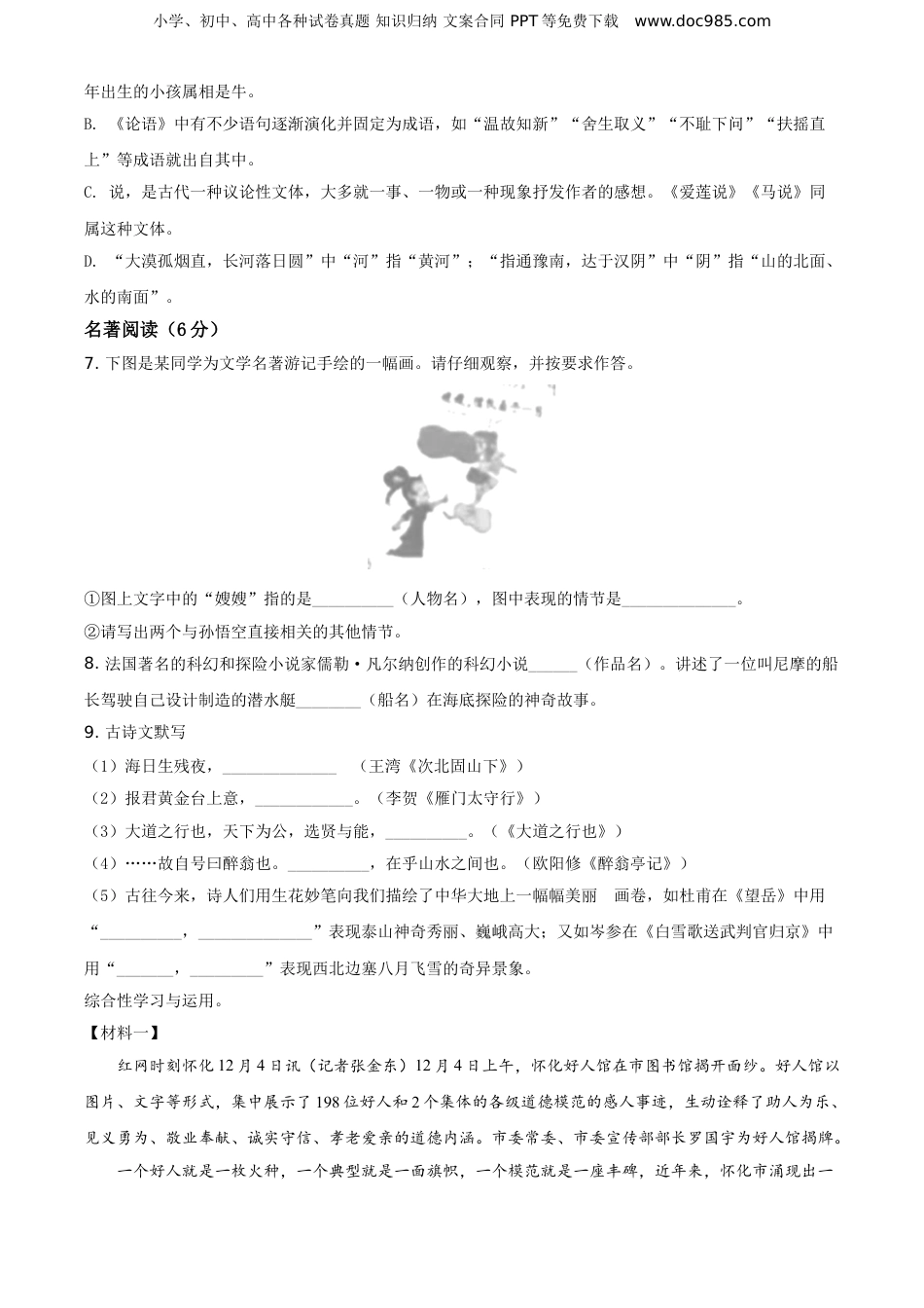 小学、初中、高中各种试卷真题知识归纳文案合同PPT等免费下载www.doc985.com湖南省怀化市2021年中考语文试题一、语言积累与运用(41分,选择题每小题3分)1.请给下列文段中加点的字注音或根据拼音写汉字。“天行健,君子以自强不息。”这句话出自《周易》,意思是天道运行,刚健有力,永无止息,而君子处世,也应该遵xún天道,刚毅坚韧,持之以恒,努力前进,永不懈dài。这是我国传统文化的精髓,也是中华民族生不是的精神源泉之一。(1)遵xún()(2)懈dài()(3)精髓()2.下列句子中加点成语使用不正确的一项是()A.清晨,我站在北京天安门广场上,看着五星旗冉冉升起,一种自豪感便油然而生。B.从砾石堆上四面张望,晶莹连绵的冰峰、平坦辽阔的冰河历历在目。C.在中考励志大会上,校长那充满激情、栩栩如生的演讲让同学们更有信心了。D.工作组成员在“脱贫攻坚战”中直面困难,从不拈轻怕重,为当地老百姓办了许多实事。3.下列句子中没有语病的一项是()A.我省要全面加强森林生态文明建设,提高森林资源开发利用的效率和范围。B.通过“师德师风”主题教育学习,使老师们认识到“不忘教育初心,牢记教育使命”的重要意义。C.有大约800年左右历史的巴黎圣母院突发大火,尖塔倒塌,屋顶烧毁,损失慘重。D.在学习中我们应该注意培养自己提出问题、分析问题、解决问题的能力。4.下列语法分析不正确的一项是()A.“白杨树实在是不平凡的,我赞美白杨树!”这句话中的“白杨树”“平凡”“赞美”三个词的词性分别是名词、形容词、动词。B.“艰苦奋斗”是中华民族的传统美德,是中国共产党人的传家宝。”这句话中划横线的四个短语都是偏正短语。C.“我们学习党史,不仅要感悟思想伟力,更要担当起历史赋予的责任。”这是一个选择复句。D.“吴孟超以高超的医术、高尚的医德,书写了济世苍生的传奇。”这句话的主干是“吴孟超书写传奇”。5.下列句子标点符号使用正确的一项是()A.“哎呀,真是美极了!”皇帝说:“我十二分的满意!”B.没有实力,信心不过是无源之水;没有信心,拼搏只能是无本之木。C.是微信转账?还是支付宝付款?他拿不定主意。D.著名作家、翻译家杨绛先生的代表作有“洗澡”“干校六记”“我们仨”等。6.下列关于文学、文化常识表述不正确的一项是()A.干支纪年即以天干和地支组合纪年。2021年用干支纪年则为辛丑年,丑对应十二生肖的牛,那么这一小学、初中、高中各种试卷真题知识归纳文案合同PPT等免费下载www.doc985.com年出生的小孩属相是牛。B.《论语》中有不少语句逐渐演化并固定为成语,如“温故知新”“舍生取义”“不耻下问”“扶摇直上”等成语就出自其中。C.说,是古代一种议论性文体,大多就一事、一物或一种现象抒发作者的感想。《爱莲说》《马说》同属这种文体。D.“大漠孤烟直,长河落日圆”中“河”指“黄河”;“指通豫南,达于汉阴”中“阴”指“山的北面、水的南面”。名著阅读(6分)7.下图是某同学为文学名著游记手绘的一幅画。请仔细观察,并按要求作答。①图上文字中的“嫂嫂”指的是__________(人物名),图中表现的情节是______________。②请写出两个与孙悟空直接相关的其他情节。8.法国著名的科幻和探险小说家儒勒·凡尔纳创作的科幻小说______(作品名)。讲述了一位叫尼摩的船长驾驶自己设计制造的潜水艇________(船名)在海底探险的神奇故事。9.古诗文默写(1)海日生残夜,______________。(王湾《次北固山下》)(2)报君黄金台上意,____________。(李贺《雁门太守行》)(3)大道之行也,天下为公,选贤与能,__________。(《大道之行也》)(4)……故自号曰醉翁也。__________,在乎山水之间也。(欧阳修《醉翁亭记》)(5)古往今来,诗人们用生花妙笔向我们描绘了中华大地上一幅幅美丽的画卷,如杜甫在《望岳》中用“__________,______________”表现泰山神奇秀丽、巍峨高大;又如岑参在《白雪歌送武判官归京》中用“_______,_________”表现西北边塞八月飞雪的奇异景象。综合性学习与运用。【材料一】红网时刻怀化12月4日讯(记者张金东)12月4日上午,怀化好人馆在市图书馆揭开面纱。好人馆以图片、文...