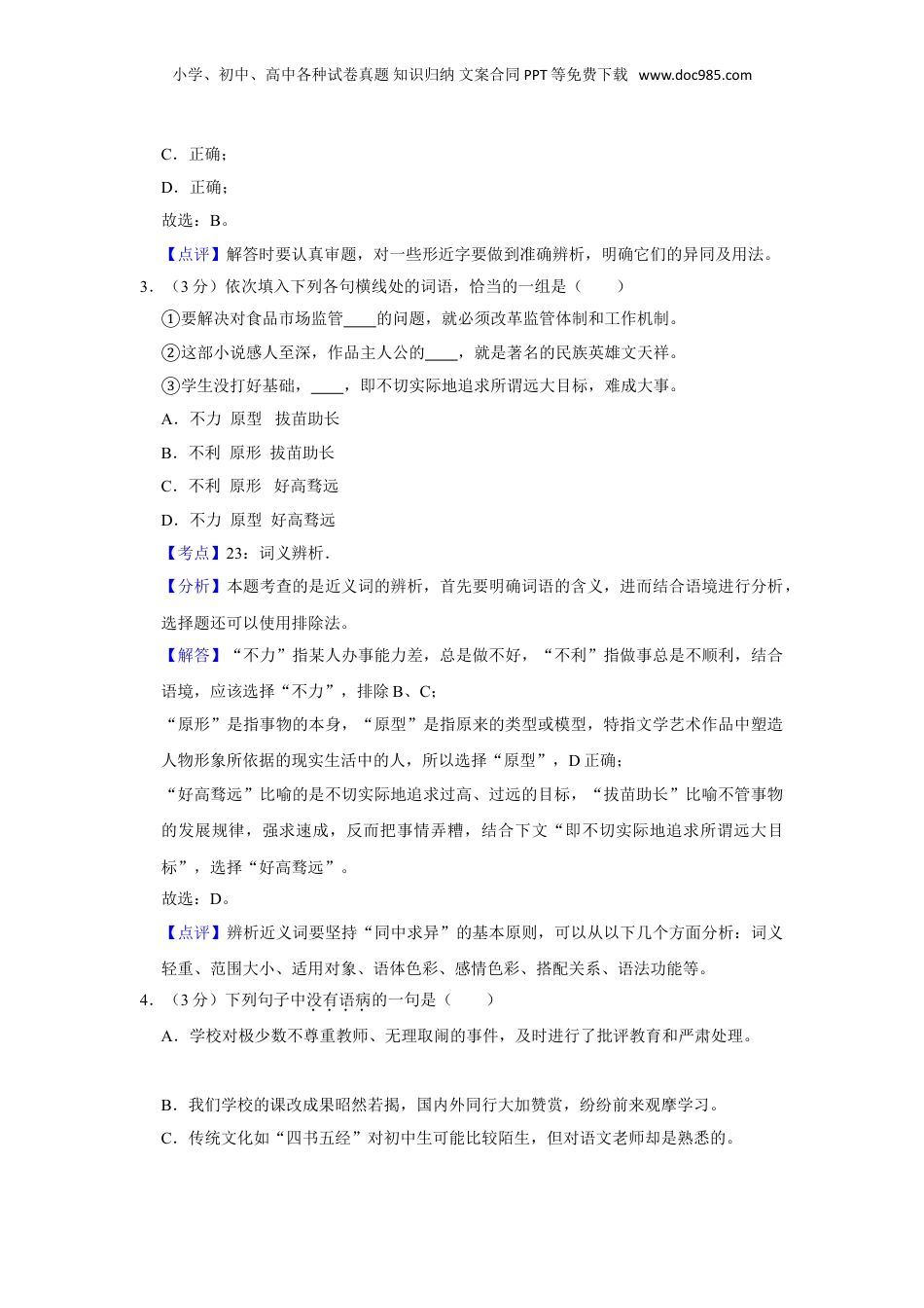 小学、初中、高中各种试卷真题知识归纳文案合同PPT等免费下载www.doc985.com2016年湖南省株洲市中考语文试卷(教师版)一、语言文字积累与运用(共29分)1.(3分)下列词语中加点字的注音有错误的一组是()A.炽热(chì)殚精竭虑(dān)觥筹交错(ɡōnɡ)B.兑现(duì)含英咀华(jǔ)面面相觑(qù)C.吮吸(shǔn)如火如荼(tū)有恃无恐(chí)D.别扭(biè)垂涎三尺(xián)良莠不齐(yǒu)【考点】12:易误读常见字.菁优网版权所有【分析】本题考查字音,大部分是在学习过程中的易读错字,解答时要仔细辨析,认真作答。【解答】A正确。注意“殚精竭虑“的读音:dānjīngjiélǜ;B正确。注意“含英咀华”的读音:hányīngjǔhuá,意思是:读书吸取其精华;“兑现”的读音:duìxiàn;C有误。“如火如荼”的正确读音:rúhuǒrútú;“有恃无恐”的正确读音:yǒushìwúkǒng;D正确。注意“垂涎三尺”的读音:chuíxiánsānchǐ;“良莠不齐”的读音:liángyǒubùqí;故选:C。【点评】此题考查学生对字音的识记能力。需要学生在平时读课文时注意字词的读音,回答时细心,并注意在具体语境中的读音。2.(3分)下列语句中有错别字的一项是()A.不管在什么地方,他都不会给人鹤立鸡群、喧宾夺主的感觉。B.雷!你轰隆隆的,桀傲不训,响彻云宵,是你车轮子滚动的声音?C.书有的只须读其部分,有的只须大体涉猎、浅尝辄止,否则得不偿失。D.几个世纪以来,满腹经纶的学者们绞尽脑汁,却始终解不开它的奥秘。【考点】14:常见易错字.菁优网版权所有【分析】本题考查的是对语境中的字形的辨析能力。【解答】A.正确;B.“桀傲不训”应写作“桀骜不驯”“响彻云宵”应写作“响彻云霄”;小学、初中、高中各种试卷真题知识归纳文案合同PPT等免费下载www.doc985.comC.正确;D.正确;故选:B。【点评】解答时要认真审题,对一些形近字要做到准确辨析,明确它们的异同及用法。3.(3分)依次填入下列各句横线处的词语,恰当的一组是()①要解决对食品市场监管的问题,就必须改革监管体制和工作机制。②这部小说感人至深,作品主人公的,就是著名的民族英雄文天祥。③学生没打好基础,,即不切实际地追求所谓远大目标,难成大事。A.不力原型拔苗助长B.不利原形拔苗助长C.不利原形好高骛远D.不力原型好高骛远【考点】23:词义辨析.菁优网版权所有【分析】本题考查的是近义词的辨析,首先要明确词语的含义,进而结合语境进行分析,选择题还可以使用排除法。【解答】“不力”指某人办事能力差,总是做不好,“不利”指做事总是不顺利,结合语境,应该选择“不力”,排除B、C;“原形”是指事物的本身,“原型”是指原来的类型或模型,特指文学艺术作品中塑造人物形象所依据的现实生活中的人,所以选择“原型”,D正确;“好高骛远”比喻的是不切实际地追求过高、过远的目标,“拔苗助长”比喻不管事物的发展规律,强求速成,反而把事情弄糟,结合下文“即不切实际地追求所谓远大目标”,选择“好高骛远”。故选:D。【点评】辨析近义词要坚持“同中求异”的基本原则,可以从以下几个方面分析:词义轻重、范围大小、适用对象、语体色彩、感情色彩、搭配关系、语法功能等。4.(3分)下列句子中没有语病的一句是()A.学校对极少数不尊重教师、无理取闹的事件,及时进行了批评教育和严肃处理。B.我们学校的课改成果昭然若揭,国内外同行大加赞赏,纷纷前来观摩学习。C.传统文化如“四书五经”对初中生可能比较陌生,但对语文老师却是熟悉的。小学、初中、高中各种试卷真题知识归纳文案合同PPT等免费下载www.doc985.comD.经济是否迅速发展,关键在于能否加速培养出大量的高水平技术、管理人才。【考点】79:病句辨析与修改.菁优网版权所有【分析】本题考查学生病句的辨析。【解答】A.语意重复,去掉“批评教育”;B.褒贬错用,“昭然若揭”是贬义词,这个句子是褒义语境;C.用错对象,改为:初中生对传统文化如“四书五经”;D.正确。故选:D。【点评】注意把握常见类型及修改方法,平时在语言表达中,要注意病句的发生。5.(8分)按原文...