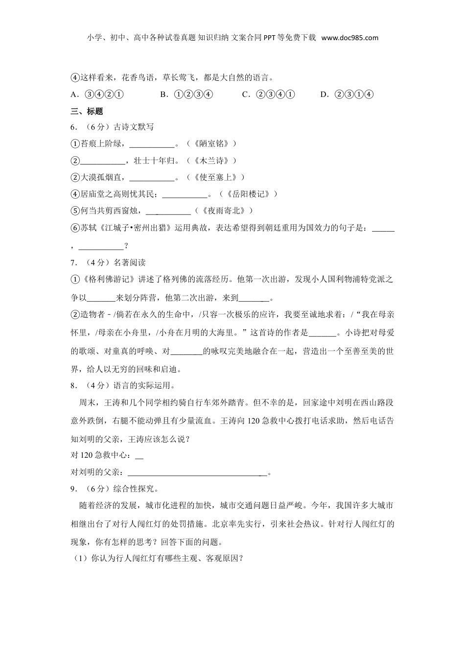 小学、初中、高中各种试卷真题知识归纳文案合同PPT等免费下载www.doc985.com2013年湖南省怀化市中考语文试卷一.语言积累与运用1.(2分)下列词语中字形或加点字注音有错误的一项是()A.阑(lán)珊虬枝钦(qīn)差毛骨悚然B.湛(zhàn)蓝庇护嬉(xī)戏唾手可得C.迸(bìng)溅沉淀间(jiàn)或明辨是非D.彷徨(huáng)恐吓狭隘(ài)锲而不舍2.(2分)下列句子中加点词语使用不恰当的一项是()A.我们所有大教堂的财宝加在一起,也许还抵不上东方这座了不起的冠冕堂皇的博物馆。B.面对困难我与父母齐心协力应对,三足鼎立,共同支撑起这个家。C.大家七嘴八舌地商量着,众说纷纭,莫衷一是。D.鬼子们拍打着水追过去,老头子张皇失措,船去走不动,鬼子紧紧追上了他。3.(2分)下列语句没有语病的一项是()A.春夏之际,市场上的菜摊上摆满了白菜、辣椒、牛肉、茄子等蔬菜。B.凉风习习,树枝摇曳,月光、树影一齐晃动起来,发出沙沙的声响。C.为防止类似的伤害事故再次发生,学校保卫科采取了很多安全措施。D.在老师的悉心辅导下,使我的写作能力迅速提高。4.(2分)下列各句中划线短语的结构类型与其他三个不同的是()A.那树有一点伛偻,露出老态,但是坚固稳定,树顶像刚炸开的烟火一样繁密。B.他重新振作起来,继续前进,心里又产生了一种新的恐惧。C.在这种每年一度的迁徙中,整个大陆所获得的是从3月的天空洒下来的一首有益无损的带着野性的诗歌。D.于是这一天来了,电锯从树的踝骨要下去,嚼碎,撒了一圈白森森的骨粉。那树仅仅在倒地时呻吟了一声。5.(2分)填写在横线上的语句排列顺序恰当的一项是()几千年来,劳动人民注意了草木荣枯、候鸟去来等自然现象同气候的关系,据以安排农事①布谷鸟开始唱歌,劳动人民懂得它在唱什么:“阿公阿婆,割麦插禾。”②杏花开了,就好像大自然在传语要赶快耕地;③桃花开了,又好像在暗示要赶快种谷子。小学、初中、高中各种试卷真题知识归纳文案合同PPT等免费下载www.doc985.com④这样看来,花香鸟语,草长莺飞,都是大自然的语言。A.③④②①B.①②③④C.②③④①D.②③①④三、标题6.(6分)古诗文默写①苔痕上阶绿,。(《陋室铭》)②,壮士十年归。(《木兰诗》)②大漠孤烟直,。(《使至塞上》)④居庙堂之高则忧其民;。(《岳阳楼记》)⑤何当共剪西窗烛,(《夜雨寄北》)⑥苏轼《江城子•密州出猎》运用典故,表达希望得到朝廷重用为国效力的句子是:,?7.(4分)名著阅读①《格利佛游记》讲述了格列佛的流落经历。他第一次出游,发现小人国利物浦特党派之争以来划分阵营,他第二次出游,来到。②造物者﹣/倘若在永久的生命中,/只容一次极乐的应许,我要至诚地求着:/“我在母亲怀里,/母亲在小舟里,/小舟在月明的大海里。”这首诗的作者是。小诗把对母爱的歌颂、对童真的呼唤、对的咏叹完美地融合在一起,营造出一个至善至美的世界,给人以无穷的回味和启迪。8.(4分)语言的实际运用。周末,王涛和几个同学相约骑自行车郊外踏青。但不幸的是,回家途中刘明在西山路段意外跌倒,右腿不能动弹且有少量流血。王涛向120急救中心拨打电话求助,然后电话告知刘明的父亲,王涛应该怎么说?对120急救中心:对刘明的父亲:。9.(6分)综合性探究。随着经济的发展,城市化进程的加快,城市交通问题日益严峻。今年,我国许多大城市相继出台了对行人闯红灯的处罚措施。北京率先实行,引来社会热议。针对行人闯红灯的现象,你有怎样的思考?回答下面的问题。(1)你认为行人闯红灯有哪些主观、客观原因?小学、初中、高中各种试卷真题知识归纳文案合同PPT等免费下载www.doc985.com(2)如何解决行人闯红灯问题,你有哪些可行的建议?(3)针对行人闯红灯,请你拟一条交通宣传语。二.阅读10.(10分)议论文阅读抓住你的暗时间刘未鹏①每个人的手表都走得一样快,但每个人的生命却不是。大脑也是如此。衡量一个人生活了多少年,应该用他的思维时间来计算。所谓暗时间,即一个人用来思维的内在时间举一个极端的例子,如果一个人一出生就呆在一个特殊的保护室里,没有社会交往,没有知识获...