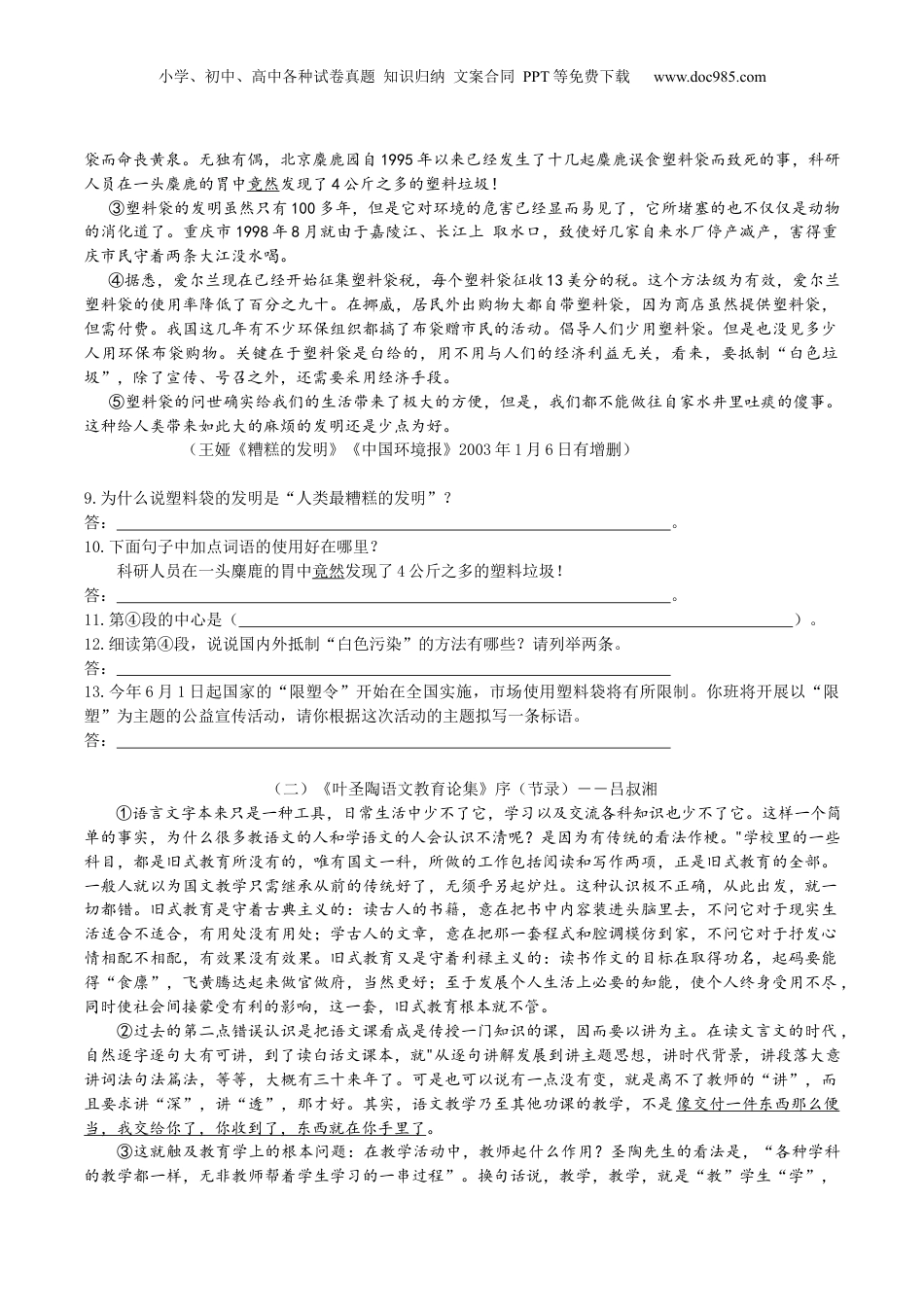 小学、初中、高中各种试卷真题知识归纳文案合同PPT等免费下载www.doc985.com株洲市2008年初中毕业学业考试语文试题卷考试时量:120分钟满分:100分亲爱的同学:你好!这份试卷是你对初中阶段语文学习情况的一次检测。相信自己,你一定会交出一份令人满意的答卷!注意:1、本试卷共四道大题。2、本试卷所有答案均须写在答题卡的相应位置上,否则不计分。一、积累与运用(共22分〉(一)单项选择题(共8分,每小题2分〉1.下列词语中加横线字的注音有错误的一项是()。A.狭隘(ài)哺育(bǔ)言简意赅(gāi)B.驰骋(chěng)真谛(dì)咄咄逼人(duō)C.脸颊(jiá)青睐(lái)诲人不倦(huǐ)D.酝酿(niàng)冗长(rǒng)一蹴而就(cù)解析:诲人不倦(huì)。2.下列词语中有错别字的一项是()。A.暮蔼耽误有口皆碑披星带月B.辐射委婉惟妙惟肖迥然不同C.精彩提炼中流砥柱措手不及D.分歧帐篷名列前茅贻笑大方解析:A项中的“暮蔼”应该是“暮霭”,“披星带月”应该是“披星戴月”。3.下列文句的空缺处,依次填入的词语恰当的一组是()。①他____不决地伫立着,缓缓环顾四周的房屋和院中的景物。②她一连几次挑起话头,想和女儿谈谈,可是女儿的____却很冷谈。③2008年5月12日,我国四川省汶川县发生了____的8.0级大地震。A.犹豫反应耸人听闻B.犹豫反应骇人昕闻C.徘徊反映骇人听闻D.徘徊反映耸人听闻4.下列句子中没有语病的一句是()。A.机器质量的好坏是保证生产安全的一个重要条件。B.几个学校的老师找他就升学的问题交换了意见。C.构建长、株、潭经济合作圈,是湖南战略重大的决策。D.为了便利山区的农业发展,开展山区物候观测是必要的。解析:A项应改为:机器质量的好坏是保证生产是否安全的一个重要条件。B项应改为:学校的几个老师找他就升学的问题交换了意见。C项应改为:构建长、株、潭经济合作圈,是湖南重大的战略决策。(二)按原文默写(共6分,每空1分)5.①征蓬出汉塞,归雁入胡天。。(王维《使至塞上》)②塞下秋来风景异,。四面边声连角起,千嶂里,。(范仲淹《渔家傲》)小学、初中、高中各种试卷真题知识归纳文案合同PPT等免费下载www.doc985.com③苔痕上阶绿,草色入帘青。谈笑有鸿儒,往来无白丁。(刘禹锡《陋室铭》)(三)按要求答题(共8分)6.根据下列的例句,仿写一句话。(2分)【例句】一块铀矿石,可以平庸无奇地在地层沉睡下去,也可以发出惊天动地的能量。仿句:一个人,。7.根据下列提供的情景回答问题。(2分)一次,你妈妈因为一次小事错怪了你,对你发脾气,你说:“________________。”8.从2008年开始,国务院规定每年的清明节端午节、中秋节各放假一天,此举在全国引起较大反响。在规定发布之前,某民意测评机构做了“你更喜欢过清明节、端午节、中秋节等中国传统节目还是情人节、愚人节、圣诞节等西方节目”的调查。以下是调查的数据统计。调查对象调查项目中老年青少年城镇居民乡村居民城镇居民乡村居民更喜欢过中国传统节日73.8%95.5%58.3%70.1%更喜欢过西方节日26.2%4.5%41.7%29.9%(1)根据上表得出结论:(2分)①。②。(2)对国务院的举措,你所持的态度及理由:(2分)态度:_________理由:①;②;③;④。二、阅读下面现代文,回答问题(共26分,除第20题外,每小题2分)(一)最糟糕的发明①不久前,英国《卫报》评出了“人类最糟糕的发明”,塑料袋不幸“荣获”这一称号。塑料袋是从石油或煤炭中提取的化学产品,一旦生产出来就很难自然降解。处理这些白色垃圾很多时候都只能挖土填埋或高温焚烧。据科学家测试,塑料袋在地下200年也不会腐烂降解,大量的塑料废弃物填埋在地下,会破坏土壤透气性,使土壤板结,影响植物生长。如果家畜误食了混入食料或废留在野外的塑料,会因消化道梗阻而死亡;而焚烧所产生的有害烟尘和有毒气体,同样会造成对大气环境的污染。英国《卫报》称,我们的地球似乎已经变成了塑料星球,土地、河流、高山、海洋……塑料袋无处不在,直到有一天,我们都已离去,这些东西仍然占据着地球,因为它们是“永生”的。②据国外新闻媒体报道,经常有许多海洋动物如海豚、海豹、海龟等由于误食了海洋中的漂浮的塑料废弃物...