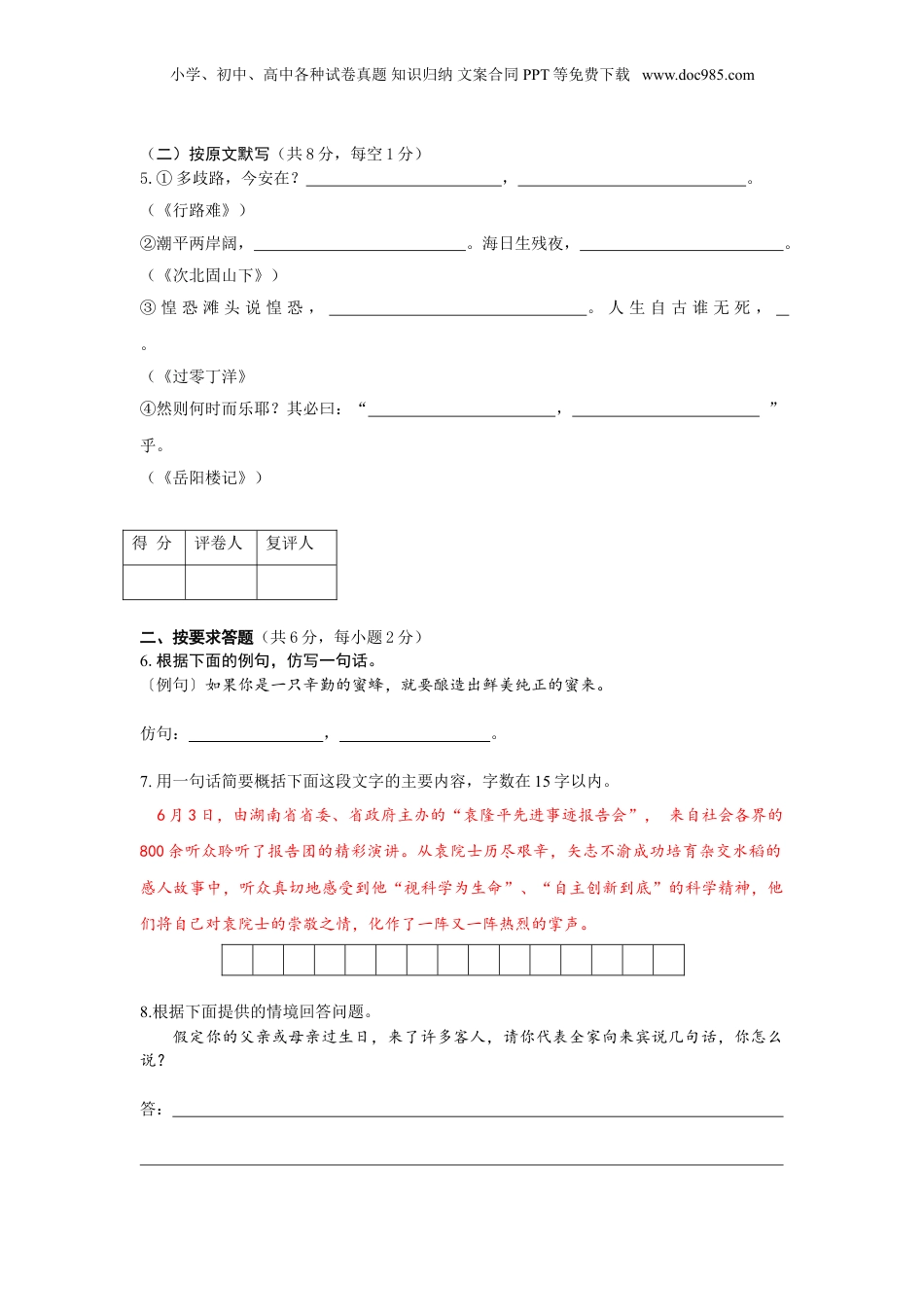 小学、初中、高中各种试卷真题知识归纳文案合同PPT等免费下载www.doc985.com株洲市2007年初中毕业学业考试试卷语文题号一二三四五总分合分人复分人得分考生注意:本学科试卷共五道大题,满分100分,考试时量120分钟。得分评卷人复评人一、按要求答题(16分)(一)单项选择题(共8分,每小题2分)1.下列词语中加点字的注音有错误的一组是A.阻挠(náo)迸发(bènɡ)泉水淙淙(cónɡ)B.豪迈(mài)腼腆(tiǎn)百舸争流(ɡě)C.蜿蜒(wānɡ)塑造(suò)诲人不倦(huì)D.花卉(huì)狙击(jū)恪守不渝(kè)答【】2.下列词语中有错别字一组是A.绚丽驰聘流恋忘返水泄不通B.显赫妄想弄巧成拙耳濡目染C.斗殴犹豫焕然一新循规蹈矩D.鬼祟玲珑各抒己见如法炮制答【】3.下面文句的空缺处,依次填入的词语最恰当的一组是①初中阶段多学点文言知识,对以后古典文学,很有益处。②为了改善办学条件,校长正在多方资金。③6月2日,在纽约举行的锐步田联大奖赛上男子110米栏比赛中,刘翔,以12秒92创造了本赛季的世界最好成绩。A.鉴赏筹资不敌对手B.赏识筹集不敌对手C.赏识筹资不负众望D.鉴赏筹集不负众望答【】4.下列句子中没有语病的一句是A.经过大家的讨论,明确了是非的界限。B.能否保持一颗平常心是考试正常发挥的关键。C.贯彻落实科学发展观是构建和谐社会,促进经济可持续发展的重要保障。D.开展课外活动,大家一定要注意安全,防止不要发生意外事故。答【】小学、初中、高中各种试卷真题知识归纳文案合同PPT等免费下载www.doc985.com(二)按原文默写(共8分,每空1分)5.①多歧路,今安在?,。(《行路难》)②潮平两岸阔,。海日生残夜,。(《次北固山下》)③惶恐滩头说惶恐,。人生自古谁无死,。(《过零丁洋》④然则何时而乐耶?其必曰:“,”乎。(《岳阳楼记》)得分评卷人复评人二、按要求答题(共6分,每小题2分)6.根据下面的例句,仿写一句话。〔例句〕如果你是一只辛勤的蜜蜂,就要酿造出鲜美纯正的蜜来。仿句:,。7.用一句话简要概括下面这段文字的主要内容,字数在15字以内。6月3日,由湖南省省委、省政府主办的“袁隆平先进事迹报告会”,来自社会各界的800余听众聆听了报告团的精彩演讲。从袁院士历尽艰辛,矢志不渝成功培育杂交水稻的感人故事中,听众真切地感受到他“视科学为生命”、“自主创新到底”的科学精神,他们将自己对袁院士的崇敬之情,化作了一阵又一阵热烈的掌声。8.根据下面提供的情境回答问题。假定你的父亲或母亲过生日,来了许多客人,请你代表全家向来宾说几句话,你怎么说?答:小学、初中、高中各种试卷真题知识归纳文案合同PPT等免费下载www.doc985.com。得分评卷人复评人三.阅读下面现代文,回答问题(共26分,每小题2分)(一)①现代金鱼有八十多个变种,除了常见的红色,还有橙、紫、黑、银白以及五花、透明等多种色彩,体态也各不相同。一般分为三类:一类是文种,体型与普通的鱼类相似,鳍发达,尾鳍分叉,就像一个“文”字,如“鹅头”“珍珠鳞”等;一类是龙钟,两眼突出,鳍发达,如“龙眼”;一类是蛋种,没有背鳍,如“蛋球”“虎头”等。②金鱼体质娇嫩,喂养时要特别注意水质和喂食。没有受到污染的河水、湖水养鱼最好;如果用井水、自来水、要搁置几天,让杂质沉淀,氯气逸出。金鱼最喜欢吞食鲜活的鱼虫(俗称红虫),也吃米粒、馒头屑、蛋黄粉等。但每次喂食不宜太多,以防金鱼过多进食,导致死亡。③金鱼最初直接放养在池塘内。到了宋代,开始用缸蓄养。明代金鱼普及全国,逐步发展为盆养,如木盆、陶盆。现代家庭常常用玻璃缸饲养,放在几案上清晰透明,便于观赏。也有人别出心裁,将缸制成扁平的。里面配镜,外面加框,挂在墙壁上。如果再在缸里面布置些水草、假山石或陶制的亭、台、塔、桥,色彩缤纷的金鱼闪着鳞光穿行其间,那真是一幅别致的活动的画,为室内增色不少。9.第①段文字中,作者根据将现代变种金鱼分为三类。10.第①段文字中,加点词语“一般”能否删去?为什么?答:11.第②段文字说明喂养金鱼:一要,二要。12.第③段文字采用的说明顺序是A.逻辑顺序B.时间顺序C.空间顺序答【】小学、初...