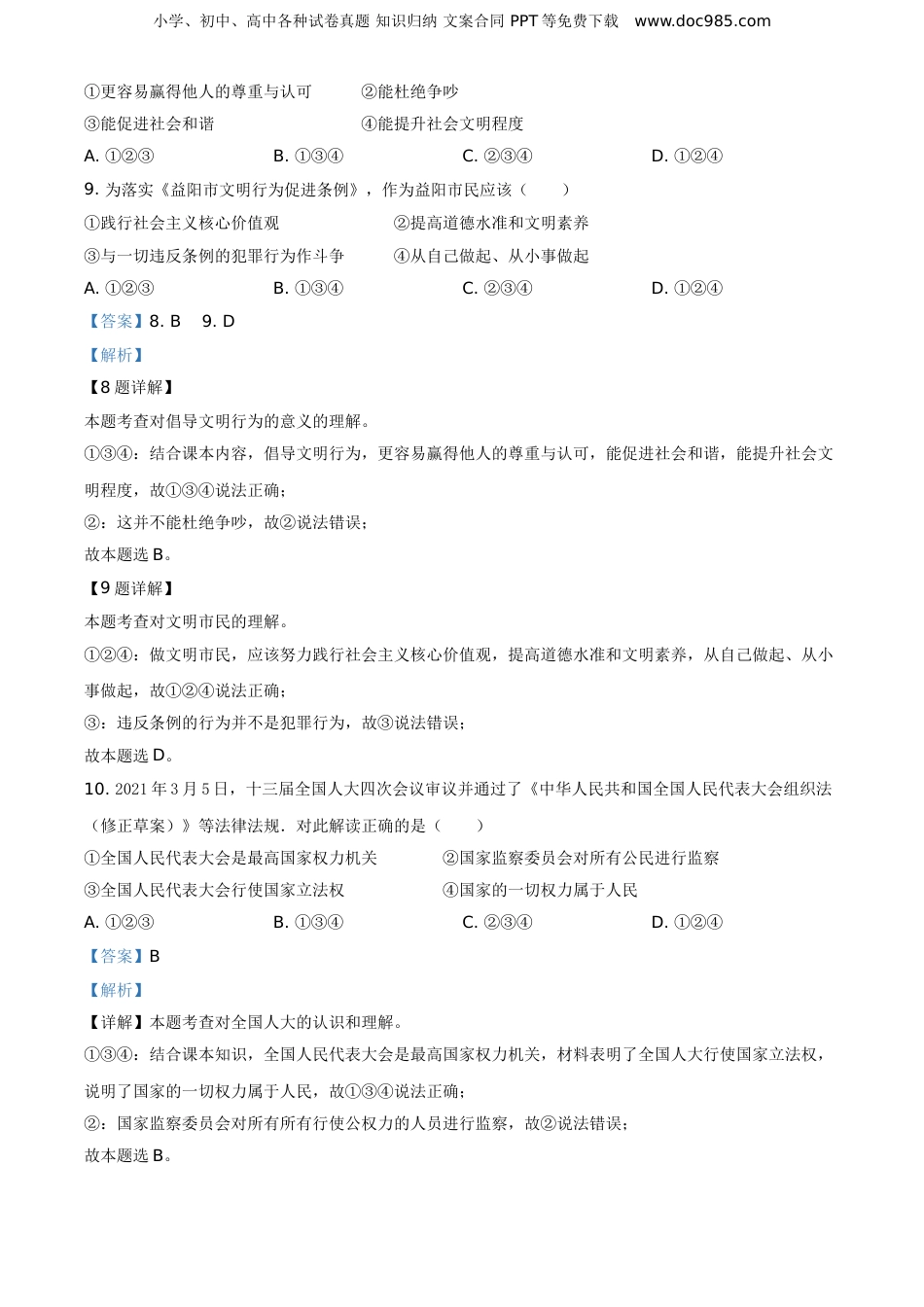 小学、初中、高中各种试卷真题知识归纳文案合同PPT等免费下载www.doc985.com2021年湖南省益阳市中考道德与法治真题一、单项选择题(下列各题的备选答案中,只有一项是最符合题意的.请在答题卡上将最合题意的答案所对应题号的字母涂黑.每小题2分,共40分)1.2020年8月11日,国家主席习近平签署主席令,授予钟南山“_______”,授予张伯礼、张定宇、陈薇(女)“_________”国家荣誉称号()A.国家荣誉人民英雄B.国家荣誉共和国勋章C.共和国勋章人民英雄D.人民科学家人民教育家【答案】C【解析】【详解】时事题,解析略。2.2021年1月10日是第一个中国人民______.中共中央政治局委员郭声琨强调,要把以习近平同志为核心的党中央的关怀激励转化为强大的动力,以实际行动践行对党忠诚、服务人民、纪律严明的承诺()A.教师节B.警察节C.护士节D.记者节【答案】B【解析】【详解】时事题,解析略。3.2021年3月1日,《______》开始实施,这是我国首部有关流域保护的专门法律,为依法推动该流域走出一条生态优先、绿色发展之路提供了法律保障()A.黄河保护法B.珠江保护法C.长江保护法D.湘江保护法【答案】C【解析】【详解】时事题,解析略。4.2020年11月18日,世界互联网大会组委会发布的《_________》指出,国际社会应采取更加积极、包容、协调、普惠的政策,加快全球信息基础设施建设,促进互联互通,推动数字经济创新发展()A.携手构建科技命运共同体行动倡议B.携手构建经济命运共同体行动倡议C.携手构建气候命运共同体行动倡议D.携手构建网络空间命运共同体行动倡议【答案】D【解析】【详解】本题是时事题,解析略。5.据文化和旅游部消息,联合国世界旅游组织和西班牙政府正式通报,自2021年1月25日起,______正式成为联合国世界旅游组织官方语言()小学、初中、高中各种试卷真题知识归纳文案合同PPT等免费下载www.doc985.comA.中文B.日文C.英语D.德语【答案】A【解析】【详解】时事题,解析略。6.《中华人民共和国反食品浪费法》于2021年4月29日起开始实施。该法的实施有利于()①节约粮食,减少资源浪费②建立诚信社会③尊重劳动者的劳动成果④弘扬中华民族的传统美德A.①②③B.②③④C.①③④D.①②④【答案】C【解析】【详解】本题考查对传承中华传统美德的认识和理解。①③④:依据教材知识,勤俭节约是中华民族的传统美德,《中华人民共和国反食品浪费法》的实施,有利于节约粮食,减少资源浪费;有利于尊重劳动者的劳动成果;有利于弘扬中华民族的传统美德,故①③④说法正确;②:这与诚信无关,故②与题意不符;故本题选C。7.被誉为“杂交水稻之父”的袁隆平费尽千辛万苦,历经六年,终于从14000株稻穗中找到了6株不育株,通过人工授粉的方法繁殖出下一代,证明了“无性杂交”学说是错误的。这启示我们()①要培养批判性思维②要有面对困难的勇气和坚强的意志③有梦想就能成功④要敢于对不合理的事情说“不”A.①②③B.①③④C.②③④D.①②④【答案】D【解析】【详解】本题考查批判性思维。①②④:批判性思维有助于调动我们的经验,激发学习动机,有助于促使我们解决问题,改进现状。题干中袁隆平的实践告诉我们在生活要培养批判性思维;要有面对困难的勇气和坚强的意志;要敢于对不合理的事情,故①②④正确;③:有梦想不一定就能成功,要通过努力才能把梦想变为现实,故排除③;故本题选D。2021年1月16日上午,益阳市第六届人民代表大会第五次会议表决通过了《益阳市文明行为促进条例(草案)》。据此完成下面小题8.《条例》第八条倡导下列文明行为;遵守公共礼仪,言行举止文明,在公共场所着装得体、不喧哗.这些文明行为()小学、初中、高中各种试卷真题知识归纳文案合同PPT等免费下载www.doc985.com①更容易赢得他人的尊重与认可②能杜绝争吵③能促进社会和谐④能提升社会文明程度A.①②③B.①③④C.②③④D.①②④9.为落实《益阳市文明行为促进条例》,作为益阳市民应该()①践行社会主义核心价值观②提高道德水准和文明素养③与一切违反条例的犯罪行为作斗争④从自己做起、从小事做起A.①②③B.①③④C.②③④D.①②④【答案】8.B9.D【解析】【8题详解】本...