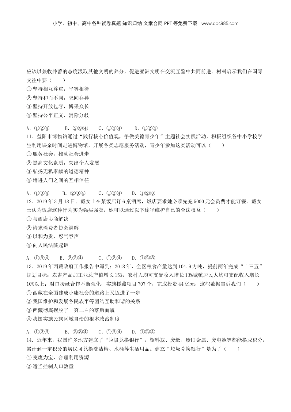 小学、初中、高中各种试卷真题知识归纳文案合同PPT等免费下载www.doc985.com2019年湖南省益阳市中考道德与法治真题及答案一、单项选择题(下列各题的备选答案中,只有一项是最符合题意的.请在答题卡上将最符合题意的答案对应题号的字母涂黑.每小题2分,共40分)1.2018年10月24日,我国又一项目世界级工程_____正式建成通车。它是世界总体跨度最长、钢结构桥体最长、海底沉管隧道最长的跨海大桥,也是公路建设史上技术最复杂、施工难度最高、工程规模最庞大的桥梁,创造了一系列“世界之最”,可谓名副其实的超级工程。()A.武穴长江公路大桥B.胶州湾跨海大桥C.沪通长江大桥D.港珠澳大桥2.2018年9月23日是______日,我国迎来了第一个中国农民丰收节。中共中央总书记、国家主席、中央军委主席习近平代表党中央,向全国亿万农民致以节日的问候和良好的祝愿。()A.春分B.夏至C.秋分D.冬至3.2019年1月2日,《_____》发表40周年纪念会在北京人民大会堂降重举行。中共中央总书记、国家主席、中央军委主席习近平出席纪念会并发表重要讲话。()A.告港澳同胞书B.告台湾同胞书C.关于促进两岸经济交流合作的若干措施D.关于促进两岸文化交流合作的若干措施4.国家主席习近平2018年11月17日应邀出席在巴布亚新几内亚莫尔兹比港举行的亚太经合组织工商领导人峰会并发表题为《____》的主旨演讲,强调要为世界经济发展把握正确方向,为国际社会找到有效治理思路。()A.顺应时代潮流实现共同发展B.同舟共济创造美好未来C.携手共命运同心促发展D.携手推进新时代中阿战略伙伴关系5.中国首支维和直升机分队授勋仪式2018年7月15日在位于苏丹达尔富尔法希尔的营区举行。全体140名和官兵荣获联合国“_____”。()A.英雄荣誉勋章B.模范荣誉勋章C.和平荣誉勋章D.安全荣誉勋章6.《中华人民共和国民法总则》第二十六条规定:父母对未成年子负有抚养。教育和保护的义务,成年子女对父母负有赡养等、扶助和保护的义务。法律条文体现的中华传统美德是()A.尊老爱幼,孝敬父母B.友爱同学,互帮互助小学、初中、高中各种试卷真题知识归纳文案合同PPT等免费下载www.doc985.comC.勤劳勇敢,自强不息D.忧国忧民,自信自立7.小强小学成绩优异,进入中学后,小强感到诸多不适应,期中考试成绩也很不理想,他慢慢失去了对学习的兴趣和信心。好友小明给小强提了点建议,你认为正确的有()①要学会制定合理的学习目标②要以积极的心态对待学习③要转变观念,完全不在乎学习成绩④要学会释放学习压力A.①②③B.②③④C.①③④D.①②④8.在世界经济的大海中,各国互通有无,靠的是信用之帆和规矩之锚。中国愿同其他国家一道,坚持把对话协商利用起来,坚持把多边主义奉行到底,共同守护好人类社会的“信用堤坝”,守护好人类社会的“信用堤坝”()①能促进世界和谐发展②能阻挡世界多极化趋势③能提高国家形象和声誉④能增进各国战略互信A.①②④B.①③④C.②③④D.①②③9.如图的做法()①有利于青少年身心健康②有利于营造良好的网络环境③有利于杜绝青少年沉迷网络④有利于培育积极向上向善的网络文化A.①②④B.②③④C.①②③D.①③④10.2019年5月15日,习近平总书记在亚洲文明对话大会开幕式上的主旨演讲中指出:文明只有姹紫嫣红之别,但绝无高低优劣之分;我们既要让本国文明充满勃勃生机,又要为他国文明发展创造条件;我们小学、初中、高中各种试卷真题知识归纳文案合同PPT等免费下载www.doc985.com应该以兼收并蓄的态度汲取其他文明的养分,促进亚洲文明在交流互鉴中共同前进。材料启示我们在国际交往中要()①坚持相互尊重,平等相待②坚持和而不同,求同存异③坚持开放包容,博采众长④坚持公平正义,消除分歧A.①②④B.②③④C.①③④D.①②③11.益阳市博物馆通过“践行核心价值观,争做美德青少年”主题社会实践活动,积极组织各中小学校学生利用课余时间走进博物馆,开展各类志愿服务活动,青少年参加这类活动可以()①服务社会,推动社会进步②提高文化素质,突出个人发展③弘扬无私奉献的道德精神④增进人们之间的互相信任A.①③④B.②③④C...