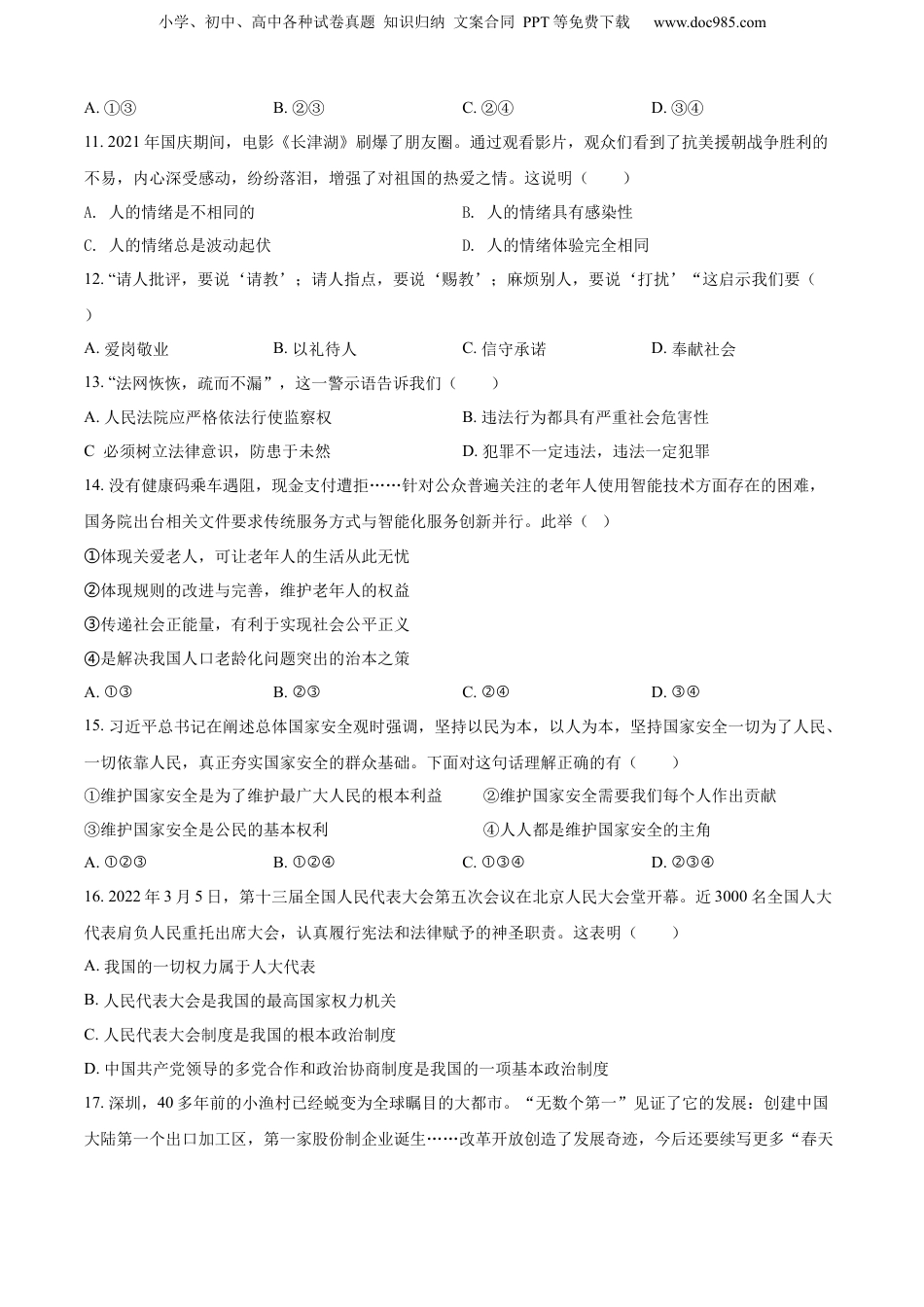 小学、初中、高中各种试卷真题知识归纳文案合同PPT等免费下载www.doc985.com2022年衡阳市初中学业水平考试试卷道德与法治考生注意:1.本学科为开卷考试。2.本学科试卷共五道大题,32道小题,满分100分,考试时量90分钟。3.本学科试卷的答案一律按要求填写到答题卡相应处。一、单项选择题(每小题2分,共50分。下列每题只有一个最符合题意的选项)1.2021年5月31日,中共中央政治局召开会议,审议《关于优化生育政策促进人口长期均衡发展的决定》并指出,为进一步优化生育政策,实施一对夫妻可以生育______个子女政策及配套支持措施()A.—B.二C.三D.四2.2021年11月3日,2020年度国家科学技术奖励大会在北京人民大会堂召开,______获国家最高科学技术奖。()A.顾诵芬王大中B.黄旭曾庆存C.刘永坦钱七虎D.屠呦呦王泽山3.2022年2月20日,第二十四届冬季奥林匹克运动会闭幕式在北京举行。本届冬奥会共刷新了2项世界纪录和_______项冬奥会记录。中国代表团以9金4银2铜名列金牌榜第3位()A.16B.17C.18D.194.2022年3月5日,第十三届全国人民代表大会第五次会议在北京人民大会堂开幕。根据会议议程,国务院总理李克强代表国务院向大会作政府工作报告。李克强在报告中指出,去年国内生产总值达到114万亿元,增长_____()A.8.0%B.8.1%C.8.2%D.8.3%5.2022年4月16日9时56分,_____载人飞船返回舱在东风着陆场成功着陆,三位航天员翟志刚、王亚平、叶光富顺利返回地面()A.神舟十一号B.神舟十二号C.神舟十三号D.神舟十四号6.中学阶段是人生发展的一个新阶段,把我们带进一个别样的天地:富有挑战的课程,新奇的实验器材,新校园、新老师、新同学……我们站在一个新的起点上。下列对此认识正确的有()①中学生活,对我们来说意味着新的机会和可能②我们要珍惜这个新起点,体验初中生活的快乐③升入初中,我已经是个大人了,一切都要自己做主④我们要从点滴做起,付出努力,为以后的人生奠基A.①②③B.①②④C.①③④D.②③④7.下图漫画表明()小学、初中、高中各种试卷真题知识归纳文案合同PPT等免费下载www.doc985.com①老师的肯定能解决学生学习中的一切问题②老师要关爱呵护学生③克服缺点就—定能成功④我们要把老师的表扬当作激励A.①②B.②③C.②④D.③④8.春天里,每一株草都在努力发芽,每一朵花都在努力绽放。下列做法可以让中学生绽放生命光彩的有()①志愿服务献爱心②劳动创造增技能③无所事事度时光④经典诵读养精神A.①②③B.①③④C.①②④D.②③④9.有人说:“青春,是与七个自己相遇。一个明媚,一个忧伤,一个华丽,一个冒险,一个倔强,一个柔软,最后那个正在成长。”对此理解正确的是()A.青春期的矛盾心理对我们只会产生消极的心理影响B.青春是美好的,要尽情享乐,不留遗憾C.青春期是人生重要的过渡阶段,需做到身心协调发展D.青春是一个成长的过程,我们要时刻追求完美10.自强可以让我们更加自信。下列想法或做法体现自强自信的有()序号情景想法或做法①英语测试后我得到68分,小明还没及格呢②放暑假在家我终于可以自由自在地通宵玩网游了③校演讲比赛我口才不错,坚持练习会比去年的我更好④体育不及格每天坚持锻炼,请父母和同学监督自己小学、初中、高中各种试卷真题知识归纳文案合同PPT等免费下载www.doc985.comA.①③B.②③C.②④D.③④11.2021年国庆期间,电影《长津湖》刷爆了朋友圈。通过观看影片,观众们看到了抗美援朝战争胜利的不易,内心深受感动,纷纷落泪,增强了对祖国的热爱之情。这说明()A.人的情绪是不相同的B.人的情绪具有感染性C.人的情绪总是波动起伏D.人的情绪体验完全相同12.“请人批评,要说‘请教’;请人指点,要说‘赐教’;麻烦别人,要说‘打扰’“这启示我们要()A.爱岗敬业B.以礼待人C.信守承诺D.奉献社会13.“法网恢恢,疏而不漏”,这一警示语告诉我们()A.人民法院应严格依法行使监察权B.违法行为都具有严重社会危害性C.必须树立法律意识,防患于未然D.犯罪不一定违法,违法一定犯罪14.没有健康码乘车遇阻,现金支付遭拒……针对公众普遍关注的老年人使用智能技术方面存在的困难,国务院出台相关文件要求传统服务方式...