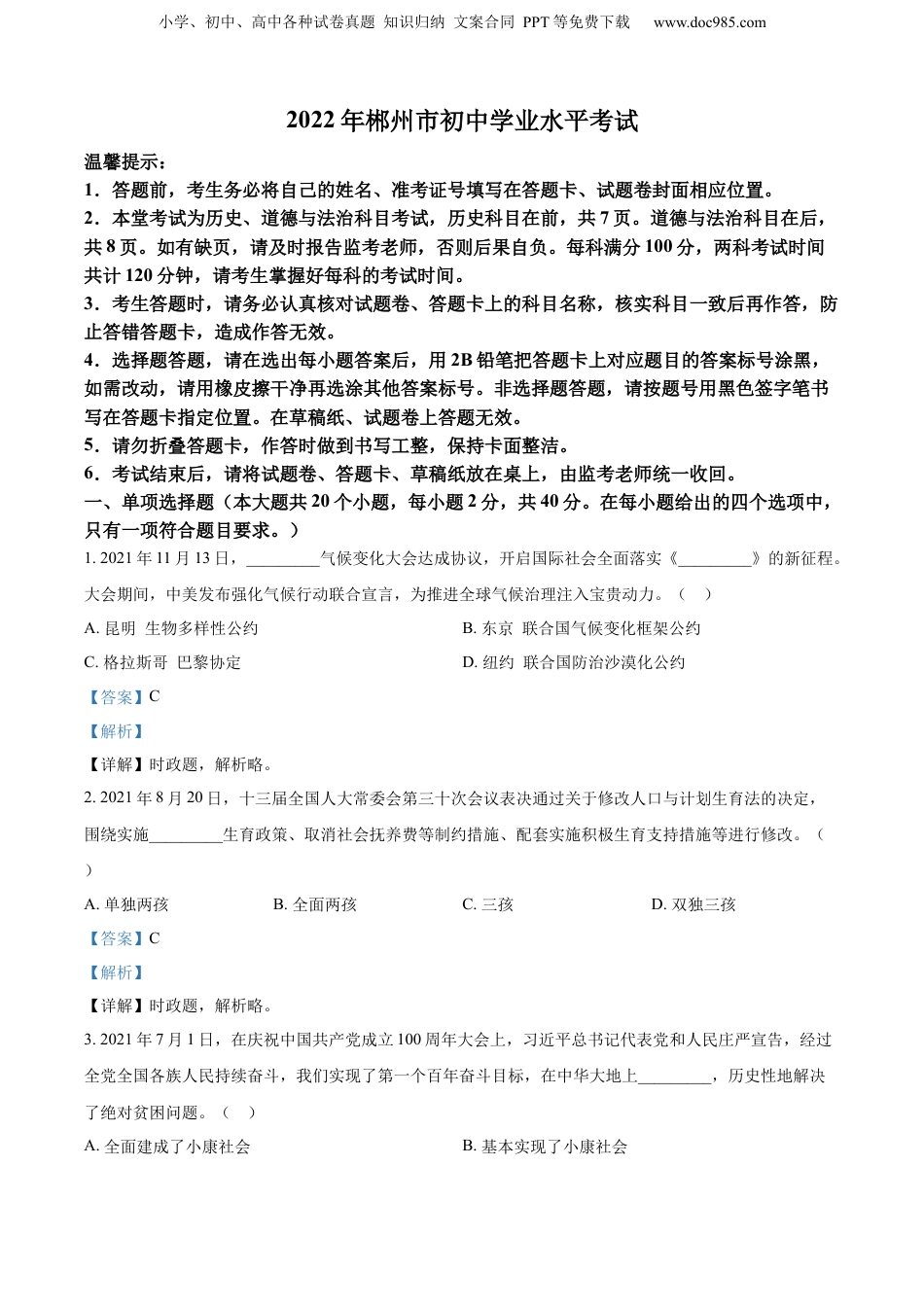 小学、初中、高中各种试卷真题知识归纳文案合同PPT等免费下载www.doc985.com2022年郴州市初中学业水平考试温馨提示:1.答题前,考生务必将自己的姓名、准考证号填写在答题卡、试题卷封面相应位置。2.本堂考试为历史、道德与法治科目考试,历史科目在前,共7页。道德与法治科目在后,共8页。如有缺页,请及时报告监考老师,否则后果自负。每科满分100分,两科考试时间共计120分钟,请考生掌握好每科的考试时间。3.考生答题时,请务必认真核对试题卷、答题卡上的科目名称,核实科目一致后再作答,防止答错答题卡,造成作答无效。4.选择题答题,请在选出每小题答案后,用2B铅笔把答题卡上对应题目的答案标号涂黑,如需改动,请用橡皮擦干净再选涂其他答案标号。非选择题答题,请按题号用黑色签字笔书写在答题卡指定位置。在草稿纸、试题卷上答题无效。5.请勿折叠答题卡,作答时做到书写工整,保持卡面整洁。6.考试结束后,请将试题卷、答题卡、草稿纸放在桌上,由监考老师统一收回。一、单项选择题(本大题共20个小题,每小题2分,共40分。在每小题给出的四个选项中,只有一项符合题目要求。)1.2021年11月13日,_________气候变化大会达成协议,开启国际社会全面落实《_________》的新征程。大会期间,中美发布强化气候行动联合宣言,为推进全球气候治理注入宝贵动力。()A.昆明生物多样性公约B.东京联合国气候变化框架公约C.格拉斯哥巴黎协定D.纽约联合国防治沙漠化公约【答案】C【解析】【详解】时政题,解析略。2.2021年8月20日,十三届全国人大常委会第三十次会议表决通过关于修改人口与计划生育法的决定,围绕实施_________生育政策、取消社会抚养费等制约措施、配套实施积极生育支持措施等进行修改。()A.单独两孩B.全面两孩C.三孩D.双独三孩【答案】C【解析】【详解】时政题,解析略。3.2021年7月1日,在庆祝中国共产党成立100周年大会上,习近平总书记代表党和人民庄严宣告,经过全党全国各族人民持续奋斗,我们实现了第一个百年奋斗目标,在中华大地上_________,历史性地解决了绝对贫困问题。()A.全面建成了小康社会B.基本实现了小康社会小学、初中、高中各种试卷真题知识归纳文案合同PPT等免费下载www.doc985.comC.基本实现了社会主义现代化D.全面建成了社会主义现代化强国【答案】A【解析】【详解】时政题,解析略。4.青春,带着一份特殊的邀约,款款而来。在这个时期,我们的身体会发生一定的变化,下面属于青春期生理变化的有()①身体迅速长高、长壮②性机能成熟③运动系统和神经系统不断成熟④与异性交往时表现得比较害羞、怯懦A.①②③B.①②④C.①②③④D.①③④【答案】A【解析】【详解】本题考查悄悄变化的我。①②③:青春期,我们的身体会发生一定的变化,身体迅速长高、长壮,性机能成熟,运动系统和神经系统不断成熟,都是正常现象,所以①②③正确;④:与异性交往时表现得比较害羞、怯懦,属于心理变化,所以④排除;故本题选A。5.人生路漫漫,有喜也有悲,我们要学会合理地调节情绪。下列属于调节情绪正确的做法是()①参加体育活动,欣赏音乐②在课堂上大喊大叫③敞开心扉,向好朋友倾诉④把愤怒的感受写入日记本A.①②③B.②③④C.①②④D.①③④【答案】D【解析】【详解】本题考查调节情绪。①③④:我们要学会合理地调节情绪,参加体育活动,欣赏音乐、向好朋友倾诉、把愤怒的感受写入日记本都是正确的情绪调节的好方法,所以①③④正确;②:课堂上大喊大叫既不能很好地调节情绪,又影响课堂秩序,所以②排除;故本题选D。6.老子说:“自知者明。”这说明()A.认识自己是很重要的B.认识自己,可以更好的发展自己的能力C.认识自己,会有美好的明天D.认识自己,能帮助我们调节和控制自己的行为【答案】D【解析】小学、初中、高中各种试卷真题知识归纳文案合同PPT等免费下载www.doc985.com【详解】本题考查认识自己。D:题干中的话意思是能够了解自己的人是明智的、聪明的。依据教材知识,正确、全面认识自己的特点和长处,正确认识自我与社会、个人与集体的关系,才能促进自我发展,促进与他人的交往,能帮助我们调节和控制自己的行为,...