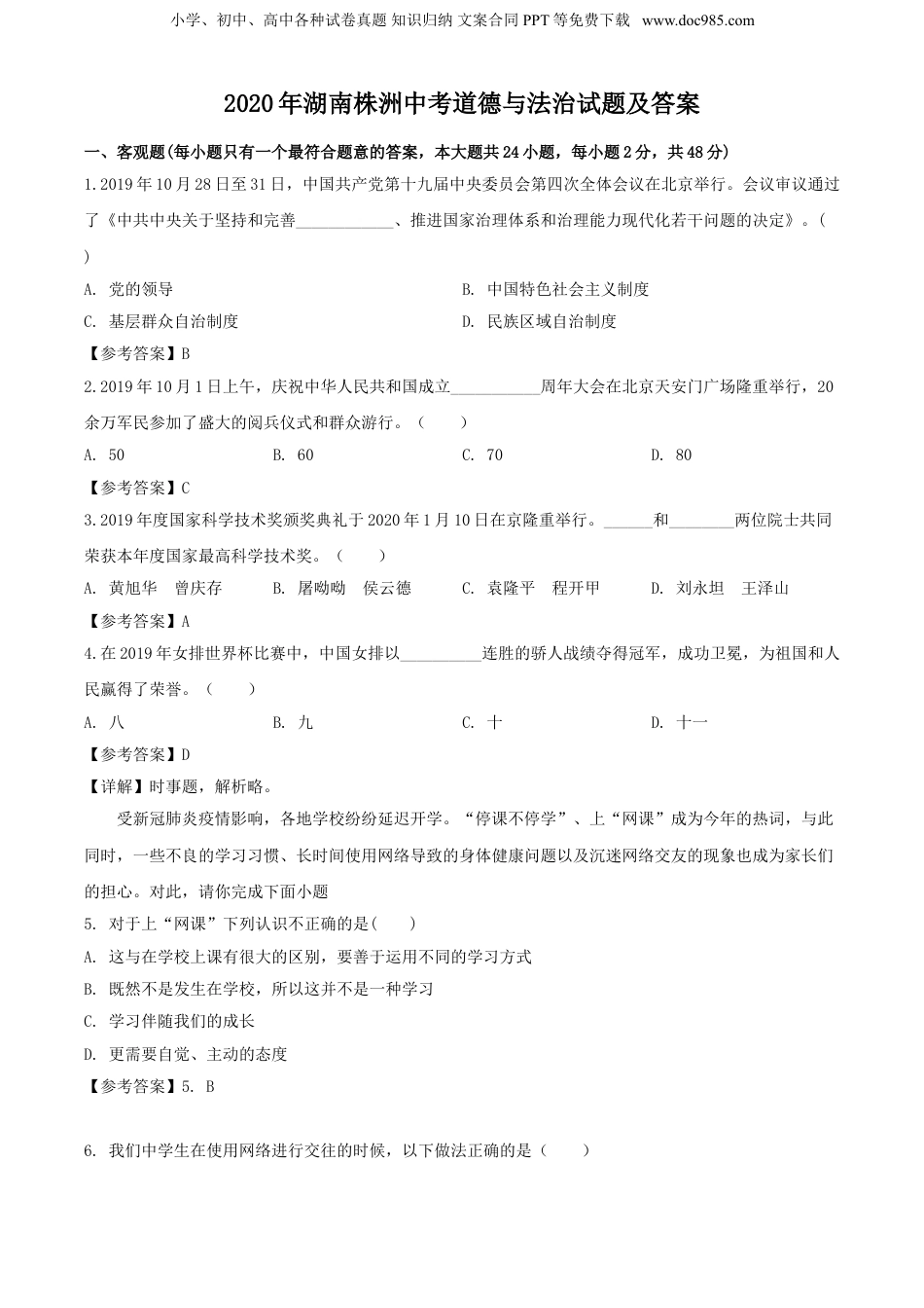 小学、初中、高中各种试卷真题知识归纳文案合同PPT等免费下载www.doc985.com2020年湖南株洲中考道德与法治试题及答案一、客观题(每小题只有一个最符合题意的答案,本大题共24小题,每小题2分,共48分)1.2019年10月28日至31日,中国共产党第十九届中央委员会第四次全体会议在北京举行。会议审议通过了《中共中央关于坚持和完善____________、推进国家治理体系和治理能力现代化若干问题的决定》。()A.党的领导B.中国特色社会主义制度C.基层群众自治制度D.民族区域自治制度【参考答案】B2.2019年10月1日上午,庆祝中华人民共和国成立___________周年大会在北京天安门广场隆重举行,20余万军民参加了盛大的阅兵仪式和群众游行。()A.50B.60C.70D.80【参考答案】C3.2019年度国家科学技术奖颁奖典礼于2020年1月10日在京隆重举行。______和________两位院士共同荣获本年度国家最高科学技术奖。()A.黄旭华曾庆存B.屠呦呦侯云德C.袁隆平程开甲D.刘永坦王泽山【参考答案】A4.在2019年女排世界杯比赛中,中国女排以__________连胜的骄人战绩夺得冠军,成功卫冕,为祖国和人民赢得了荣誉。()A.八B.九C.十D.十一【参考答案】D【详解】时事题,解析略。受新冠肺炎疫情影响,各地学校纷纷延迟开学。“停课不停学”、上“网课”成为今年的热词,与此同时,一些不良的学习习惯、长时间使用网络导致的身体健康问题以及沉迷网络交友的现象也成为家长们的担心。对此,请你完成下面小题5.对于上“网课”下列认识不正确的是()A.这与在学校上课有很大的区别,要善于运用不同的学习方式B.既然不是发生在学校,所以这并不是一种学习C.学习伴随我们的成长D.更需要自觉、主动的态度【参考答案】5.B6.我们中学生在使用网络进行交往的时候,以下做法正确的是()小学、初中、高中各种试卷真题知识归纳文案合同PPT等免费下载www.doc985.com①只要不跟网友见面,透漏个人信息没什么关系②要有自我保护意识,遇到问题学会求助③遇到“投缘”的网友就可以转化为现实中的朋友④对于陌生人的邀请,不轻易接受A.①②B.③④C.①③D.②④【参考答案】6.D7.2020年3月23日,株洲市文明办、市场监督管理局对餐饮经营单位和市民朋友发出了“使用公筷公勺,践行文明餐桌行动”倡议书。不少同学对此进行了讨论,你支持的观点是()A.小明说:换来换去多不方便,想怎么吃就怎么吃呗B.小红说:这有利于保护自己和他人的健康,也体现了对他人的尊重,是就餐“新食尚”C.小丽说:我又没病,干嘛要用公筷公勺D.小青说:跟不熟悉的人就使用,跟熟悉的人就没必要了【参考答案】B8.有人说:在成功的路上,最大的敌人其实并不是缺少机会或资历浅薄,而是缺乏对自己情绪的控制。愤怒时,不能制怒,使周围的合作者望而却步;消沉时,放纵自己的萎靡,把许多稍纵即逝的机会白白浪费。对此,你的理解是()①情绪影响我们的观念和行动②保持积极的心态,可以让生活更加美好③只要有负面情绪就会危及我们的身心健康④我们要合理调节情绪A.①③④B.②③④C.①②③D.①②④【参考答案】D9.2020年2月,株洲市省直中医医院的一群护士妈妈们家中有嗷嗷待哺的孩子,但因为抗“疫”的需要,她们采取了集体断奶的方式,奔赴并坚守在抗“疫”一线。她们这种行为表明了()①当个人利益与集体利益发生冲突时,应把集体利益放在个人利益之上②只尽到了社会责任,这种行为不值得③弘扬了舍己为人、爱岗敬业的优良品质④心中有集体,识大体,顾大局A.②③④B.①②③C.①③④D.①②④【参考答案】C10.现实中因救人反被告的事件偶有发生,“扶不扶”“救不救”一度困扰公众。民法典明确了侵权人和受益人的各自责任,同时也明确了见义勇为者依法不承担民事责任,有助于解决“英雄流血又流泪”的问题。上述材料表明()A.法律由国家制定或认可B.法律由国家强制力保证实施小学、初中、高中各种试卷真题知识归纳文案合同PPT等免费下载www.doc985.comC.法律规范着全体社会成员的行为,保护着我们的生活D.法律规定与道德要求都是一样的【参考答案】C11.在株洲市天元区黄山路,有一位叫玲姐的米粉店老板坚持8年为环卫工提供免费餐券,十多年来照顾孤寡老人,在疫...