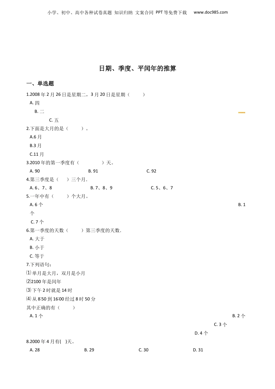 小学、初中、高中各种试卷真题知识归纳文案合同PPT等免费下载www.doc985.com日期、季度、平闰年的推算一、单选题1.2008年2月26日是星期二,3月20日是星期()A.四B.二C.五2.下面是大月的是()。A.6月B.3月C.11月3.2010年的第一季度有()天。A.90B.91C.924.第三季度是()三个月.A.6、7、8B.7、8、9C.5、6、75.一年中有()个大月。A.6个B.1个C.7个6.第一季度的天数()第三季度的天数.A.大于B.小于C.等于7.下列语句:⑴单月是大月,双月是小月2100⑵年是闰年⑶下午2时就是14时⑷从850∶到1600∶经过8时50分其中正确的有()A.1个B.2个C.3个D.4个8.2000年4月有()天。A.28B.29C.30D.31小学、初中、高中各种试卷真题知识归纳文案合同PPT等免费下载www.doc985.com9.下面的年份是()(1)2003年(2)2006年(3)1986年(4)2008年(5)1996年(6)1800年(7)2010年A.平年B.闰年10.1992是闰年,下列年份中,()还是闰年。A.1900年B.1996年C.1998年D.2001年二、判断题11.判断对错.2006年是闰年.12.判断对错:1996年7月1日是星期一,1997年7月1日是星期二.13.判断对错.2008年,奥运会在我国首都北京召开,那年是闰年.14.判断对错:如果今年的七月一日是星期一,那么八月一日是星期四.15.判断对错.在闰年时,第一季度和第二季度的天数是相等的.16.2300年是平年。17.判断对错.2010年2月29日是星期四.18.一、二、三月是第一季度,1998年的第一季度有________天.19.判断对错2100是4的倍数,所以公元2100年是闰年20.判断对错.凡是单数的月都是每月31天.三、填空题21.小学、初中、高中各种试卷真题知识归纳文案合同PPT等免费下载www.doc985.com(1)3时15分=________分(2)2.5公顷=________平方米22.芳芳参加夏令营,7月25日出发,8月8日返回,他从出发到返回用了________天.这次活动是在第________季度,这个季度有________天23.8月份有________天22时是晚上________时24.人们把地球自转一圈的时间定为________。25.平年有________天,闰年有________.26.3千克=________克7000千克=________吨6日=________小时4年=________个月27.2005年的所有大月共有________天,所有小月共有________天,二月有________天,全年共有________天。28.填空(1)一年有________个季度;(2)第二季度是________月、________月和________月;(按月份的顺序填写)(3)教师节在第________季度,元旦在第________季度.29.一昼夜,钟表上时针正好走________圈,共________小时。30.下列各年份________是平年________是闰年.(按题中年份的顺序填写)19921997190019842006200031.在横线上填上适当的数.2004年是闰年,有________天,合________个星期零________天.32.猜一猜,每个人的生日是哪一天?(1)张华:“我的生日比劳动节晚一天.”________(2)王明:“我是平年2月的最后一天出生的.”________(3)李健:“我的生日比张华早5天.”________33.2006年一、二、三月一共有________天34.爷爷去北京度假两个月,共62天,这两个月可能是________月和________月,也可能是________月和________月。35.我们学过的常用时间单位有:________、________、________、________、________、________.36.2008年全年有________天,二月份有________天,是________年。37.中华人民共和国是________年________月________日成立的,到2008年成立的日子是________周年小学、初中、高中各种试卷真题知识归纳文案合同PPT等免费下载www.doc985.com38.中山路口新设一个交通岗亭,需在交警值班表上标出换岗时间.已定每天换岗5次,早上7点30分第一次上岗,以后每隔2小时换一次岗.39.小红的生日是建军节那天,她的生日是________月________日,在她出生的这个季度的节日还有________.40.小明的生日在8月的最后一天,他的生日是________月________日四、解答题小学、初中、高中各种试卷真题知识归纳文案合同PPT等免费下载www.doc985.com41.某年11月份有5个双休日,想一想,这一年的11月1日是星期几?用下表制作这个月的月历。42.一个玩具店,一天卖出了9个布娃娃,照这样计算,从7月25日到8月15日共卖...