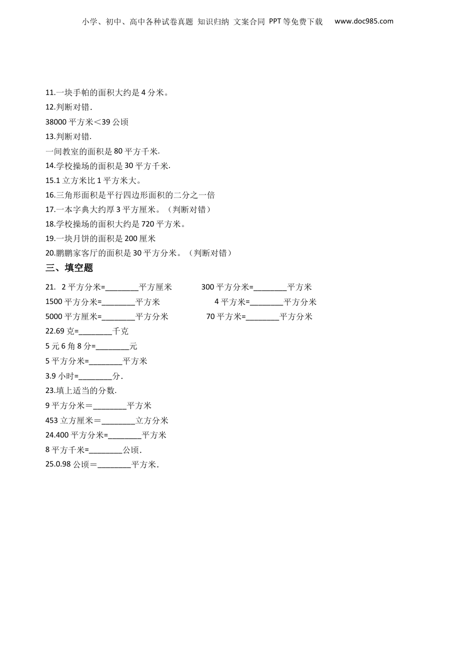 小学、初中、高中各种试卷真题知识归纳文案合同PPT等免费下载www.doc985.com面积、面积单位及换算一、单选题1.妈妈卧室的地面面积有60平方米,丽丽卧室的地面面积有()平方米A.5B.40C.2002.4平方千米=()公顷A.4B.400C.400003.一间房子地面的面积约是()。A.54平方分米B.54平方厘米C.54平方米4.边长1米的正方形,面积是1平方米,也就是()A.100平方厘米B.100平方分米C.10平方分米5.“6平方千米○601公顷”,比较大小,在○里应填的符号是()A.>B.<C.=D.×6.7800平方厘米=()平方分米。A.78B.780C.78007.15平方千米()15000公顷A.>B.=C.<8.300平方分米=()平方米.A.30B.3C.300009.单位换算:(1)2800平方米=________公顷()A.725B.3720C.28100D.3712(2)3时35分=________时()A.725B.3720C.28100D.371210.把两个周长为8cm的正方形拼接在一起,它们的周长减少()A.2cmB.4cmC.8cm二、判断题小学、初中、高中各种试卷真题知识归纳文案合同PPT等免费下载www.doc985.com11.一块手帕的面积大约是4分米。12.判断对错.38000平方米<39公顷13.判断对错.一间教室的面积是80平方千米.14.学校操场的面积是30平方千米.15.1立方米比1平方米大。16.三角形面积是平行四边形面积的二分之一倍17.一本字典大约厚3平方厘米。(判断对错)18.学校操场的面积大约是720平方米。19.一块月饼的面积是200厘米20.鹏鹏家客厅的面积是30平方分米。(判断对错)三、填空题21.2平方分米=________平方厘米300平方分米=________平方米1500平方分米=________平方米4平方米=________平方分米5000平方厘米=________平方分米70平方米=________平方分米22.69克=________千克5元6角8分=________元5平方分米=________平方米3.9小时=________分.23.填上适当的分数.9平方分米=________平方米453立方厘米=________立方分米24.400平方分米=________平方米8平方千米=________公顷.25.0.98公顷=________平方米.小学、初中、高中各种试卷真题知识归纳文案合同PPT等免费下载www.doc985.com26.填表.(从上到下填写)27.3500平方分米=________平方米6.8平方米=________平方分米28.填一填。(1)0.5米=(________)厘米(2)3.5吨=3500(________)(3)4.28立方分米=(________)立方厘米(4)20分米=(________)米(5)18升=(________)立方分米=(________)毫升29.单位换算。14平方米=________平方分米15日=________小时。30.相邻的长度单位间的进率是________,相邻的面积单位之间的进率是________,相邻的体积单位间的进率是________.31.60平方厘米=________平方分米小学、初中、高中各种试卷真题知识归纳文案合同PPT等免费下载www.doc985.com32.看图回答(1)即将建成的中国国家大剧院占地118900平方米,合________公顷.(2)上海东方明珠电视塔占地1.32公顷,合________平方米.33.(2015•湛河区)3时15分=________时480平方米=________公顷.34.想一想,填一填。(1)常用的面积单位有________、________和________。(2)边长是1厘米的正方形,面积是1________。(3)边长是1分米的正方形,面积是1________.(4)边长是1米的正方形,面积是1________35.0.52=________36.用1平方厘米方格平铺用了15格,该图形面积是________平方厘米37.3平方分米=________平方厘米38.8500平方厘米=________平方分米=________平方米39.在横线上填上合适的数:5平方米=________平方分米600平方分米=________平方米4平方分米=________平方厘米7000平方厘米=________平方分米40.1.5平方千米=________公顷四、解答题41.按照从小到大的顺序排列:350平方分米35平方米30000平方厘米3500平方厘米42.写出下面各图形的面积.(每小格为1平方厘米)小学、初中、高中各种试卷真题知识归纳文案合同PPT等免费下载www.doc985.com43.40平方分米里包含着几个50平方厘米?44.在下面边长均为1厘米的方格中画出1平方分米的正方形45.一个正方形的周长是4分米,它的面积是多少?五、应用题46.四个同样大小的正方形拼成了一个面积为100平方厘米的长方形,这个长方形的周长是多少?47.一根铁丝围成了一个长8米,宽4米的长方形,如果用这根铁丝围成...