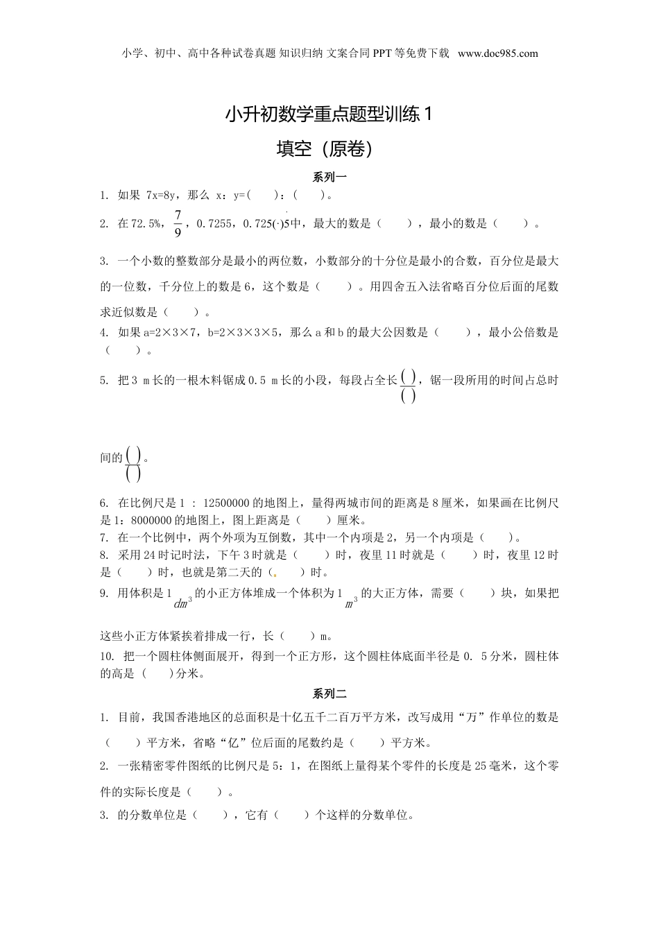 小学、初中、高中各种试卷真题知识归纳文案合同PPT等免费下载www.doc985.com小升初数学重点题型训练1填空(原卷)系列一1.如果7x=8y,那么x:y=():()。2.在72.5%,97,0.7255,0.725(·)·5中,最大的数是(),最小的数是()。3.一个小数的整数部分是最小的两位数,小数部分的十分位是最小的合数,百分位是最大的一位数,千分位上的数是6,这个数是()。用四舍五入法省略百分位后面的尾数求近似数是()。4.如果a=2×3×7,b=2×3×3×5,那么a和b的最大公因数是(),最小公倍数是()。5.把3m长的一根木料锯成0.5m长的小段,每段占全长,锯一段所用的时间占总时间的。6.在比例尺是1:12500000的地图上,量得两城市间的距离是8厘米,如果画在比例尺是1:8000000的地图上,图上距离是()厘米。7.在一个比例中,两个外项为互倒数,其中一个内项是2,另一个内项是()。8.采用24时记时法,下午3时就是()时,夜里11时就是()时,夜里12时是()时,也就是第二天的()时。9.用体积是13dm的小正方体堆成一个体积为13m的大正方体,需要()块,如果把这些小正方体紧挨着排成一行,长()m。10.把一个圆柱体侧面展开,得到一个正方形,这个圆柱体底面半径是0.5分米,圆柱体的高是()分米。系列二1.目前,我国香港地区的总面积是十亿五千二百万平方米,改写成用“万”作单位的数是()平方米,省略“亿”位后面的尾数约是()平方米。2.一张精密零件图纸的比例尺是5:1,在图纸上量得某个零件的长度是25毫米,这个零件的实际长度是()。3.的分数单位是(),它有()个这样的分数单位。小学、初中、高中各种试卷真题知识归纳文案合同PPT等免费下载www.doc985.com4.把一个棱长为2cm的正方体全部锯成棱长为1cm的小正方体,表面积增加了()cm2。5.某班级一次考试的平均分数是70分,其中43的同学及格,他们的平均分是80分,不及格同学的平均分是()分。6.100千克增加20%后是(),()减少25%是75吨。7.数学课上,赵欣做了a道题,周洋做了b道题,已知a>b>2,她俩做的题中都有2道正确,()的正确率高。8.9÷()==75%=24÷()=():249.某药店经营的抗病毒药品,在市场紧缺的情况下提价100%,物价部门查处后,限定其提价的幅度只能是原价的10%,则该药品现在需降价()%。10.一堆水果x千克,卖出3千克后,剩下的平均装在5个筐里,每筐水果()千克。11.一次大型运动会上,工作人员按照3个红气球、2个黄气球、1个绿气球的顺序把气球穿起来装饰运动场,那么第2014个气球是()色的。(填“红”、“黄”或“绿”)12.—个圆柱体,如果把它的高截短6厘米,表面积就减少75.36平方厘米,则体积减少()立方厘米。系列三1.的分数单位是(),再添上()个这样的分数单位就是最小的质数。2.等边三角形有()条对称轴,圆有()条对称轴,半圆有()条对称轴。3.53分米:40厘米的比值是()。4.在比例中,两个外项互为倒数,一个内项是0.3,另一个内项是()。5.两个体积相等,髙也相等的圆柱和圆锥,它们底面积的比值是()。6.车轮的直径一定,所行驶的路程和车轮转数成()比例关系。[来源:学&科&网Z&X&X&K]7.小青坐在教室的第3排第4列,用(4,3)表示,那么小明坐在教室的第5排第2列应当表示为()。8.两个高相等、底面半径之比是1:2的圆柱与圆锥,它们的体积之比是()。9.一次数学测验后,张老师根据某班成绩绘制了如右图所示的扇形统计图(80〜89分的百分比因故模糊不清),若80分以上(含80分)为优秀,则本次测验这个班的优秀率为()。小学、初中、高中各种试卷真题知识归纳文案合同PPT等免费下载www.doc985.com10.把,0.87,0.86,87.5%按从小到大的顺序排列起来是()。11.如下图,下面一系列图形中第一个最小的等腰直角三角形的面积都是1,后一个等腰直角三角形的斜边恰好是前一个等腰直角三角形的直角边的2倍,请计算每个图形的面积,并填在相应的空中。系列四1.0.86中“8”表示(),“6”表示(),这个数的计数单位是(),有()个这样的计数单位。2.0.75=():()=24=15()=()%3.一根水管锯成3段要6分钟,锯成5段要()分钟。4.三个连续偶数的...