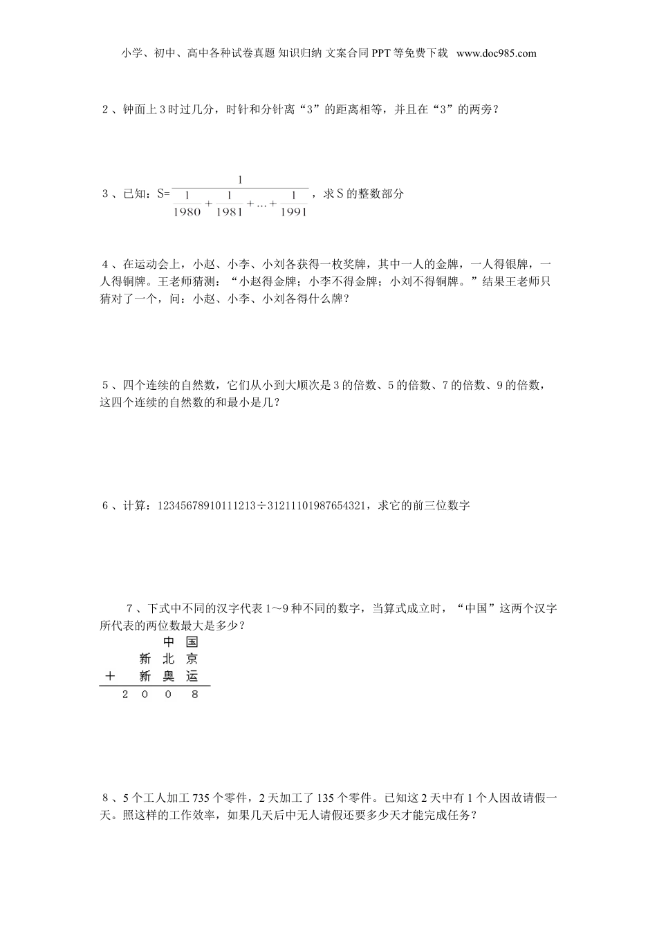 小学、初中、高中各种试卷真题知识归纳文案合同PPT等免费下载www.doc985.com小升初突击训练系列试卷(一)一、计算题:(每题5分,共10分)1、+(+)+(++)+……(++……++)2、(20×1.65-20+×20)×47.5×0.8×2.5二、填空题(每题5分,共25分)1、从北京到G城的特别快车在2000年10月前需用12.6小时,后提速20%。问:提速后,北京到G城的特别快车需要_________小时.2、有四个互不相同的自然数,最大的数与最小的数之差是4,最大的数与最小的数之积是奇数,而这四个数的和是最小的两位奇数,则这四个数的乘积是__________3、在序列19752…中,自第五个数码开始,每个数码都等于它前面的2个数码之和的个位数。试问,在该序列中,______(填“会”或“不会”)出现数码组1234和32694某商品的编号是一个三位数,先有五个三位数:874,765,123,364,925,其中每一个数字与商品的编号恰好在同一位上有一个相同的数字,问:这个三位数是______5、一个整数乘以13后,积的最后三位数是123,那么,这样的整数中最小是_________。三、解答题:(1~7题每题5分,8,9,10题每题10分,共65分)1、甲、乙、丙三所小学学生人数的总和为1999,已知甲校学生人数的2倍、乙校学生人数减3、丙校学生人数加4都是相等的。问:甲、乙、丙各校学生人数是多少?小学、初中、高中各种试卷真题知识归纳文案合同PPT等免费下载www.doc985.com2、钟面上3时过几分,时针和分针离“3”的距离相等,并且在“3”的两旁?3、已知:S=,求S的整数部分4、在运动会上,小赵、小李、小刘各获得一枚奖牌,其中一人的金牌,一人得银牌,一人得铜牌。王老师猜测:“小赵得金牌;小李不得金牌;小刘不得铜牌。”结果王老师只猜对了一个,问:小赵、小李、小刘各得什么牌?5、四个连续的自然数,它们从小到大顺次是3的倍数、5的倍数、7的倍数、9的倍数,这四个连续的自然数的和最小是几?6、计算:12345678910111213÷31211101987654321,求它的前三位数字7、下式中不同的汉字代表1~9种不同的数字,当算式成立时,“中国”这两个汉字所代表的两位数最大是多少?8、5个工人加工735个零件,2天加工了135个零件。已知这2天中有1个人因故请假一天。照这样的工作效率,如果几天后中无人请假还要多少天才能完成任务?小学、初中、高中各种试卷真题知识归纳文案合同PPT等免费下载www.doc985.com9、小明爷爷的年龄是一个二位数,将此二位数的数字交换得到的数就是小明爸爸的年龄又知道他们年龄之差是小明年龄的4倍,求小明的年龄。10、两袋什锦糖,甲袋有8千克奶糖和12千克水果糖混合而成,乙袋有15千克奶糖和5千克水果糖混合而成。如果要使混合成21千克的什锦糖中,奶糖和水果糖各占一半,需从甲、乙两袋里分别取出多少千克的什锦糖?小学、初中、高中各种试卷真题知识归纳文案合同PPT等免费下载www.doc985.com答案一、计算题:1、+(+)+(++)+……(++……++)=0.5+1+1.5+……+19.5=(0.5+19.5)×39÷2=3902、(20×1.65-20+×20)×47.5×0.8×2.5=×(1.65-1+0.35)×(47.5×2)×(0.4×2.5)=(20+)×95=1900+94=1994二、填空题(每题5分,共25分)1、提速后,北京到G城的特别快车需要10.5小时.解:提速后速度变为原来的,根据路程一定时,时间与速度成反比,时间将变成原来的。即所需时间为:12.6×=10.5小时2、这四个数的乘积是30解:最小的两位奇数是11.而11=1+2+3+5,这四个数符合题目中的条件。因此这四个数的乘积是1×2×3×5=303、在该序列中,会出现数码组1234和3269解:此序列中出现的规律是:四奇一偶,即4个数中最多只出现一个偶数,而1234和3269都出现了两个奇数。因此不可能出现这样的组合。4、这个三位数是724解:五个数字,有三个相同,必然有两个是重复的,将5个数字列成一列,观察可发现:这三位数是724小学、初中、高中各种试卷真题知识归纳文案合同PPT等免费下载www.doc985.com5、这样的整数中最小是6123解:一定是13的倍数,而13的倍数满足其后三位与前面隔开,差是13的倍数.123÷13=9……6,那么6123一定是13的倍数,且为满足条件的...
