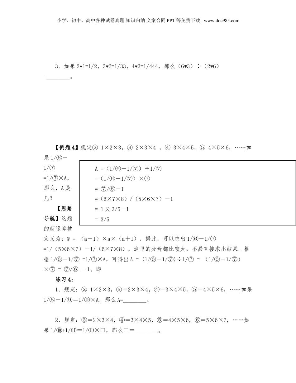小学、初中、高中各种试卷真题知识归纳文案合同PPT等免费下载www.doc985.com第一讲.定义新运算【知识、方法梳理】定义新运算是指运用某种特殊符号来表示特定的意义,从而解答某些算式的一种运算。解答定义新运算,关键是要正确地理解新定义的算式含义,然后严格按照新定义的计算程序,将数值代入,转化为常规的四则运算算式进行计算。定义新运算是一种人为的、临时性的运算形式,它使用的是一些特殊的运算符号,如:*、△、⊙等,这是与四则运算中的“+、-、×、÷”不同的。新定义的算式中有括号的,要先算括号里面的。但它在没有转化前,是不适合于各种运算定律的。【典例精讲】【例题1】假设a*b=(a+b)+(a-b),求13*5和13*(5*4)。【思路导航】这题的新运算被定义为:a*b等于a和b两数之和加上两数之差。这里的“*”就代表一种新运算。在定义新运算中同样规定了要先算小括号里的。因此,在13*(5*4)中,就要先算小括号里的(5*4)。练习1:1.将新运算“*”定义为:a*b=(a+b)×(a-b).。求27*9。13*5=(13+5)+(13-5)=18+8=265*4=(5+4)+(5-4)=1013*(5*4)=13*10=(13+10)+(13-10)=26小学、初中、高中各种试卷真题知识归纳文案合同PPT等免费下载www.doc985.com2.设a*b=a2+2b,那么求10*6和5*(2*8)。3.设a*b=3a-b×1/2,求(25*12)*(10*5)【例题2】设p、q是两个数,规定:p△q=4×q-(p+q)÷2。求3△(4△6)。【思路导航】根据定义先算4△6。在这里“△”是新的运算符号。练习2:1.设p、q是两个数,规定p△q=4×q-(p+q)÷2,求5△(6△4)。2.设p、q是两个数,规定p△q=p2+(p-q)×2。求30△(5△3)。3.设M、N是两个数,规定M*N=M/N+N/M,求10*20-1/4。【例题3】如果1*5=1+11+111+1111+11111,2*4=2+22+222+2222,3*3=3+33+333,4*2=4+44,那么7*4=________;210*2=________。【思路导航】经过观察,可以发现本题的新运算“*”被定义为。因此练习3:1.如果1*5=1+11+111+1111+11111,2*4=2+22+222+2222,3*3=3+33+333,……那么4*4=________。2.规定,那么8*5=________。3△(4△6)=3△【4×6-(4+6)÷2】=3△19=4×19-(3+19)÷2=76-11=657*4=7+77+777+7777=8638210*2=210+210210=210420小学、初中、高中各种试卷真题知识归纳文案合同PPT等免费下载www.doc985.com3.如果2*1=1/2,3*2=1/33,4*3=1/444,那么(6*3)÷(2*6)=________。【例题4】规定②=1×2×3,③=2×3×4,④=3×4×5,⑤=4×5×6,……如果1/⑥-1/⑦=1/⑦×A,那么,A是几?【思路导航】这题的新运算被定义为:@=(a-1)×a×(a+1),据此,可以求出1/⑥-1/⑦=1/(5×6×7)-1/(6×7×8),这里的分母都比较大,不易直接求出结果。根据1/⑥-1/⑦=1/⑦×A,可得出A=(1/⑥-1/⑦)÷1/⑦=(1/⑥-1/⑦)×⑦=⑦/⑥-1。即练习4:1.规定:②=1×2×3,③=2×3×4,④=3×4×5,⑤=4×5×6,……如果1/⑧-1/⑨=1/⑨×A,那么A=________。2.规定:③=2×3×4,④=3×4×5,⑤=4×5×6,⑥=5×6×7,……如果1/⑩+1/⑾=1/⑾×□,那么□=________。A=(1/⑥-1/⑦)÷1/⑦=(1/⑥-1/⑦)×⑦=⑦/⑥-1=(6×7×8)/(5×6×7)-1=1又3/5-1=3/5小学、初中、高中各种试卷真题知识归纳文案合同PPT等免费下载www.doc985.com3.如果1※2=1+2,2※3=2+3+4,……5※6=5+6+7+8+9+10,那么x※3=54中,x=________。【例题5】设a⊙b=4a-2b+1/2ab,求z⊙(4⊙1)=34中的未知数x。【思路导航】先求出小括号中的4⊙1=4×4-2×1+1/2×4×1=16,再根据x⊙16=4x-2×16+1/2×x×16=12x-32,然后解方程12x-32=34,求出x的值。列算式为练习5:1.设a⊙b=3a-2b,已知x⊙(4⊙1)=7求x。2.对两个整数a和b定义新运算“△”:a△b=,求6△4+9△8。3.对任意两个整数x和y定于新运算,“*”:x*y=(其中m是一个确定的整数)。如果1*2=1,那么3*12=________。4⊙1=4×4-2×1+1/2×4×1=16x⊙16=4x-2×16+1/2×x×16=12x-3212x-32=3412x=66x=5.5