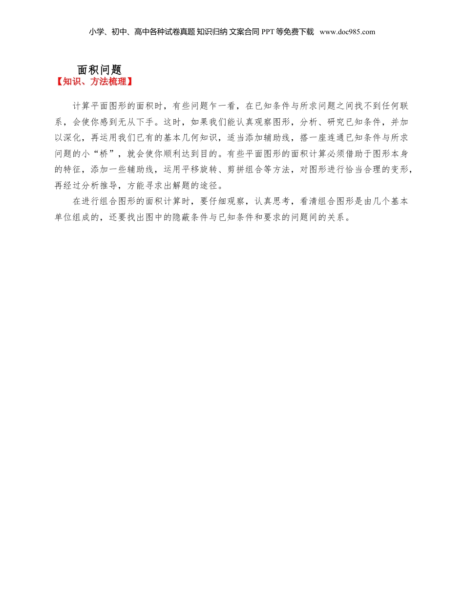 小学、初中、高中各种试卷真题知识归纳文案合同PPT等免费下载www.doc985.com面积问题【知识、方法梳理】计算平面图形的面积时,有些问题乍一看,在已知条件与所求问题之间找不到任何联系,会使你感到无从下手。这时,如果我们能认真观察图形,分析、研究已知条件,并加以深化,再运用我们已有的基本几何知识,适当添加辅助线,搭一座连通已知条件与所求问题的小“桥”,就会使你顺利达到目的。有些平面图形的面积计算必须借助于图形本身的特征,添加一些辅助线,运用平移旋转、剪拼组合等方法,对图形进行恰当合理的变形,再经过分析推导,方能寻求出解题的途径。在进行组合图形的面积计算时,要仔细观察,认真思考,看清组合图形是由几个基本单位组成的,还要找出图中的隐蔽条件与已知条件和要求的问题间的关系。小学、初中、高中各种试卷真题知识归纳文案合同PPT等免费下载www.doc985.com【典例精讲】例题1】已知如图,三角形ABC的面积为8平方厘米,AE=ED,BD=2/3BC,求阴影部分的面积。【思路导航】阴影部分为两个三角形,但三角形AEF的面积无法直接计算。由于AE=ED,连接DF,可知S△AEF=S△EDF(等底等高),采用移补的方法,将所求阴影部分转化为求三角形BDF的面积。因为BD=2/3BC,所以S△BDF=2S△DCF。又因为AE=ED,所以S△ABF=S△BDF=2S△DCF。因此,S△ABC=5S△DCF。由于S△ABC=8平方厘米,所以S△DCF=8÷5=1.6(平方厘米),则阴影部分的面积为1.6×2=3.2(平方厘米)。练习1:1.如图,AE=ED,BC=3BD,S△ABC=30平方厘米。求阴影部分的面积。2.如图所示,AE=ED,DC=1/3BD,S△ABC=21平方厘米。求阴影部分的面积。3.如图所示,DE=1/2AE,BD=2DC,S△EBD=5平方厘米。求三角形ABC的面积。小学、初中、高中各种试卷真题知识归纳文案合同PPT等免费下载www.doc985.com【例题2】两条对角线把梯形ABCD分割成四个三角形,如图所示,已知两个三角形的面积,求另两个三角形的面积各是多少?【思路导航】已知S△BOC是S△DOC的2倍,且高相等,可知:BO=2DO;从S△ABD与S△ACD相等(等底等高)可知:S△ABO等于6,而△ABO与△AOD的高相等,底是△AOD的2倍。所以△AOD的面积为6÷2=3。因为S△ABD与S△ACD等底等高所以S△ABO=6因为S△BOC是S△DOC的2倍所以△ABO是△AOD的2倍所以△AOD=6÷2=3。答:△AOD的面积是3。练习2:1.两条对角线把梯形ABCD分割成四个三角形,(如图所示),已知两个三角形的面积,求另两个三角形的面积是多少?2.已知AO=1/3OC,求梯形ABCD的面积(如图所示)。3.已知三角形AOB的面积为15平方厘米,线段OB的长度为OD的3倍。求梯形ABCD的面积。(如图所示)。小学、初中、高中各种试卷真题知识归纳文案合同PPT等免费下载www.doc985.com【例题3】四边形ABCD的对角线BD被E、F两点三等分,且四边形AECF的面积为15平方厘米。求四边形ABCD的面积(如图所示)。【思路导航】由于E、F三等分BD,所以三角形ABE、AEF、AFD是等底等高的三角形,它们的面积相等。同理,三角形BEC、CEF、CFD的面积也相等。由此可知,三角形ABD的面积是三角形AEF面积的3倍,三角形BCD的面积是三角形CEF面积的3倍,从而得出四边形ABCD的面积是四边形AECF面积的3倍。15×3=45(平方厘米)答:四边形ABCD的面积为45平方厘米。练习3:1.四边形ABCD的对角线BD被E、F、G三点四等分,且四边形AECG的面积为15平方厘米。求四边形ABCD的面积(如图)。2.已知四边形ABCD的对角线被E、F、G三点四等分,且阴影部分面积为15平方厘米。求四边形ABCD的面积(如图所示)。3.如图所示,求阴影部分的面积(ABCD为正方形)。【例题4】如图所示,BO=2DO,阴影部分的面积是4平方厘米。那么,梯形ABCD的面积是多少平方厘米?小学、初中、高中各种试卷真题知识归纳文案合同PPT等免费下载www.doc985.com【思路导航】因为BO=2DO,取BO中点E,连接AE。根据三角形等底等高面积相等的性质,可知S△DBC=S△CDA;S△COB=S△DOA=4,类推可得每个三角形的面积。所以,S△CDO=4÷2=2(平方厘米)S△DAB=4×3=12平方厘米S梯形ABCD=12+4+2=18(平方厘米)答:梯形ABCD的面积是18平方厘米。练...