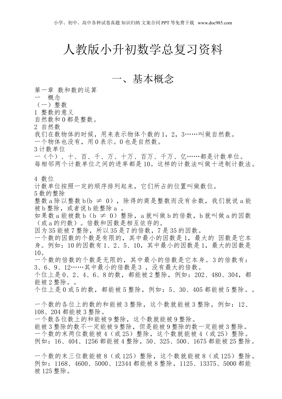 小学、初中、高中各种试卷真题知识归纳文案合同PPT等免费下载www.doc985.com人教版小升初数学总复习资料一、基本概念第一章数和数的运算一概念(一)整数1整数的意义自然数和0都是整数。2自然数我们在数物体的时候,用来表示物体个数的1,2,3……叫做自然数。一个物体也没有,用0表示。0也是自然数。3计数单位一(个)、十、百、千、万、十万、百万、千万、亿……都是计数单位。每相邻两个计数单位之间的进率都是10。这样的计数法叫做十进制计数法。4数位计数单位按照一定的顺序排列起来,它们所占的位置叫做数位。5数的整除整数a除以整数b(b≠0),除得的商是整数而没有余数,我们就说a能被b整除,或者说b能整除a。如果数a能被数b(b≠0)整除,a就叫做b的倍数,b就叫做a的因数(或a的约数)。倍数和因数是相互依存的。因为35能被7整除,所以35是7的倍数,7是35的因数。一个数的因数的个数是有限的,其中最小的因数是1,最大的因数是它本身。例如:10的因数有1、2、5、10,其中最小的因数是1,最大的因数是10。一个数的倍数的个数是无限的,其中最小的倍数是它本身。3的倍数有:3、6、9、12……其中最小的倍数是3,没有最大的倍数。个位上是0、2、4、6、8的数,都能被2整除,例如:202、480、304,都能被2整除。。个位上是0或5的数,都能被5整除,例如:5、30、405都能被5整除。。一个数的各位上的数的和能被3整除,这个数就能被3整除,例如:12、108、204都能被3整除。一个数各位数上的和能被9整除,这个数就能被9整除。能被3整除的数不一定能被9整除,但是能被9整除的数一定能被3整除。一个数的末两位数能被4(或25)整除,这个数就能被4(或25)整除。例如:16、404、1256都能被4整除,50、325、500、1675都能被25整除。一个数的末三位数能被8(或125)整除,这个数就能被8(或125)整除。例如:1168、4600、5000、12344都能被8整除,1125、13375、5000都能被125整除。小学、初中、高中各种试卷真题知识归纳文案合同PPT等免费下载www.doc985.com能被2整除的数叫做偶数。不能被2整除的数叫做奇数。0也是偶数。自然数按能否被2整除的特征可分为奇数和偶数。一个数,如果只有1和它本身两个因数,这样的数叫做质数(或素数),100以内的质数有:2、3、5、7、11、13、17、19、23、29、31、37、41、43、47、53、59、61、67、71、73、79、83、89、97。一个数,如果除了1和它本身还有别的因数,这样的数叫做合数,例如4、6、8、9、12都是合数。1不是质数也不是合数,自然数除了1外,不是质数就是合数。如果把自然数按其因数的个数的不同分类,可分为质数、合数和1。每个合数都可以写成几个质数相乘的形式。其中每个质数都是这个合数的因数,叫做这个合数的质因数,例如15=3×5,3和5叫做15的质因数。把一个合数用质因数相乘的形式表示出来,叫做分解质因数。例如把28分解质因数几个数公有的因数,叫做这几个数的公因数。其中最大的一个,叫做这几个数的最大公因数,例如12的因数有1、2、3、4、6、12;18的因数有1、2、3、6、9、18。其中,1、2、3、6是12和18的公因数,6是它们的最大公因数。公因数只有1的两个数,叫做互质数,成互质关系的两个数,有下列几种情况:1和任何自然数互质。相邻的两个自然数互质。两个不同的质数互质。当合数不是质数的倍数时,这个合数和这个质数互质。两个合数的公因数只有1时,这两个合数互质,如果几个数中任意两个都互质,就说这几个数两两互质。如果较小数是较大数的因数,那么较小数就是这两个数的最大公因数。如果两个数是互质数,它们的最大公因数就是1。几个数公有的倍数,叫做这几个数的公倍数,其中最小的一个,叫做这几个数的最小公倍数,如2的倍数有2、4、6、8、10、12、14、16、18……3的倍数有3、6、9、12、15、18……其中6、12、18……是2、3的公倍数,6是它们的最小公倍数。。如果较大数是较小数的倍数,那么较大数就是这两个数的最小公倍数。如果两个数是互质数,那么这两个数的积就是它们的最小公倍数。几个数的公因数的个数是有限的,而几个数的公倍数的个数是无限的。(二)小数1小数的意义把整数1平均分成10份、100份、1000份……...