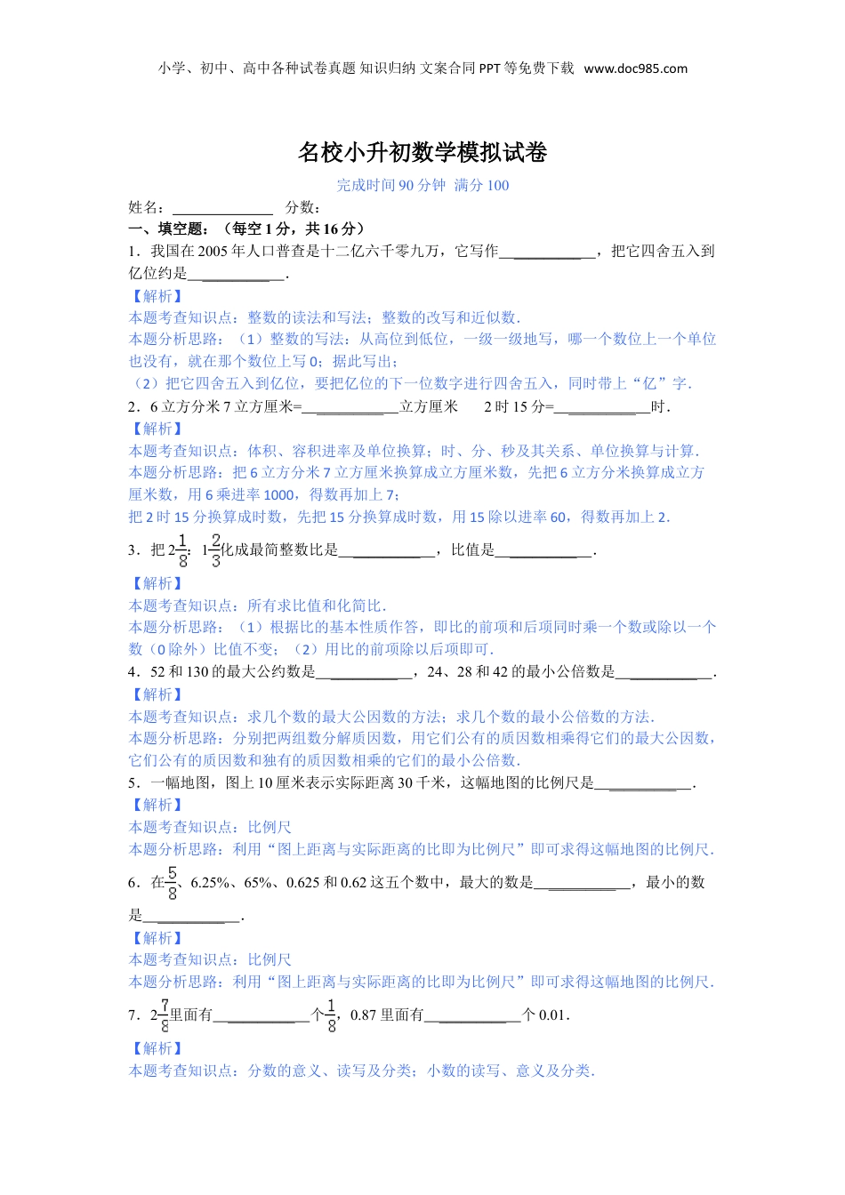 小学、初中、高中各种试卷真题知识归纳文案合同PPT等免费下载www.doc985.com名校小升初数学模拟试卷完成时间90分钟满分100姓名:分数:一、填空题:(每空1分,共16分)1.我国在2005年人口普查是十二亿六千零九万,它写作_________,把它四舍五入到亿位约是_________.【解析】本题考查知识点:整数的读法和写法;整数的改写和近似数.本题分析思路:(1)整数的写法:从高位到低位,一级一级地写,哪一个数位上一个单位也没有,就在那个数位上写0;据此写出;(2)把它四舍五入到亿位,要把亿位的下一位数字进行四舍五入,同时带上“亿”字.2.6立方分米7立方厘米=_________立方厘米2时15分=_________时.【解析】本题考查知识点:体积、容积进率及单位换算;时、分、秒及其关系、单位换算与计算.本题分析思路:把6立方分米7立方厘米换算成立方厘米数,先把6立方分米换算成立方厘米数,用6乘进率1000,得数再加上7;把2时15分换算成时数,先把15分换算成时数,用15除以进率60,得数再加上2.3.把2:1化成最简整数比是_________,比值是_________.【解析】本题考查知识点:所有求比值和化简比.本题分析思路:(1)根据比的基本性质作答,即比的前项和后项同时乘一个数或除以一个数(0除外)比值不变;(2)用比的前项除以后项即可.4.52和130的最大公约数是_________,24、28和42的最小公倍数是_________.【解析】本题考查知识点:求几个数的最大公因数的方法;求几个数的最小公倍数的方法.本题分析思路:分别把两组数分解质因数,用它们公有的质因数相乘得它们的最大公因数,它们公有的质因数和独有的质因数相乘的它们的最小公倍数.5.一幅地图,图上10厘米表示实际距离30千米,这幅地图的比例尺是_________.【解析】本题考查知识点:比例尺本题分析思路:利用“图上距离与实际距离的比即为比例尺”即可求得这幅地图的比例尺.6.在、6.25%、65%、0.625和0.62这五个数中,最大的数是_________,最小的数是_________.【解析】本题考查知识点:比例尺本题分析思路:利用“图上距离与实际距离的比即为比例尺”即可求得这幅地图的比例尺.7.2里面有_________个,0.87里面有_________个0.01.【解析】本题考查知识点:分数的意义、读写及分类;小数的读写、意义及分类.小学、初中、高中各种试卷真题知识归纳文案合同PPT等免费下载www.doc985.com本题分析思路:(1)把化成假分数,看分子是几就含有几个;(2)0.87里面有多少个0.01,用0.87÷0.01即可解答.8.一个圆锥体,底面周长是12.56厘米,高2.4厘米,它的体积是_________立方厘米.【解析】本题考查知识点:比例尺本题分析思路:利用“图上距离与实际距离的比即为比例尺”即可求得这幅地图的比例尺.9.除数是,被除数与商的差是14,被除数是_________.【解析】本题考查知识点:分数的四则混合运算;加法和减法的关系.本题分析思路:依据一个不为0的数除以一个小于1且大于0的数,商大于被除数,以及除数是5/7<1,可设被除数是x,那么商就是x+14,依据被除数=除数×商可列方程:x=5/7×(x+14),依据等式的性质即可求解.10.一个长方体,如果高增加2厘米就成了正方体,而且表面积要增加56平方厘米,原来这个长方体的体积是_________.【解析】本题考查知识点:长方体和正方体的表面积;长方体和正方体的体积.本题分析思路:根据题意可知,一个长方体如果高增加2厘米,就变成了一个正方体;说明长和宽相等且比高大2厘米,因此增加的56平方厘米是4个同样的长方形的面积和;由此可以求长方体的长=(56÷4)÷2=7厘米,由于长比高多2厘米,那么高=7﹣2=5厘米,由此解答.二、判断(每题1分共4分)对的打∨,错的打×11.X=0.8是方程3X﹣1.6=0.8的解._________.(判断对错)【解析】本题考查知识点:方程的解和解方程.本题分析思路:把x=0.8代入方程,看左边和右边是否相等,如果相等则x=0.8是方程的解,不相等就不是方程的解.12.时间一定,路程和速度成正比例._________.(判断对错)【解析】本题考查知识点:辨识成正比例的量与成反比例的量.本题分析思路:由“速度×时间=路程”可得“(定值)”,从而...