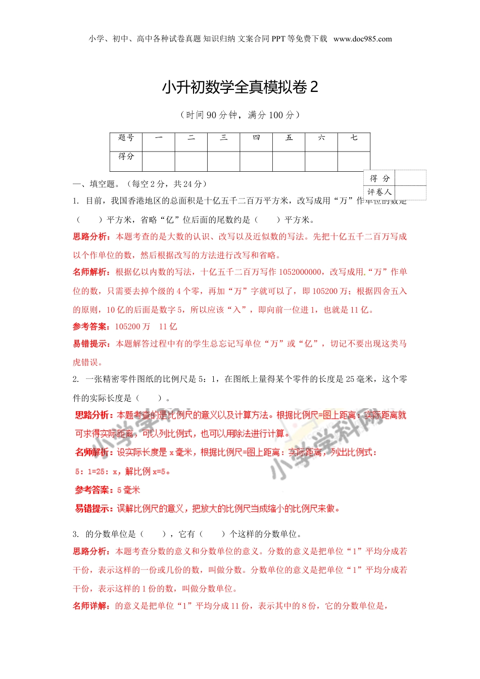 小学、初中、高中各种试卷真题知识归纳文案合同PPT等免费下载www.doc985.com小升初数学全真模拟卷2(时间90分钟,满分100分)—、填空题。(每空2分,共24分)1.目前,我国香港地区的总面积是十亿五千二百万平方米,改写成用“万”作单位的数是()平方米,省略“亿”位后面的尾数约是()平方米。思路分析:本题考查的是大数的认识、改写以及近似数的写法。先把十亿五千二百万写成以个作单位的数,然后根据改写的方法进行改写和省略。名师解析:根据亿以内数的写法,十亿五千二百万写作1052000000,改写成用“万”作单位的数,只需要去掉个级的4个零,再加“万”字就可以了,即105200万;根据四舍五入的原则,10亿的后面是数字5,所以应该“入”,即向前一位进1,也就是11亿。参考答案:105200万11亿易错提示:本题解答过程中有的学生总忘记写单位“万”或“亿”,切记不要出现这类马虎错误。2.一张精密零件图纸的比例尺是5:1,在图纸上量得某个零件的长度是25毫米,这个零件的实际长度是()。3.的分数单位是(),它有()个这样的分数单位。思路分析:本题考查分数的意义和分数单位的意义。分数的意义是把单位“1”平均分成若干份,表示这样的一份或几份的数,叫做分数。分数单位的意义是把单位“1”平均分成若干份,表示这样的1份的数,叫做分数单位。名师详解:的意义是把单位“1”平均分成11份,表示其中的8份,它的分数单位是,题号一二三四五六七得分得分评卷人小学、初中、高中各种试卷真题知识归纳文案合同PPT等免费下载www.doc985.com它有8个这样的分数单位。参考答案:8易错提示:要清楚分数单位的意义。4.把一个棱长为2cm的正方体全部锯成棱长为1cm的小正方体,表面积增加了()cm2。思路分析:本题主要考查了正方体表面积的求法。名师详解:一个正方体有6个面,当把一个棱长为2cm的正方体全部锯成棱长为1cm的小正方体后,增加了24个棱长为1cm小正方形的面积,也就是24平方厘米。参考答案:24易错提示:知道正方体锯开后表面积增加了。5.某班级一次考试的平均分数是70分,其中的同学及格,他们的平均分是80分,不及格同学的平均分是()分。思路分析:本题考查的知识点是平均数的应用。名师详解:解决此类型的题目可以使用假设法,通过假设总人数,再依据及格人数算出总分及格的总分,据此算出不及格人数的总分,最后算出不及格人数的平均分。用假设法,假设有40人,40×=30(人),70×40-30×80=400(分),400÷(40-30)=40(分);或70×4-80×3=40(分);也可使用方程解。参考答案:40易错提示:熟练掌握平均数的计算方法。6.100千克增加20%后是(),()减少25%是75吨。思路分析:本题主要考查了百分数的应用。名师详解:根据题意,要求100千克增加20%后是多少,把100千克看作单位“1”,增加后的数就是100×(1+20%)=120(千克);要求减少25%是75的数,是把这个数看作单位“1”,75吨占了(1-25%),用75÷(1-25%)=100(吨)。参考答案:120千克;100吨易错提示:解决本题关键是区分两个不同的单位“1”。7.数学课上,赵欣做了a道题,周洋做了b道题,已知a>b>2,她俩做的题中都有2道正确,()的正确率高。小学、初中、高中各种试卷真题知识归纳文案合同PPT等免费下载www.doc985.com思路分析:本题考查分数大小的比较方法。分数大小比较时,主要涉及的都是两种方法:一、化成同分母分数比较,分母相同时,分子越大,分数越大。二、化成同分子分数比较,分子相同时,分母越小,分数越大。正确率是正确的题目数占总题数的百分比。本题先表示出两位同学的正确率,再比较。名师详解:赵欣做了a道题,2道正确,他的正确率是;周洋做了b道题,2道正确,正确率是,和分子相同,又有a>b>2,所以<,即周洋的正确率高。参考答案:周洋易错提示:切记分母相同时,分子越大,分数越大;分子相同时,分母越小,分数越大。8.9÷()==75%=24÷()=():24思路分析:本题主要考查除法、分数、百分数和比之间的关系。首先把百分数转化成分数,并化成最简分数,再根据除法与分数之间的关系,根据分子转化成被除数乘几,分母也乘几转成除数,接着根据分数与比之间...