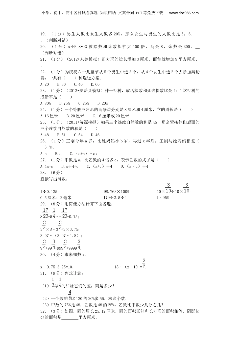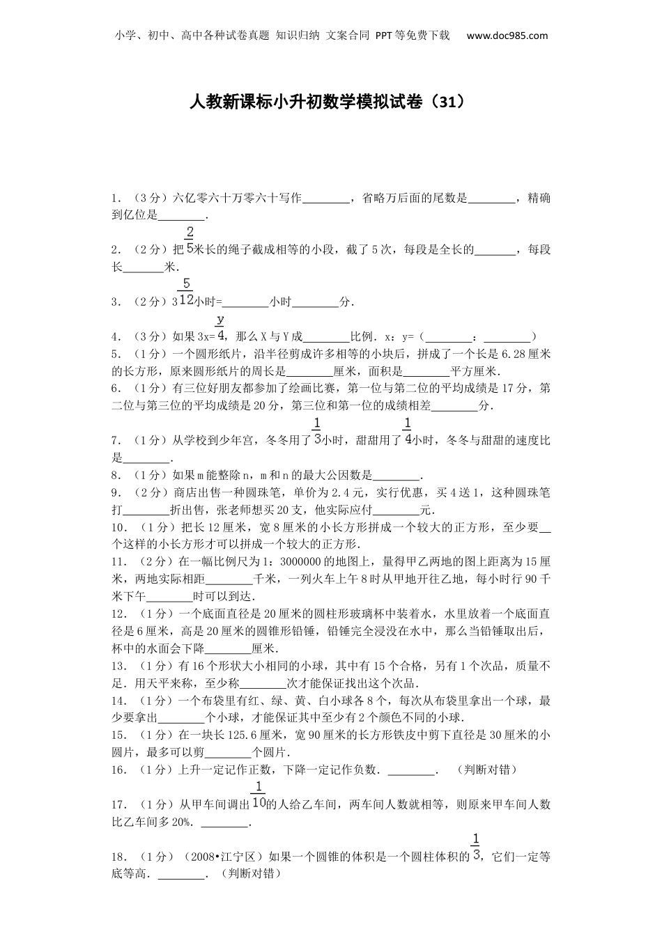 小学、初中、高中各种试卷真题知识归纳文案合同PPT等免费下载www.doc985.com人教新课标小升初数学模拟试卷(31)1.(3分)六亿零六十万零六十写作,省略万后面的尾数是,精确到亿位是.2.(2分)把米长的绳子截成相等的小段,截了5次,每段是全长的,每段长米.3.(2分)3小时=小时分.4.(3分)如果3x=,那么X与Y成比例.x:y=(:)5.(1分)一个圆形纸片,沿半径剪成许多相等的小块后,拼成了一个长是6.28厘米的长方形,原来圆形纸片的周长是厘米,面积是平方厘米.6.(1分)有三位好朋友都参加了绘画比赛,第一位与第二位的平均成绩是17分,第二位与第三位的平均成绩是20分,第三位和第一位的成绩相差分.7.(1分)从学校到少年宫,冬冬用了小时,甜甜用了小时,冬冬与甜甜的速度比是.8.(1分)如果m能整除n,m和n的最大公因数是.9.(2分)商店出售一种圆珠笔,单价为2.4元,实行优惠,买4送1,这种圆珠笔打折出售,张老师想买20支,他实际应付元.10.(1分)把长12厘米,宽8厘米的小长方形拼成一个较大的正方形,至少要个这样的小长方形才可以拼成一个较大的正方形.11.(2分)在一幅比例尺为1:3000000的地图上,量得甲乙两地的图上距离为15厘米,两地实际相距千米,一列火车上午8时从甲地开往乙地,每小时行90千米下午时可以到达.12.(1分)一个底面直径是20厘米的圆柱形玻璃杯中装着水,水里放着一个底面直径是6厘米,高是20厘米的圆锥形铅锤,铅锤完全浸没在水中,那么当铅锤取出后,杯中的水面会下降厘米.13.(1分)有16个形状大小相同的小球,其中有15个合格,另有1个次品,质量不足.用天平来称,至少称次才能保证找出这个次品.14.(1分)一个布袋里有红、绿、黄、白小球各8个,每次从布袋里拿出一个球,最少要拿出个小球,才能保证其中至少有2个颜色不同的小球.15.(1分)在一块长125.6厘米,宽90厘米的长方形铁皮中剪下直径是30厘米的小圆片,最多可以剪个圆片.16.(1分)上升一定记作正数,下降一定记作负数..(判断对错)17.(1分)从甲车间调出的人给乙车间,两车间人数就相等,则原来甲车间人数比乙车间多20%..18.(1分)(2008•江宁区)如果一个圆锥的体积是一个圆柱体积的,它们一定等底等高..(判断对错)小学、初中、高中各种试卷真题知识归纳文案合同PPT等免费下载www.doc985.com19.(1分)男生人数比女生人数多20%,那么女生与男生的人数比是5:6..(判断对错)20.(1分)A÷B=8…3被除数和除数都扩大100倍,商是8,余数是300.(判断对错)21.(1分)(2012•东莞模拟)正方形的边长增加3厘米,面积就增加9平方厘米..22.(1分)为庆祝六一儿童节从5个男生中选3个,从4个女生中选2个去参加辩论赛,一共有()种选送方案.A.20B.30C.40D.6023.(1分)(2012•安岳县模拟)种一批树,成活棵数和死去棵数比是4:1这批树的成活率是()A.80%B.75%C.25%D.20%24.(1分)一个等腰三角形的两条边分别是8厘米和4厘米,它的周长是()A.16厘米B.20厘米C.16厘米或20厘米25.(1分)(2011•济源模拟)如果三个连续自然数的和是45,那么紧接他们后面的三个连续自然数的和是()A.48B.51C.54D.4626.(1分)王刚今年a岁,比她妈妈小b岁,再过x年后,王刚与她妈妈相差()岁.A.bB.aC.(a+b)﹣ax27.(1分)甲数是a,比乙数的4倍多c,表示乙数的式子是()A.4a+cB.a÷4+cC.(a+c)÷4D.(a﹣c)÷428.(6分)直接写出得数:1÷0.125=98.763×100%=10×÷10×=0.5厘米:2毫米=179÷2.5÷4=1﹣95%=29.(8分)用简便方法计算下面各题:8+5﹣6+0.75;3×8﹣3+3×3.75;3.07﹣(3.07﹣1.8);9+99+999+9999.30.(4分)求未知数x.x﹣0.75+3.25=10;18﹕(x﹣1)=.31.(9分)列式计算:(1)与的和除它们的差,商是多少?(2)一个数的比120的20%多56,求这个数.(3)甲数的75%是48,乙数是48的25%,乙数比甲数少几分之几?32.(3分)如图,圆的周长25.12厘米,圆的面积正好和长方形的面积相等,阴影部分的面积是平方厘米.小学、初中、高中各种试卷真题知识归纳文案合同PPT等免费下载www.doc985.com33.(5分)(2003•丰...