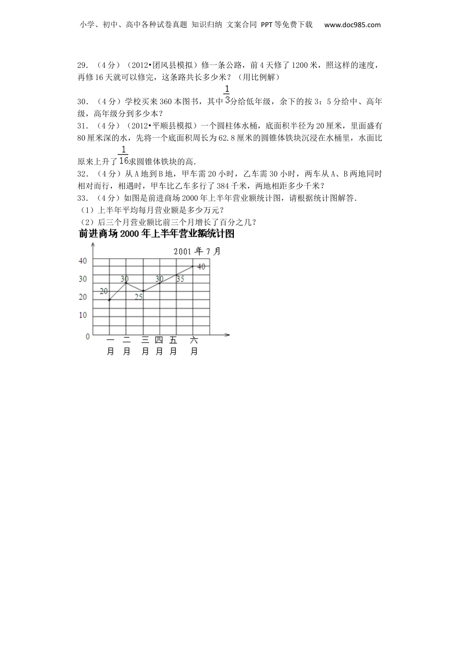 小学、初中、高中各种试卷真题知识归纳文案合同PPT等免费下载www.doc985.com人教新课标小升初数学模拟试卷(30)1.(2分)(2012•团风县模拟)三千零六万四千五百写作,改写成用“万”作单位的数是万.2.(2分)(2008•邗江区)8和20的最大公约数是,最小公倍数是.3.(1分)1.8的倒数是.4.(3分)3小时24分=小时;4平方米=平方米平方分米.5.(2分)(2012•团风县模拟)在4,4.6,4.62和46.2%中,最小的数是最大的数是.6.(1分)1.2除以0.9,除到十分位,商约是.7.(1分)顶角是120度的等腰三角形的一个底角是.8.(1分)8:2化成最简整数比是,比值是.9.(1分)1添上个它的分数单位后是最小的质数.10.(1分)一根绳子截去后,还剩8米,这根绳子长米.11.(1分)(2012•团风县模拟)某班男生人数是女生人数的,女生人数比男生人数多%.12.(1分)一个圆柱体侧面展开后是一个周长为25.12厘米的正方形,这个圆柱体的体积是立方厘米.13.(1分)(2012•金沙县)比的前项一定,后项和比值成反比例..(判断对错)14.(1分)(2007•沂水县)所有的整数都有倒数..15.(1分)(2013•芜湖县)一种商品,先提价10%,再降价10%,售价与原价相等..(判断对错)16.(1分)实际距离一定,图上距离和比例尺()A.成正比例B.成反比例C.不成比例17.(1分)(2010•东莞)从()中能清楚地看出数量增减变化的情况.A.条形统计图B.折线统计图C.扇形统计图18.(1分)(2009•泸西县模拟)等底等高的圆柱体比圆锥体体积()A.大B.大2倍C.小19.(1分)下图中有4种形状不同的硬纸,把它们照虚线折叠,()不能折成立方体.小学、初中、高中各种试卷真题知识归纳文案合同PPT等免费下载www.doc985.comA.B.C.D.20.(8分)直接写出得数.3.6﹣1=2+2.25=(﹣)×30=×3.14+3.14×=1÷×8=77×=1×4﹣0×4=15.2×(﹣1÷3)=21.(6分)求未知数.x﹣5=10;:0.5=1:x;=.22.(18分)递等式计算(能简便的要写出简便过程).(1)0.8+4++5;(2)2.05﹣0.81÷2.7×4.5;(3)10.625×2005+2005×﹣2005;(4)÷(1﹣×)+;(5)8÷[4.6+1×(4﹣1.15)];(6)9.8﹣(+2.4×2).23.(6分)列式计算.(1)48减去1.2的5倍,所得的差再除以0.2,商是多少?(2)一个数的减去12.5的,差是,求这个数.(用方程解)24.(4分)求阴影部分的面积.25.(3分)一堆煤,烧去后还剩下15吨,这堆煤有多少吨?26.(3分)洗衣机的价格从每台800元降到每台720元,价格降低了百分之几?27.(4分)甲、乙两车从A、B两地同时相向而行,甲车每小时行60千米,乙车每小时比甲车多行,3小时后两车相遇,A、B两地相距多少千米?28.(4分)(2012•团风县模拟)一堆煤原计划每天烧4吨,可烧72天,由于改进炉灶,实际每天烧3.2吨,这堆煤可多烧多少天?小学、初中、高中各种试卷真题知识归纳文案合同PPT等免费下载www.doc985.com29.(4分)(2012•团风县模拟)修一条公路,前4天修了1200米,照这样的速度,再修16天就可以修完,这条路共长多少米?(用比例解)30.(4分)学校买来360本图书,其中分给低年级,余下的按3:5分给中、高年级,高年级分到多少本?31.(4分)(2012•平顺县模拟)一个圆柱体水桶,底面积半径为20厘米,里面盛有80厘米深的水,先将一个底面积周长为62.8厘米的圆锥体铁块沉浸在水桶里,水面比原来上升了求圆锥体铁块的高.32.(4分)从A地到B地,甲车需20小时,乙车需30小时,两车从A、B两地同时相对而行,相遇时,甲车比乙车多行了384千米,两地相距多少千米?33.(4分)如图是前进商场2000年上半年营业额统计图,请根据统计图解答.(1)上半年平均每月营业额是多少万元?(2)后三个月营业额比前三个月增长了百分之几?小学、初中、高中各种试卷真题知识归纳文案合同PPT等免费下载www.doc985.com参考答案1.30064500,3006.45.【解析】试题分析:这是一个八位数,最高位是千万位,千万位上3,万位上是6,千位上是4,百位上是5,写这个数时,从高位到低位,一级一级地写,哪一个数位上一个单位也没有,就在那个数位上写0;改成用万作单位的数,就是在...