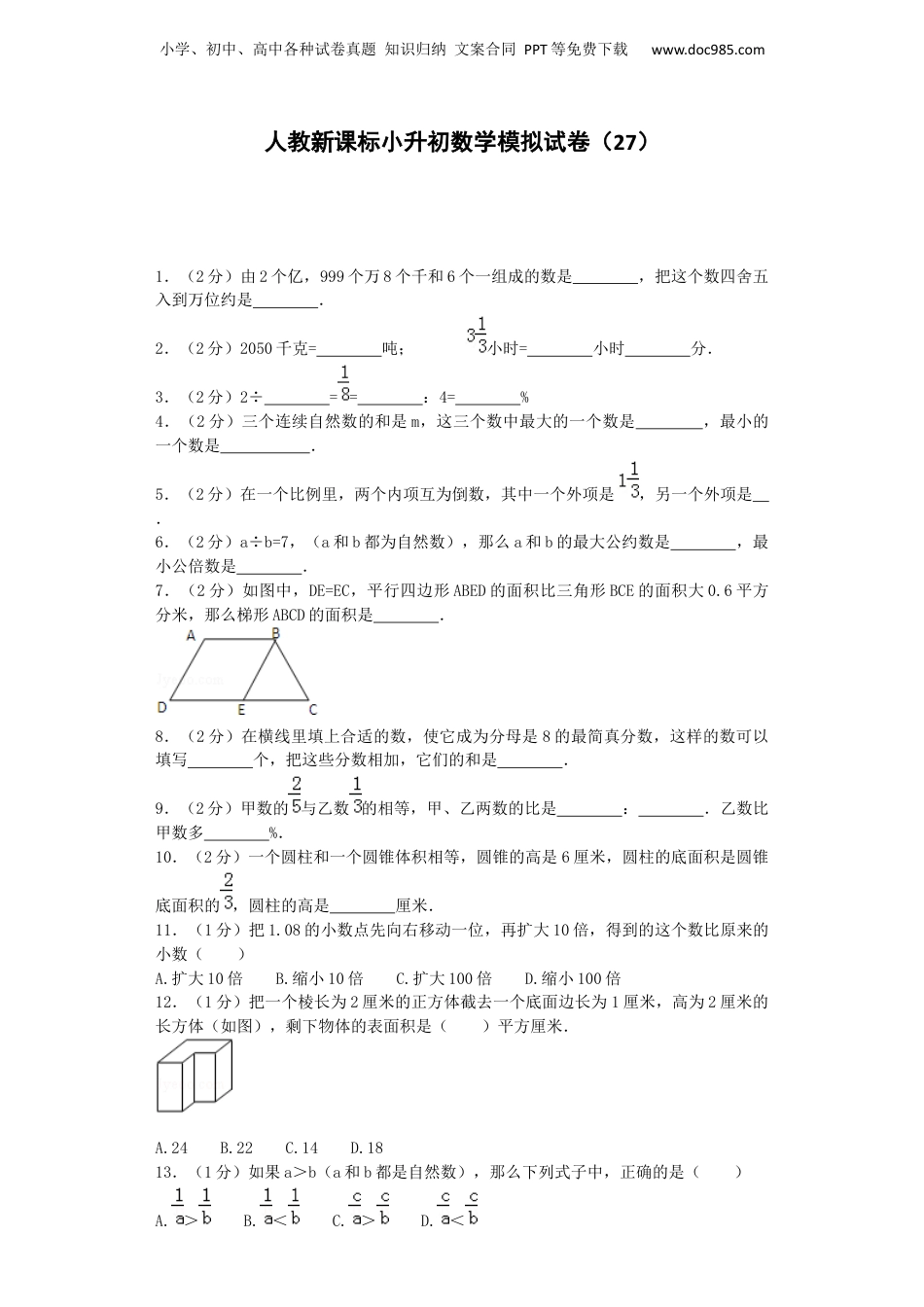 小学、初中、高中各种试卷真题知识归纳文案合同PPT等免费下载www.doc985.com人教新课标小升初数学模拟试卷(27)1.(2分)由2个亿,999个万8个千和6个一组成的数是,把这个数四舍五入到万位约是.2.(2分)2050千克=吨;小时=小时分.3.(2分)2÷==:4=%4.(2分)三个连续自然数的和是m,这三个数中最大的一个数是,最小的一个数是.5.(2分)在一个比例里,两个内项互为倒数,其中一个外项是,另一个外项是.6.(2分)a÷b=7,(a和b都为自然数),那么a和b的最大公约数是,最小公倍数是.7.(2分)如图中,DE=EC,平行四边形ABED的面积比三角形BCE的面积大0.6平方分米,那么梯形ABCD的面积是.8.(2分)在横线里填上合适的数,使它成为分母是8的最简真分数,这样的数可以填写个,把这些分数相加,它们的和是.9.(2分)甲数的与乙数的相等,甲、乙两数的比是:.乙数比甲数多%.10.(2分)一个圆柱和一个圆锥体积相等,圆锥的高是6厘米,圆柱的底面积是圆锥底面积的,圆柱的高是厘米.11.(1分)把1.08的小数点先向右移动一位,再扩大10倍,得到的这个数比原来的小数()A.扩大10倍B.缩小10倍C.扩大100倍D.缩小100倍12.(1分)把一个棱长为2厘米的正方体截去一个底面边长为1厘米,高为2厘米的长方体(如图),剩下物体的表面积是()平方厘米.A.24B.22C.14D.1813.(1分)如果a>b(a和b都是自然数),那么下列式子中,正确的是()A.>B.<C.>D.<小学、初中、高中各种试卷真题知识归纳文案合同PPT等免费下载www.doc985.com14.(1分)一列火车从甲城到乙城,由原来需要行驶10小时,缩短到现在只需要行驶8小时,这列火车的速度提高了()A.25%B.20%C.80%D.125%15.(1分)下列各数中,()的两个数不是互质数.A.13和91B.1和24C.37和44D.50和6116.(1分)(2012•思明区)5吨的和1吨的重量相等..17.(1分)如果a=(a和b不等于0),那么a和b成反比列..(判断对错)18.(1分)一个梯形的上底乘高等于6,下底乘高等于9,那么这个梯形的面积是7.5..(判断对错)19.(1分)一种商品打八折出售,就是现价比原价便宜20%..20.(1分)把5克盐放入100克水中,这时盐与盐水的比是1:20..(判断对错)21.(8分)直接写出得数:56.8﹣43.2==(0.9+0.1)÷1==200÷25÷4=1=1.89×(0.6﹣)=4.8×0.02=22.(4分)求未知数x:(1)0.4x﹣=7.6;(2)5%:x=:0.8.23.(12分)用递等式计算:(怎样简便就怎样算)(1)2÷﹣÷2;(2)4×0.75+×7.25;(3)﹣0.75×;(4)5﹣(3÷0.7×+);(5)3﹣(0.2+)×4.5;(6)×[(2.75﹣1.5)÷+2].24.(4分)列式计算:(1)18的25%加1除以1.2的商,和是多少?(2)2.7比一个数的少3.5,这个数是多少?25.(3分)图形计算:已知三角形ABC的面积是22.4平方厘米,高是5.6厘米,求图中阴影部分的面积.(π取3.14)小学、初中、高中各种试卷真题知识归纳文案合同PPT等免费下载www.doc985.com26.(4分)只列综合算式,不必计算:(1)某制药厂承接生产一批消毒液的任务,计划每天生产1.25吨,16天完成,由于时间紧迫,这批消毒液必须在10天内完成,实际每天多生产多少吨?(2)工地上有一批水泥,第一次用去了这批水泥的25%,正好是18吨,第二次再用去一部分水泥后,还剩下这批水泥的,这批水泥还剩下多少吨?27.(3分)去年小瑛的爸爸单位发年终奖,扣除奖金税160元后,实得奖金3040元,奖金的征税率是多少?28.(4分)下面是某商场2002年四个季度营业额收入情况统计表.季度一二三四营业额收入(万元)865.2573.3801.9812.4①请你计算出2002年平均每月营业额多少万元?②预测2003年平均每月营业额可递增5%,2003年平均每月营业额可达到多少万元?29.(4分)如图是一幅地图的线段比例尺.①写出这幅地图的图上距离与实际距离的比.②如果从这幅地图上量得A、B两城市高速公路长7.5厘米,那么A、B两城市的高速公路实际长度是多少?30.(3分)有一堆体积是3.6立方米的沙子,把它倒入一个长6米,宽3米的长方体跳远沙坑里,按要求沙的厚度为30厘米.问这堆沙子倒入沙坑后能否达到要求?如果不够还差多少沙子?31...