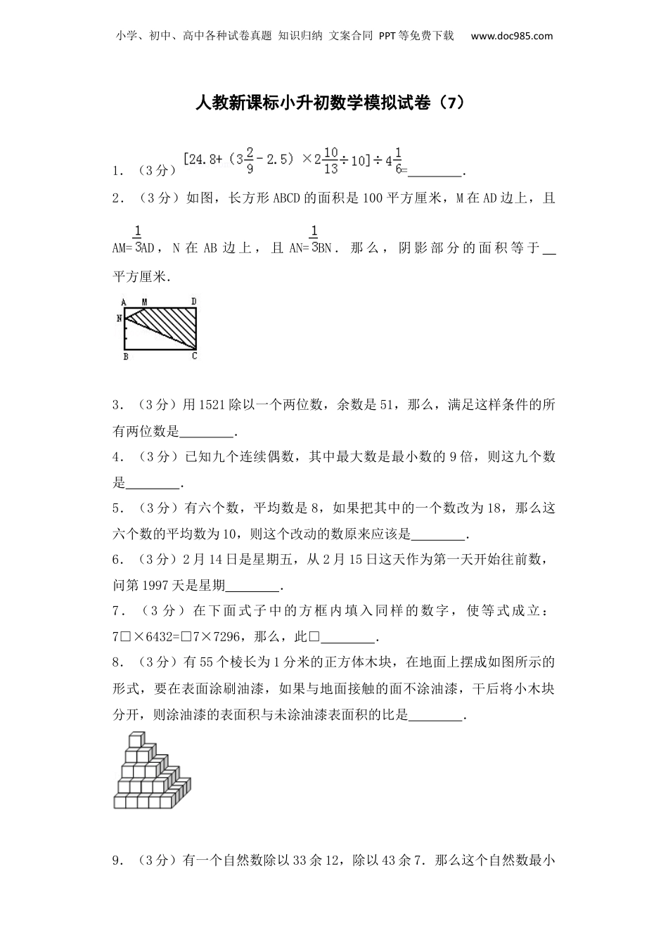 小学、初中、高中各种试卷真题知识归纳文案合同PPT等免费下载www.doc985.com人教新课标小升初数学模拟试卷(7)1.(3分)=.2.(3分)如图,长方形ABCD的面积是100平方厘米,M在AD边上,且AM=AD,N在AB边上,且AN=BN.那么,阴影部分的面积等于平方厘米.3.(3分)用1521除以一个两位数,余数是51,那么,满足这样条件的所有两位数是.4.(3分)已知九个连续偶数,其中最大数是最小数的9倍,则这九个数是.5.(3分)有六个数,平均数是8,如果把其中的一个数改为18,那么这六个数的平均数为10,则这个改动的数原来应该是.6.(3分)2月14日是星期五,从2月15日这天作为第一天开始往前数,问第1997天是星期.7.(3分)在下面式子中的方框内填入同样的数字,使等式成立:7□×6432=□7×7296,那么,此□.8.(3分)有55个棱长为1分米的正方体木块,在地面上摆成如图所示的形式,要在表面涂刷油漆,如果与地面接触的面不涂油漆,干后将小木块分开,则涂油漆的表面积与未涂油漆表面积的比是.9.(3分)有一个自然数除以33余12,除以43余7.那么这个自然数最小小学、初中、高中各种试卷真题知识归纳文案合同PPT等免费下载www.doc985.com的是.10.(3分)(2012•嘉兴模拟)一段铁丝,第一次剪下全长的,第二次剪下的长度与第一次剪下的长度的比是9:20,还剩7米,这段铁丝全长米.11.姐姐去水果店买来一篮桔子,全家4口人按计划天数吃,如果每人每天吃1个,则多出26个桔子,如果每人每天吃2个,又少6个桔子,问:姐姐共买回来多少个桔子?计划吃几天?12.公共汽车上共有男、女人数100人,到甲站后下车27个男人,9个女人;又上来3个男人,9个女人.车到乙站后,上来8个女人,这时车上的男人正好是女人的3倍,问原来男人比女人多多少人?13.小红、小强、小林三人去完成种树任务,已知小红种2棵树的时间,小强种3棵,小林种4棵.他们先一起干了6天,完成全部任务的,然后小林休息了9天,小强休息了6天,小红没休息,最后一起完成任务.所以,从开始种树算起,共用了多少天才完成了任务?小强种树占全部任务的几分之几?14.小明和小文二人沿铁路相向而行,速度相同,一列火车从小明身边开过用了10秒,离开小明后8分又遇到小文,从小文身边开过,仅用了9秒,问从小文与火车相遇开始再经过几小时几分几秒小文和小明二人相遇?若小明步行该火车的长度需要多长时间?小学、初中、高中各种试卷真题知识归纳文案合同PPT等免费下载www.doc985.com参考答案1.6【解析】试题分析:按四则混合运算的计算顺序和计算法则计算即可.解:,=[24.8+(﹣)××]×,=[24.8+××]×,=[24.8+]×,=25×,=6.故答案为:6.点评:此题考查学生的计算能力,计算时要细心.2.58.【解析】试题分析:①根据题干,要求阴影部分的面积,可以先求出△AMN和△BNC的面积;②M在AD边上,且AM=AD;且AN=BN,则AN=AB,由此可得:△AMN的面积=×AM×AN=×AD×AB=×AD×AB=×100=4(平方厘米),同理可得:△BNC的面积=×AB×BC=×AB×BC=×100=37(平方厘米),③所以阴影部分的面积=100﹣4﹣37=58平方厘米).解:根据题干分析可得:小学、初中、高中各种试卷真题知识归纳文案合同PPT等免费下载www.doc985.com△AMN的面积=×AM×AN,=×AD×AB,=×AD×AB,=×100,=4(平方厘米),△BNC的面积=×AB×BC,=×AB×BC,=×100,=37(平方厘米),100﹣(4+37),=100﹣41,=58(平方厘米),答:阴影部分的面积是58平方厘米.故答案为:58.点评:求不规则的图形的面积,一般都要把它转化到规则图形的面积上进行计算.3.70或98.【解析】试题分析:先用1521﹣51=1470,再将1470分解为2×3×5×7×7,再根据余数和除数的关系即可求解.小学、初中、高中各种试卷真题知识归纳文案合同PPT等免费下载www.doc985.com解:1521﹣51=1470,1470=70×21=98×15,则满足这样条件的所有两位数是70或98.故答案为:70或98.点评:考查了有余数的除法,本题需要注意余数要比除数小,和除数是两位数的限制,有一定的难度.4.2、4、6、8、10、12、14、16、18.【解析】试题分析:因为这是九个连续的偶数,所以最大的数与...