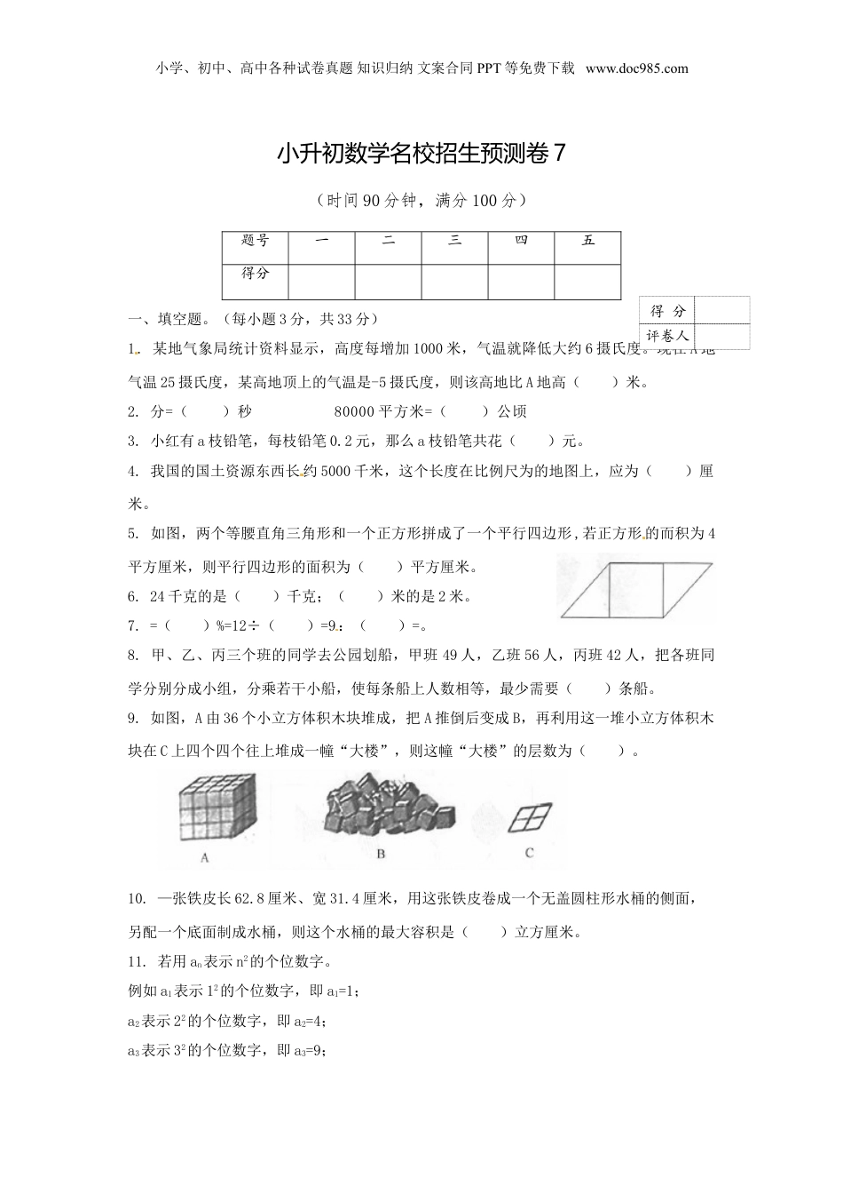 小学、初中、高中各种试卷真题知识归纳文案合同PPT等免费下载www.doc985.com小升初数学名校招生预测卷7(时间90分钟,满分100分)一、填空题。(每小题3分,共33分)1.某地气象局统计资料显示,高度每增加1000米,气温就降低大约6摄氏度。现在A地气温25摄氏度,某高地顶上的气温是-5摄氏度,则该高地比A地高()米。2.分=()秒80000平方米=()公顷3.小红有a枝铅笔,每枝铅笔0.2元,那么a枝铅笔共花()元。4.我国的国土资源东西长约5000千米,这个长度在比例尺为的地图上,应为()厘米。5.如图,两个等腰直角三角形和一个正方形拼成了一个平行四边形,若正方形的而积为4平方厘米,则平行四边形的面积为()平方厘米。6.24千克的是()千克;()米的是2米。7.=()%=12÷()=9:()=。8.甲、乙、丙三个班的同学去公园划船,甲班49人,乙班56人,丙班42人,把各班同学分别分成小组,分乘若干小船,使每条船上人数相等,最少需要()条船。9.如图,A由36个小立方体积木块堆成,把A推倒后变成B,再利用这一堆小立方体积木块在C上四个四个往上堆成一幢“大楼”,则这幢“大楼”的层数为()。10.—张铁皮长62.8厘米、宽31.4厘米,用这张铁皮卷成一个无盖圆柱形水桶的侧面,另配一个底面制成水桶,则这个水桶的最大容积是()立方厘米。11.若用an表示n2的个位数字。例如a1表示12的个位数字,即a1=1;a2表示22的个位数字,即a2=4;a3表示32的个位数字,即a3=9;题号一二三四五得分[来源:Zxxk.Com]得分评卷人小学、初中、高中各种试卷真题知识归纳文案合同PPT等免费下载www.doc985.coma4表示42的个位数字,即a4=6;……则a1+a2+a3+a4+……+a2011+a2012+a2013=()。二、选择题。(每小题2分,共10分)1.0.945保留两位小数的近似数是()。A.0.94B.0.95C.1.00D.以上都不对2.25克糖溶入100克水中,糖占糖水的()。A.20%B.25%C.12.5%D.30%3.已知:∆+∆+∆=▲,▲+▲+▲=□+□。则∆:□是()。[来源:学_科_网]A.2:9B.1:9C.2:3D.1:34.用四块“块件”拼下图的图形,不能拼出的是()。5.如图是一个由9个相同的小等边三角形所组成的大等边三角形,现在要把一枚黑子和一枚白子分别放入两个小等边三角形中,并且要求这两个小等边三角形既没有公共边也没有公共顶点,那么共有()种不同的放置方法。A.22B.24C.25D.28三、计算题。(共18分)1.直接写得数。(每小题0.5分,共4分)1--=×=16×5=8.1÷0.3=÷=0.12=1.4×30=7.2-2.7=2.脱式计算(能简便计算的要用简便方法计算)。(每小题2分,共8分)(1)61×8-0.1(2)7-×-得分评卷人得分评卷人小学、初中、高中各种试卷真题知识归纳文案合同PPT等免费下载www.doc985.com(3)÷[-(+)](4)×―÷5[来源:Zxxk.Com]3.解方程。(每小题2分,共6分)(1)x+x=(2)11.2x-5.5=0.5(3)=四、操作与图形题。(第1小题4分,第2小题5分,共9分)1.把左图按2:1放大,形状不变,画在右边的方格纸中。2.下图中的圆弧为半圆,求这个图形的周长和面积(单位:厘米)(圆周率取3.14)。[来源:Zxxk.Com]五、应用题。(每小题6分,共30分)1.合唱小组有40人,其中男生人数是女生人数的,合唱小组中男、女各有多少人?得分评卷人得分评卷人小学、初中、高中各种试卷真题知识归纳文案合同PPT等免费下载www.doc985.com2.—辆小轿车从甲地开往乙地,每小时行驶90千米。同时,一辆卡车从乙地开往甲地,6小时后两车相遇,小汽车又用了4小时到达乙地。相遇后,卡车多少小时可以到达甲地?3.小丁家、王明家和周伯伯家一起进行三家父子钓鱼比赛,比赛结束后,小丁制作了如下统计图。(1)三家的爸爸一共钓了多少条鱼?(2)三家约定,为了鼓励小朋友,计算每个家庭的比赛成绩时,小朋友钓的鱼,一条按两条计算。如王明家总成绩为:8+2×2=12(条)。按这种算法,请你先算一算周伯伯家和小丁家的总成绩分別是多少,然后判断哪一家的成绩最好。4.张叔叔开车从甲地去乙地,每分钟行500米,30分钟可到达,但行驶到中点时,因堵车停了5分钟。如果要按计划到达,行驶余下的路程张叔叔每分钟必须行多少米?小学、初中、高中各种试卷真题知识归纳文案合同PPT等免费下载w...