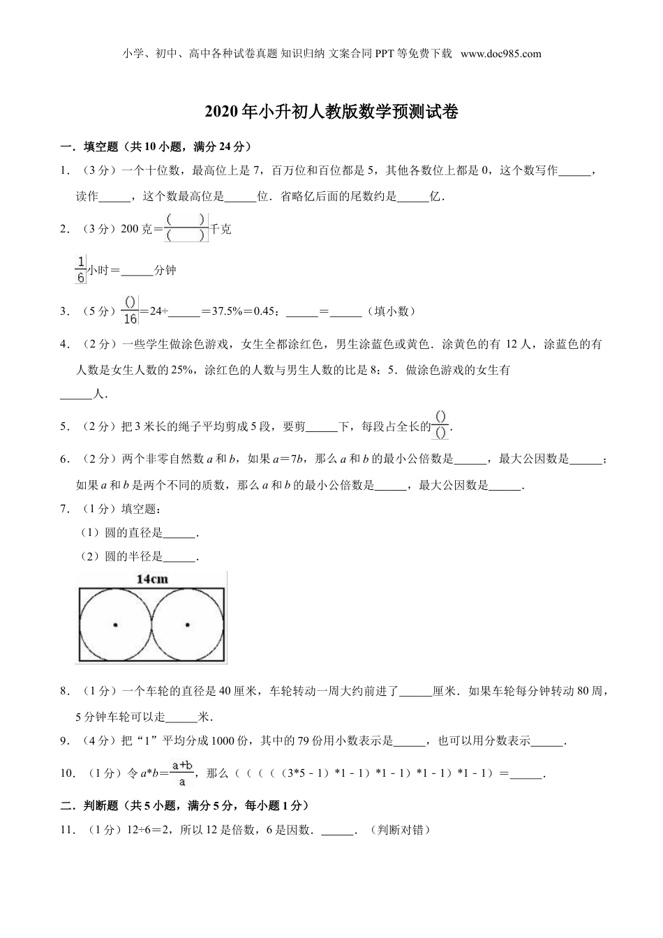 小学、初中、高中各种试卷真题知识归纳文案合同PPT等免费下载www.doc985.com2020年小升初人教版数学预测试卷一.填空题(共10小题,满分24分)1.(3分)一个十位数,最高位上是7,百万位和百位都是5,其他各数位上都是0,这个数写作,读作,这个数最高位是位.省略亿后面的尾数约是亿.2.(3分)200克=千克小时=分钟3.(5分)=24÷=37.5%=0.45:=(填小数)4.(2分)一些学生做涂色游戏,女生全都涂红色,男生涂蓝色或黄色.涂黄色的有12人,涂蓝色的有人数是女生人数的25%,涂红色的人数与男生人数的比是8:5.做涂色游戏的女生有人.5.(2分)把3米长的绳子平均剪成5段,要剪下,每段占全长的.6.(2分)两个非零自然数a和b,如果a=7b,那么a和b的最小公倍数是,最大公因数是;如果a和b是两个不同的质数,那么a和b的最小公倍数是,最大公因数是.7.(1分)填空题:(1)圆的直径是.(2)圆的半径是.8.(1分)一个车轮的直径是40厘米,车轮转动一周大约前进了厘米.如果车轮每分钟转动80周,5分钟车轮可以走米.9.(4分)把“1”平均分成1000份,其中的79份用小数表示是,也可以用分数表示.10.(1分)令a*b=,那么(((((3*5﹣1)*1﹣1)*1﹣1)*1﹣1)*1﹣1)=.二.判断题(共5小题,满分5分,每小题1分)11.(1分)12÷6=2,所以12是倍数,6是因数..(判断对错)小学、初中、高中各种试卷真题知识归纳文案合同PPT等免费下载www.doc985.com12.(1分)当a和b的公因数只有1时,a和b的最小公倍数一定是a•b(判断对错)13.(1分)半径相等的两个圆周长相等,面积也相等.(判断对错)14.(1分)两个形状相同、大小一样的三角形一定能拼成一个长方形..(判断对错)15.(1分)一圆柱过底面圆心沿高切开,表面积增加了60平方厘米,已知圆柱的高为5厘米,则一个底面圆的面积是平方厘米.三.选择题(共5小题,满分5分,每小题1分)16.(1分)与计算结果相等的算式是()A.B.C.D.17.(1分)李叔叔要制作家庭各部分开支所占百分比,选取的统计图是()A.条形统计图B.折线统计图C.扇形统计图18.(1分)比大而比小的最简分数有()个.A.2B.5C.7D.无数19.(1分)白兔与黑兔只数的比是3:8,下列说法错误的是()A.白兔的只数比黑兔少B.黑兔的只数比白兔多C.白兔的只数占两种兔子总数的D.白兔的只数是黑兔的37.5%20.(1分)把线段比例尺化成数值比例尺是()A.1:40B.1:4000000C.1:4000四.计算题(共3小题,满分30分,每小题10分)21.(10分)直接写出得数.0.8+0.24=2.4×5=12.9﹣1.9=0.26÷1.3==0.8÷0.01==6÷9=22.(12分)用递等式计算.(1)105×11﹣1890÷18小学、初中、高中各种试卷真题知识归纳文案合同PPT等免费下载www.doc985.com(2)×0.25×28(3)4.8×3.9+6.1×4(4)1﹣(0.2+)×(5)(+)×12+23.(8分)利用等式的基本性质解方程2x﹣13=3913x﹣7.5x=3.43(x+2.1)=1.4五.操作题(共3小题,满分16分)24.(4分)铁路小学红领巾电视台每周在铁路频道播放2小时节目.下图是各类节目占总播放时间比率的扇形统计图,请根据此图绘制条形统计图.(先填两轴,再画直条,后写数据)25.(6分)(1)画出图1轴对称图形的另一半.(2)画出图2绕点O逆时针旋转90°,再向上平移4格得出的图形.26.(6分)量一量,画一画(如图)(1)超市在广场的偏°方向上,距离是m.(2)学校在广场的北偏东40°方向800m处,请在图中标出学校的位置.(3)从广场到学校,要向偏°方向走m.六.填空题(共2小题,满分4分,每小题2分)27.(2分)一辆汽车行驶千米需要汽油升,这辆汽车行驶1千米耗油升,1升油可以行驶千米.28.(2分)一条公路长1200米,第一天修了全长的75%,第二天修了余下的.两天修后还剩多少米?七.应用题(共6小题,满分26分)29.(4分)一项工程,甲队独做20天完成,乙队独做每天完成.如果甲先独做5天,然后两队合做,还需多少天才能完成?30.(4分)有一车苹果要装同样大小的纸箱,如果每箱装30斤,可装满120个纸箱.现用这一车苹果装满100个纸箱,每个纸箱应该装多少斤苹果?(用...