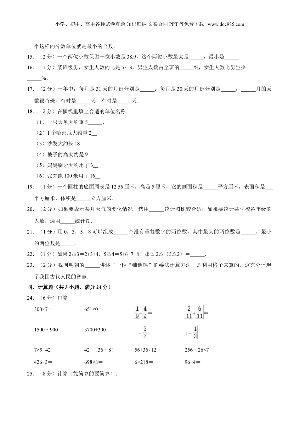 小学、初中、高中各种试卷真题知识归纳文案合同PPT等免费下载www.doc985.com2020年小升初人教版数学预测试卷一.选择题(共5小题,满分10分,每小题2分)1.(2分)第四季度一共有()天.A.92B.91C.902.(2分)下列各式中(a、b均不为0),a和b成反比例的是()A.a×8=B.9a=6bC.2a﹣5=bD.a×﹣1÷b=03.(2分)如图的玻璃缸中装有2升水,这个玻璃缸大约能盛()升水A.1B.4C.64.(2分)一个三角形已知有两个锐角,则第三个角可能是()A.锐角B.直角C.锐角,直角,钝角5.(2分)一种产品现价45元,比原价降低了5元,这种产品比原价降低了百分之几?正确的列式是()A.5÷45B.5÷(45+5)C.5÷(45﹣5)D.45÷(45+5)二.判断题(共5小题,满分10分,每小题2分)6.(2分)在一个数末尾添上两个“0”,这个数就会扩大100倍..(判断对错)7.(2分)面积相等的两个圆,它们的周长不一定相等.(判断对错)8.(2分)袋子里有一些铅笔,如果任意摸出两支,全是红色铅笔,那么袋子里一定全是红色铅笔.(判断对错)9.(2分)8:15比的前项加上16,要使比值不变,比的后项应加30..(判断对错)10.(2分)一个圆锥体的底面积不变,如果高扩大3倍,体积也扩大3倍..(判断对错)三.填空题(共13小题,满分24分)11.(3分)一个十位数,最高位上是7,百万位和百位都是5,其他各数位上都是0,这个数写作,读作,这个数最高位是位.省略亿后面的尾数约是亿.12.(2分)1.06吨=吨千克;2.4立方分米=升毫升.13.(3分)=24÷=:5=六成14.(2分)分数单位是,它再减少个这样的分数单位就是最小的质数;它再增加小学、初中、高中各种试卷真题知识归纳文案合同PPT等免费下载www.doc985.com个这样的分数单位就是最小的合数.15.(2分)一个两位小数保留一位小数是38.9,这个两位小数最大是,最小是.16.(1分)某班级男、女生人数的比是5:3,男生人数占全班的%,女生人数比男生少%.17.(2分)一年中,每月是31天的月份分别是;每月是30天的月份分别是,月的天数很特殊,有时是天,有时是天.18.(2分)在横线里填上合适的单位名称.(1)一只大象大约重5.(2)1个哈密瓜大约重2(3)沙发大约长18(4)被子的高大约是9(5)妈妈刷牙大约用了3(6)张东跑100米用了1619.(1分)一个圆柱的底面周长是12.56厘米,高是5厘米,它的侧面积是平方厘米,表面积是平方厘米,体积是立方厘米.20.(2分)如果要表示某月天气的变化情况,选用统计图比较合适;如果要统计某学校各年级的人数,选用统计图.21.(1分)用0,3,5,8可以组成个没有重复数字的两位数,其中最大的两位数是,最小的两位数是.22.(1分)如果2△3=2+3+4,5△4=5+6+7+8,那么2△(3△2)=.23.(2分)我国明朝的讲述了一种“铺地锦”的乘法计算方法,是利用格子来算的,这充分体现了我国古代人民的智慧.四.计算题(共3小题,满分24分)24.(6分)口算300×7=651×0=+=+=1500﹣900=3700+300=1﹣=1﹣=7×9+42=42+(36﹣8)=56+36÷12=256﹣26×7=426×3=698×8=6×218=96×4=25.(8分)计算(能简算的要简算):小学、初中、高中各种试卷真题知识归纳文案合同PPT等免费下载www.doc985.com58.9﹣12.42﹣6.48(+﹣)7.8÷[32×(1﹣)+3.6]×40%+0.75×26.(10分)解方程或比例.x五.解答题(共2小题,满分9分)27.(6分)如图,下面每个小方格是边长1cm的正方形,按要求操作、填空、画图.(1)把图中三角形A绕O点的逆时针旋转90°,得到三角形B.旋转后O点位置,用数对表示是.(2)已知平行四边形四个顶点的数对分别为E(1,5),F(5,5),G(2,7),H(6,7),在格子图上画出这个平行四边形.这个平行四边形的面积是cm2.(3)把三角形B向左平移4格,得到三角形C;一直线MN为对称轴作图形C的轴对称图形,得到三角形D,在图上画出图象B、图形C和图形D.28.(3分)脱式计算(能简就简)1.25×8.8;4.52×1.25+4.48÷﹣1;(4﹣1÷)×;(+﹣)÷;(1+++)×(+)﹣(1++)×(++)六.应用题(共5小题,满分23分)29.(3分)一件风衣现在售价为240...