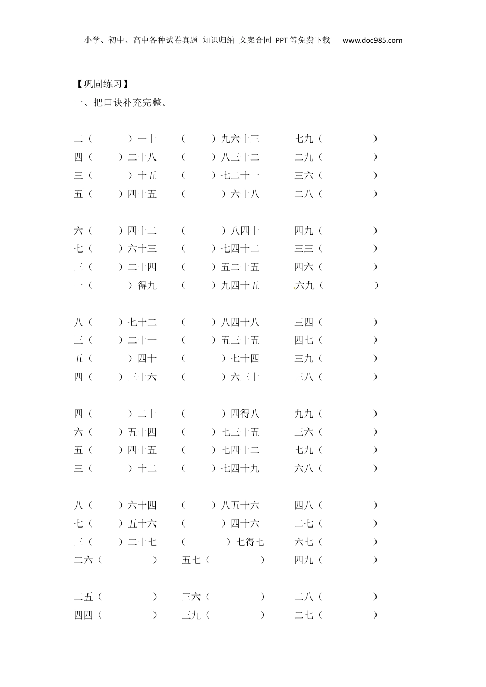 小学、初中、高中各种试卷真题知识归纳文案合同PPT等免费下载www.doc985.com专题三乘法类型一利用2-9的乘法口诀计算【知识讲解】乘法口诀巧记方法:一、两个因数相同的:一一得一二二得四三三得九四四十六五五二十五六六三十六七七四十九八八六十四九九八十一二、积是整十数的:二五一十四五二十五六三十五八四十三、积的十位数字与个位数字交换的:二七十四五八四十三四十二三七二十一五九四十五六九五十四四九三十六七九六十三三九二十七八九七十二四、积的得数相同的:(两个因数不能重复的)一四得四二二得四一六得六二三得六一八得八二四得八二六十二三四十二一九得九三三得九三六十八二九十八二八十六四四十六三八二十四六四二十四六六三十六四九三十六五、其他:一二得二一三得三一五得五一七得七七八五十六六八四十八小学、初中、高中各种试卷真题知识归纳文案合同PPT等免费下载www.doc985.com【巩固练习】一、把口诀补充完整。二()一十()九六十三七九()四()二十八()八三十二二九()三()十五()七二十一三六()五()四十五()六十八二八()六()四十二()八四十四九()七()六十三()七四十二三三()三()二十四()五二十五四六()一()得九()九四十五六九()八()七十二()八四十八三四()三()二十一()五三十五四七()五()四十()七十四三九()四()三十六()六三十三八()四()二十()四得八九九()六()五十四()七三十五三六()五()四十五()七四十二七九()三()十二()七四十九六八()八()六十四()八五十六四八()七()五十六()四十六二七()三()二十七()七得七六七()二六()五七()四九()二五()三六()二八()四四()三九()二七()小学、初中、高中各种试卷真题知识归纳文案合同PPT等免费下载www.doc985.com四八()一九()四五()()十八()四十九()十五()二十一()二十八()五十六()三十六()四十()四十二()十四()得八()十二()二十四()得六()三十()得六()七十二()四十五四()二十()八五十六七八()六()四十八()七三十五二六()三()十八()七二十八六七()五()四十()四十六三九()二()十二()六三十四四()七()五十六()九二十七三八()三()二十七()五二十五九()六()四十二()九六十三六九()七()六十三()七三十五四五()三()二十四()六二十四四七()五()四十五()六十八三九()四()三十二()八四十五六()四()二十()四十二八九()三()十五()七四十九四七()五()四十五()八六十四七八()二()十八()九七十二三六()三()二十一()八五十六四八()小学、初中、高中各种试卷真题知识归纳文案合同PPT等免费下载www.doc985.com六()三十六()六二十四五七()三()十二()七四十二七九()七()四十九()五三十五六八()二、算一算:5×9=9×4=2×8=7×3=9×2=5×7=6×6=2×9=4×6=3×8=5×8=2×5=6×8=7×2=9×6=3×6=7×4=1×5=5×4=7×9=5×1=9×6=3×8=3×6=4×3=5×6=7×7=9×4=3×5=9×9=5×7=6×6=2×9=4×6=3×8=5×8=2×5=6×8=7×2=9×6=7×7=6×9=4×9=4×6=6×8=5×8=2×5=7×8=7×4=9×9=4×8=3×5=3×8=5×9=3×7=4×7=6×7=4×4=7×8=6×8=8×9=3×4=3×6=2×8=5×7=3×7=5×9=5×5=6×7=5×6=6×9=4×7=4×6=4×9=3×6=7×8=5×8=7×9=4×7=5×6=6×9=7×7=6×7=7×8=3×6=5×5=4×9=3×5=4×9=3×7=5×7=2×7=6×7=3×9=7×6=5×9=4×9=3×8=4×7=6×9=小学、初中、高中各种试卷真题知识归纳文案合同PPT等免费下载www.doc985.com8×7=8×4=6×4=7×6=3×8=7×8=7×9=2×9=4×9=6×8=6×5=8×8=3×9=8×3=6×3=7×3=2×6=6×8=4×3=7×9=()×5=352×()=12()×6=307×()=49()×9=813×()=12()×3=12()×4=283×()=18()×8=48()×7=42()×5=254×()=246×()=364×()=365×()=30()×7=35()×3=216×()=542×()=186×()=48()×4=16()×3=27()×6=187×()=63()×7=496×()=54()×9=364×()=24()×8=485×()=40()×5=107×()=56()×4=289×()=81()×8=323×()=15()×8=245×()=45...