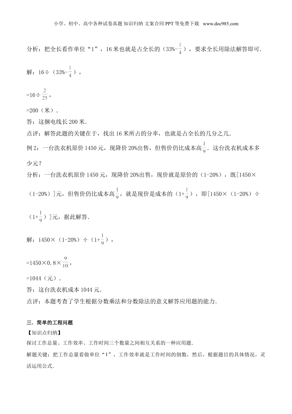 小学、初中、高中各种试卷真题知识归纳文案合同PPT等免费下载www.doc985.com2020年小升初数学专题复习训练——数与代数应用题(2)知识点复习一.百分数的实际应用【知识点归纳】①出勤率=出勤人数÷总人数×100%发芽率=发芽种子数÷试验种子数×100%小麦的出粉率=面粉的重量÷小麦的重量×100%产品的合格率=合格的产品数÷产品总数×100%职工的出勤率=实际出勤人数÷应出勤人数×100%②纳税问题:缴纳的税款叫应纳税款应纳税额与各种收入的比率叫做税率税款=应纳税金×税率③利息问题:存入银行的钱叫本金;取款时,银行多支付的钱叫做利息利息与本金的比值叫做利率利息=本金×利率×时间【命题方向】常考题型:例1:某公司开会,有25人缺席,有100人出席,这个会议的出席率是()A、80%B、75%C、100%分析:出席率是指出席的人数占总人数的百分之几,计算方法为:×100%=出席率,由此列式解答即可.解:×100%=80%,答:出席率是80%;故选:A.小学、初中、高中各种试卷真题知识归纳文案合同PPT等免费下载www.doc985.com点评:此题属于百分率问题,计算的结果最大值为100%,都是用一部分数量(或全部数量)除以全部数量乘以百分之百.例2:某商店同时卖出两件商品,每件各得60元,但其中一件赚20%,另一件亏本20%,这个商店卖出这两件商品是赚钱还是亏本?分析:可以这样想,赚了20%,亏本20%是和谁比较呢?是与原价比较,因此原价是单位“1”,赚了20%就是说原价的(1+20%)是60元,求原价,用除法,60÷(1+20%)=50(元),同理亏本20%就是说原价的(1-20%)是60元,求原价,用除法,60÷(1-20%)=75(元).解:[60÷(1+20%)+60÷(1-20%)]-60×2=[50+75]-120;=125-120;=5(元);答:这两件商品亏了5元.点评:解决这个问题的关键是正确确定单位“1”,找出对应关系.二.分数、百分数复合应用题【知识点归纳】含有三个已知条件的两步计算的应用题,有两个或两个以上的基本数量关系组成的,通常叫做复合应用题;分数、百分数复合应用题,运算按照分数和百分数的运算法则进行运算即可,通常是将分数化成百分数.成数:在求甲数对于乙数的比时,把比值化成纯小数,所得的纯小数叫做甲数对乙数的成数.如:8成=0.8==80%打折:打折就是在原来售价的基础上降价销售,几折则表示实际售价占原来售价的成数.如:7折=0.7==70%【命题方向】常考题型:例1:一捆电线,第一次用去全长的,第二次用去全长的33%,第一次比第二次少用了16米,这捆电线长多少米?小学、初中、高中各种试卷真题知识归纳文案合同PPT等免费下载www.doc985.com分析:把全长看作单位“1”,16米也就是占全长的(33%-),要求全长用除法解答即可.解:16÷(33%-),=16÷,=200(米).答:这捆电线长200米.点评:解答此题的关键在于,找出16米所占的分率,也就是占全长的几分之几.例2:一台洗衣机原价1450元,现降价20%出售,但售价仍比成本高.这台洗衣机成本多少元?分析:一台洗衣机原价1450元,现降价20%出售,现价就是原价的(1-20%),既[1450×(1-20%)]元,但售价仍比成本高,就是现价是成本的(1+),即[1450×(1-20%)÷(1+)]元,据此解答.解:1450×(1-20%)÷(1+),=1450×0.8×,=1044(元).答:这台洗衣机成本1044元.点评:本题考查了学生根据分数乘法和分数除法的意义解答应用题的能力.三.简单的工程问题【知识点归纳】探讨工作总量、工作效率、工作时间三个数量之间相互关系的一种应用题.解题关键:把工作总量看做单位“1”,工作效率就是工作时间的倒数,然后,根据题目的具体情况,灵活运用公式.小学、初中、高中各种试卷真题知识归纳文案合同PPT等免费下载www.doc985.com数量关系式:工作总量=工作效率×工作时间工作效率=工作总量÷工作时间工作时间=工作总量÷工作效率合作时间=工作总量÷工作效率和【命题方向】常考题型:例1:打一份文件,甲用4小时,乙用6小时,两人合打()小时能完成.A、B、C、10分析:把这项工程看做单位“1”,那么甲的工作效率是,乙的工作效率是,利用工作时间=工作总量÷工作效率即可求得两人合打需要的时间,由此即可进行选择.解:根...