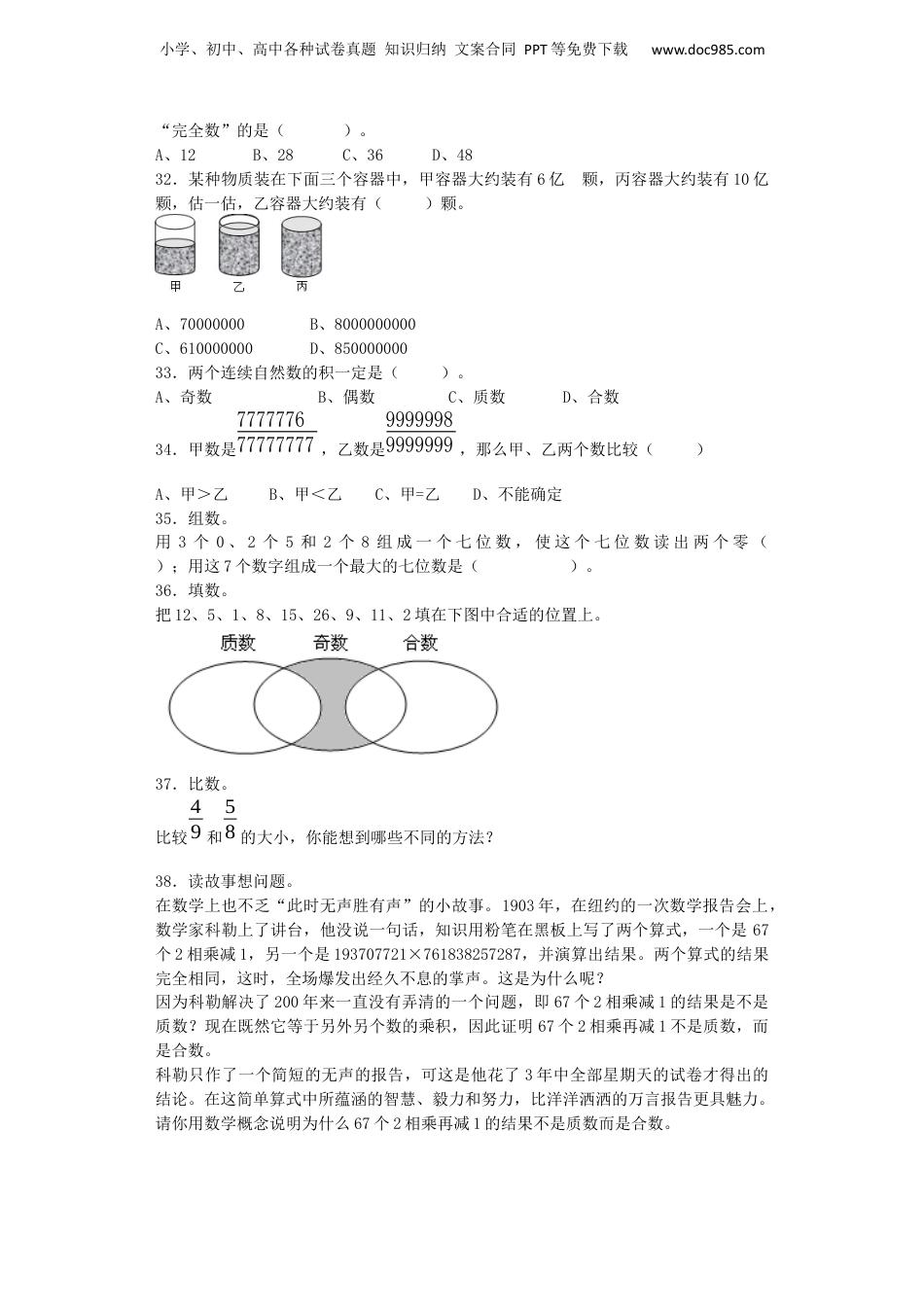 小学、初中、高中各种试卷真题知识归纳文案合同PPT等免费下载www.doc985.com年小学数学毕业复习数与代数精编试题——数的认识1.地球上海洋面积大约是三亿六千一百万平方米,这个数写作(),改写成用亿作单位的数是(),省略亿后面的尾数约是()。2.一个数有7个1和5个16组成,这个数是(),它的倒数是()。3.216的分数单位是(),再加上()个这样的分数单位就是最小的合数。4.36:24=()÷36==()%5.一种零件的标准质量是25克,如果质量是26克的零件记作+1,那么23克的零件应该记作()。6.用小于10的两个合数组成一个最简真分数是()。7.m8(m是非0自然数)的分数单位是(),当m是()时,这个分数是最小的假分数。8.-3、2.4、1、0.2、+16都在同一条数轴上,离0最近的数是(),-3在0的()边。9.把13、30%、π、0.32、3按从小到大的顺序排列是()。10.一个数,如果将它的小数点向右移动一位,得到的数比原数大2.25,原数是()。11.非0自然数a除以b商是4,那么a和b的最大公因数是(),最小公倍数是()。12.35米表示把1米平均分成()份,取其中的()份;也表示把3米平均分成()份,取其中的()份。13.在()里填上合适的数。14.n是自然数,2n+1一定是奇数。()15.一个分数,它的分母越大,分数单位就越小。()小学、初中、高中各种试卷真题知识归纳文案合同PPT等免费下载www.doc985.com16.0.5和0.50的大小相等,意义相同。()17.一个非0自然数不是合数就是质数。()18.5千克苹果平均分给6个小朋友,每个小朋友分得这些苹果的56。()19.3.0101010101是一个循环小数。()20.512、721、915都不能化成有限小数。()21.一个数不是正数就是负数。()22.一个数的因数都比它的倍数小。()23.下面各数能改成百分数的是()。A、绳长3米B、白糖重45千克C、女生人数是男生的34D、每分钟行0.75千米24.35的分母增加15,要分数的大小不变,分子应()。A、扩大4倍B、扩大3倍C、增加15D、增加1025.下列说法错误的是()。A、把7.8%的百分号去掉,这个数就扩大100倍B、负数都比正数小C、1既不是质数也不是合数D、假分数的倒数都小于126.下列各数中,去掉所有的0大小不变的数是()。A、600B、12.00C、10.0D、102.027.如果a=b×c,b、c为两个不同的质数,那么a有()个因数。28.下面的说法中,错误的是()。A、真分数一定比假分数小B、O既不是正数,也不是负数C、两位小数表示百分之几D、45的分数单位比34的分数单位大29.把一根绳子剪成两段,第一段长49米,第二段占全长的49,那么两段比较,()。A、第一段长B、第二段长C、两段一样长D、不能确定30.如果a×b=c(a、b、c都是不等于0的自然数),那么()。A、a是b的倍数B、b和c都是a的倍数C、a和b都是c的因数D、c是a、b的最小公倍数31.古希腊认为:如果一个数恰好等于它的所有因数(本身除外)相加之和,那么这个数就是“完全数”。例如:6有四个因数1、2、3、6,除本身6以外,还有1、2、3三个因数。6=1+2+3,恰好是所有因数之和,所以6就是“完全数”。下面的数中是小学、初中、高中各种试卷真题知识归纳文案合同PPT等免费下载www.doc985.com“完全数”的是()。A、12B、28C、36D、4832.某种物质装在下面三个容器中,甲容器大约装有6亿颗,丙容器大约装有10亿颗,估一估,乙容器大约装有()颗。A、70000000B、8000000000C、610000000D、85000000033.两个连续自然数的积一定是()。A、奇数B、偶数C、质数D、合数34.甲数是777777677777777,乙数是99999989999999,那么甲、乙两个数比较()A、甲>乙B、甲<乙C、甲=乙D、不能确定35.组数。用3个0、2个5和2个8组成一个七位数,使这个七位数读出两个零();用这7个数字组成一个最大的七位数是()。36.填数。把12、5、1、8、15、26、9、11、2填在下图中合适的位置上。37.比数。比较49和58的大小,你能想到哪些不同的方法?38.读故事想问题。在数学上也不乏“此时无声胜有声”的小故事。1903年,在纽约的一次数学报告会上,数学家科勒上了讲台,他没说一句话,知识用粉笔在黑板上写了两个算式,一个是67个2相乘减1,另一个...