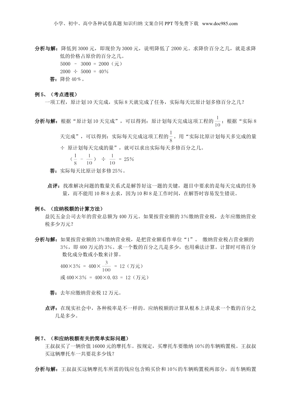 小学、初中、高中各种试卷真题知识归纳文案合同PPT等免费下载www.doc985.com小学数学总复习归类讲解及训练(一)主要内容求一个数比另一个数多(少)百分之几、纳税问题学习目标1、使学生在现实情境中,理解并掌握“求一个数比另一个数多(少)百分之几”的基本思考方法,并能正确解决相关的实际问题。2、使学生在探索“求一个数比另一个数多(少)百分之几”方法的过程中,进一步加深对百分数的理解,体会百分数与日常生活的密切联系,增强自主探索和合作交流的意识,提高分析问题和解决问题的能力。3、使学生初步认识纳税和税率,理解和掌握应纳税额的计算方法。4、初步培养学生的纳税意识,继续感知数学就在身边,提高知识的应用能力。5、培养和解决简单的实际问题的能力,体会生活中处处有数学。考点分析1、一个数比另一个数多(少)百分之几=一个数比另一个数多(少)的量÷另一个数。2、应该缴纳的税款叫做应纳税额,应纳税额与各种收入的比率叫做税率,应纳税额=收入×税率典型例题例1、(解决“求一个数比另一个数多百分之几”的实际问题)向阳客车厂原计划生产客车5000辆,实际生产5500辆。实际比计划多生产百分之几?分析与解:要求“实际比计划多生产百分之几”,就是求实际比计划多生产的辆数占计划产量的百分之几,把原计划产量看作单位“1”。两者之间的关系可用线段图表示。计划产量5000辆实际比计划多的实际产量5500辆解答:方法1:5500–5000=500(辆)……实际比计划多生产500辆500÷5000=0.1=10%……实际比计划多生产百分之几方法2:5500÷5000=110%……实际产量相当于原计划的110%110%-100%=10%……实际比计划多生产百分之几答:实际比计划多生产10%。例2、(解决“求一个数比另一个数少百分之几”的实际问题)小学、初中、高中各种试卷真题知识归纳文案合同PPT等免费下载www.doc985.com向阳客车厂原计划生产客车5000辆,实际生产5500辆。计划比实际少生产百分之几?分析与解:要求“计划比实际少生产百分之几”,就是求计划比实际少生产的辆数占实际产量的百分之几,把实际产量看作单位“1”。两者之间的关系可用线段图表示。计划产量5000辆计划比实际少的实际产量5500辆解答:方法1:5500–5000=500(辆)……计划比实际少生产500辆500÷5500≈9.1%……计划比实际少生产百分之几方法2:5500÷5500≈90.9%……计划产量相当于实际的90.9%100%-90.9%≈9.1%……计划比实际少生产百分之几答:计划比实际少生产9.1%。点评:想一想,在分数乘法应用题中的最基本的数量关系式:“单位1×分率=分率对应的量”,如果和百分数应用题结合起来,求一种量比另一种量多(少)百分之几,实际上就是求分率。就用“多(少)的量÷单位1”。例3、(难点突破)一筐苹果比一筐梨重20%,那么一筐梨就比一筐苹果轻20%分析与解:苹果比梨重20%,表示苹果比梨重的部分占梨的20%,把梨的质量看作单位“1”;而梨比苹果轻20%则表示梨比苹果轻的部分占苹果的20%,把苹果的质量看作单位“1”,两个单位“1”不同,切忌将两个问题混为一谈。一筐苹果比一筐梨重20%,是把梨看作单位“1”,梨有100份,苹果就是100+20=120份;一筐梨比一筐苹果轻百分之几=一筐梨比一筐苹果轻的部分÷苹果=(120-100)÷120≈16.7%答:一筐苹果比一筐梨重20%,那么一筐梨就比一筐苹果轻16.7%点评:在求一个数比另一个数多(少)百分之几的百分数应用题中,关键还是要找准单位“1”的量。从结论可以得出“一个数比另一个数多百分之几,另一个数就比一个数少百分之几。”这句话是错的。为什么呢?把两个百分之几比较一下,就可以得出这两个百分之几对应的量是一个数比另一个数多的量或另一个数比一个数少的量,而这两种说法是相同的,也就表示的是同一个量;而单位“1”一个是梨,一个是苹果,所以这两个百分之几是不可能相等的。例4、(考点透视)一种电子产品,原价每台5000元,现在降低到3000元。降价百分之几?小学、初中、高中各种试卷真题知识归纳文案合同PPT等免费下载www.doc985.com分析与解:降低到3000元,即现价为3000元,说明降低了2000元。求降价百分之几,就是求降低的价...