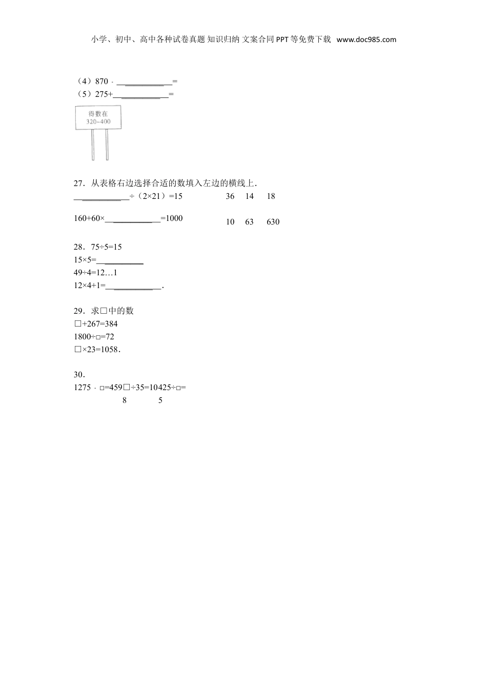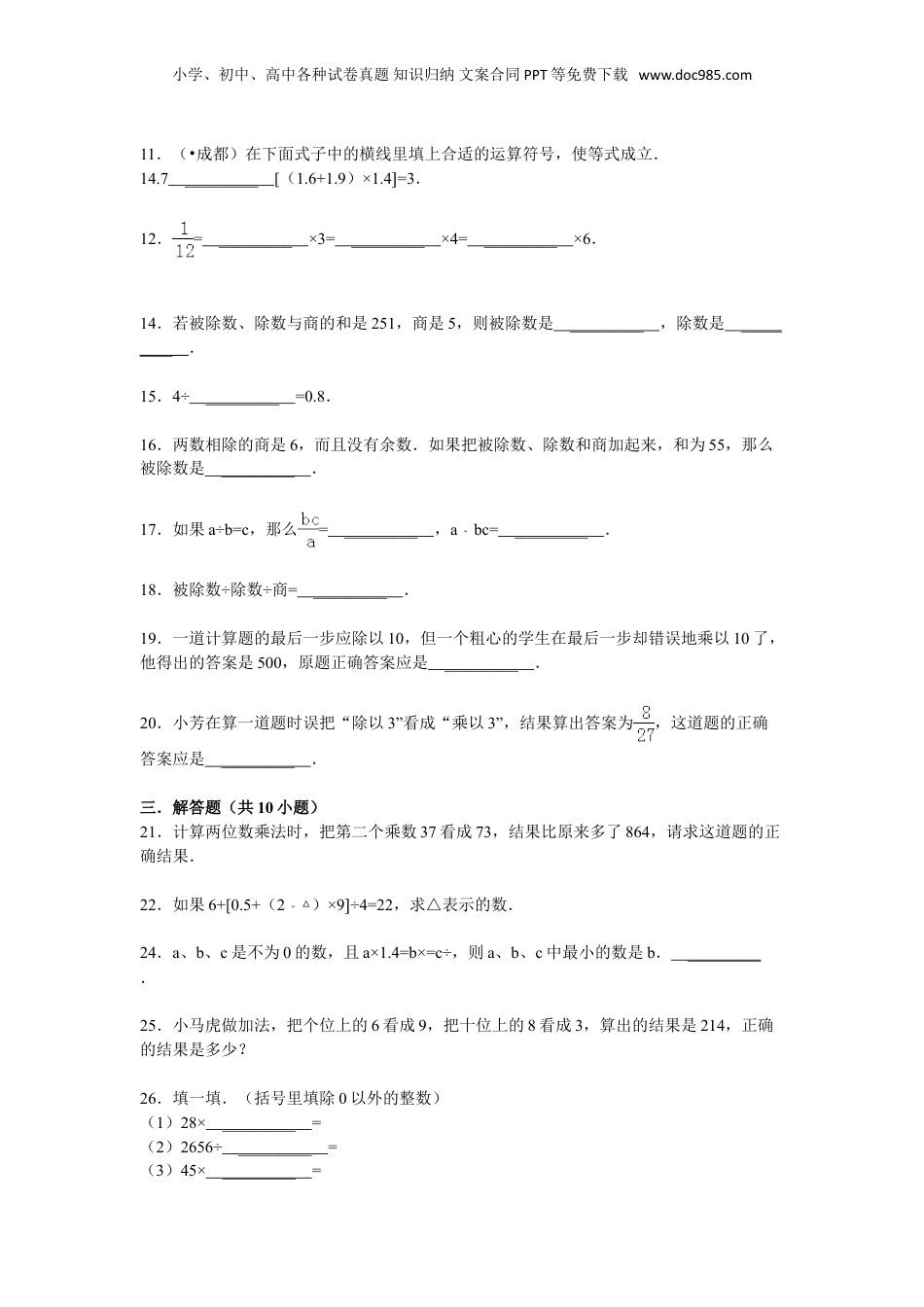 小学、初中、高中各种试卷真题知识归纳文案合同PPT等免费下载www.doc985.com小升初知识点复习专项练习-数的运算10乘与除的互逆关系一.选择题(共10小题)1.被除数+除数×商=258,则被除数是()A.129B.200C.2503.如果△是○的32倍,下面算式对的是()A.△+32=○B.○+32=△C.○×32=△4.□×2=606,□里应填()A.330B.303C.3005.把除数45错写成54,结果得到的商是30,正确的结果应该是()A.36B.25C.63D.396.如果△×□=○,那么下面的算式正确的是()A.○×□=△B.△×○=□C.○÷□=△7.除数和商都是12,被除数是()A.144B.1C.128.如果□是○的15倍,下面哪个算式是对的?()A.○÷15=□B.○×15=□C.□×15=○9.如果○÷=□△,那么下列算式正确的是()A.○×□=△B.○×=□△C.○÷□=△10.已知○÷=□△,下列算式正确的是()A.△÷○=□B.△×□=○C.○×=□△二.填空题(共10小题)小学、初中、高中各种试卷真题知识归纳文案合同PPT等免费下载www.doc985.com11.(•成都)在下面式子中的横线里填上合适的运算符号,使等式成立.14.7_________[(1.6+1.9)×1.4]=3.12.=_________×3=_________×4=_________×6.14.若被除数、除数与商的和是251,商是5,则被除数是_________,除数是_________.15.4÷_________=0.8.16.两数相除的商是6,而且没有余数.如果把被除数、除数和商加起来,和为55,那么被除数是_________.17.如果a÷b=c,那么=_________,abc=﹣_________.18.被除数÷除数÷商=_________.19.一道计算题的最后一步应除以10,但一个粗心的学生在最后一步却错误地乘以10了,他得出的答案是500,原题正确答案应是_________.20.小芳在算一道题时误把“除以3”看成“乘以3”,结果算出答案为,这道题的正确答案应是_________.三.解答题(共10小题)21.计算两位数乘法时,把第二个乘数37看成73,结果比原来多了864,请求这道题的正确结果.22.如果6+[0.5+(2﹣△)×9]÷4=22,求△表示的数.24.a、b、c是不为0的数,且a×1.4=b×=c÷,则a、b、c中最小的数是b._________.25.小马虎做加法,把个位上的6看成9,把十位上的8看成3,算出的结果是214,正确的结果是多少?26.填一填.(括号里填除0以外的整数)(1)28×_________=(2)2656÷_________=(3)45×_________=小学、初中、高中各种试卷真题知识归纳文案合同PPT等免费下载www.doc985.com(4)870﹣_________=(5)275+_________=27.从表格右边选择合适的数填入左边的横线上._________÷(2×21)=153614181063630160+60×_________=100028.75÷5=1515×5=_________49÷4=12…112×4+1=_________.29.求□中的数□+267=3841800÷□=72□×23=1058.30.1275□=459﹣□÷35=108425÷□=5小学、初中、高中各种试卷真题知识归纳文案合同PPT等免费下载www.doc985.com小升初知识点复习专项练习-数的运算10乘与除的互逆关系参考答案与试题解析一.选择题(共10小题)1.被除数+除数×商=258,则被除数是()A.129B.200C.250考点:乘与除的互逆关系.分析:根据被除数+除数×商=258,因除数×商=被除数,可知:被除数=258×,计算出得数即可选择.解答:解:因为被除数+除数×商=258,除数×商=被除数,所以被除数是:258×=129;故选:A.点评:此题考查除法各部分之间的关系:除数×商=被除数.3.如果△是○的32倍,下面算式对的是()A.△+32=○B.○+32=△C.○×32=△考点:乘与除的互逆关系.专题:运算顺序及法则.分析:依据题意△是○的32倍,把△看作被除数,○看作除数,32看作商,依据被除数、除数、商之间关系解答.解答:解:因为△是○的32倍,所有△÷○=32,△=32×○,○=÷32△,故选:C.点评:解决本题时只要把△看作被除数,○看作除数,32看作商,依据被除数、除数、商之间关系解答即可.4.□×2=606,□里应填()A330B.303C.300小学、初中、高中各种试卷真题知识归纳文案合同PPT等免费下载www.doc985.com.考点:乘与除的互逆关系.专题:运算顺序及法则.分析:根据除法的意义进行解答,已知两个因数的积...
