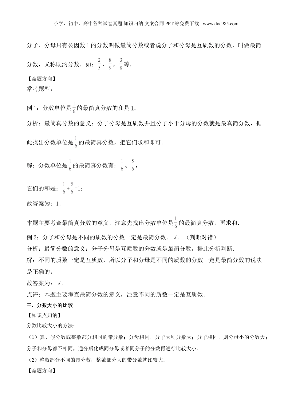 小学、初中、高中各种试卷真题知识归纳文案合同PPT等免费下载www.doc985.com2020年小升初数学专题复习训练——数与代数数的认识(3)知识点复习一.分数的基本性质【知识解释】分数的分子和分母同时乘或者除以相同的数(0除外),分数的大小不变.这叫做分数的基本性质.【命题方向】常考例题:例1:的分子加上6,如果要使这个分数的大小不变,分母应该()A、加上20B、加上6C、扩大2倍D、增加3倍分析:分子加上6后是原来的几倍,根据分数的基本性质,那么分母也是原来的几倍,分数的大小才不变.解:分子:3+6=99÷3=3说明分子扩大了3倍.要想分数的大小不变,那么分母也要扩大3倍,或10×3=3030-10=20说明分母应加上20.故选:A.本题主要考查分数的基本性质,根据这一性质解答即可.例2:一个假分数,如果分子、分母同时加上1,则分数的值小于原分数.×.分析:分子大于或者等于分母的分数叫假分数,假分数大于1或等于1.可以用赋值法来判断这道题目的正误即可.解:假设这个假分数是,分子和分母同时加上1,=,因=1,=1,则这两个分数相等,与分数的值小于原分数不相符.故答案为:×.本题是考查假分数的定义,用赋值法来判断正误就比较容易解决.二.最简分数【知识点归纳】小学、初中、高中各种试卷真题知识归纳文案合同PPT等免费下载www.doc985.com分子、分母只有公因数1的分数叫做最简分数或者说分子和分母是互质数的分数,叫做最简分数,又称既约分数.如:,,等.【命题方向】常考题型:例1:分数单位是的最简真分数的和是1.分析:最简真分数的意义:分子分母是互质数并且分子小于分母的分数就是最真简分数,据此找出分数单位是的最简真分数,把它们求和即可.解:分数单位是的最简真分数有:、,它们的和是:+=1;故答案为:1.本题主要考查最简真分数的意义,注意先找出分数单位是的最简真分数,再求和.例2:分子和分母是不同的质数的分数一定是最简分数.√.(判断对错)分析:最简分数的意义:分子分母是互质数的分数就是最简分数,据此分析判断.解:不同的质数一定是互质数,所以分子和分母是不同的质数的分数一定是最简分数的说法是正确的;故答案为:√.点评:本题主要考查最简分数的意义,注意不同的质数一定是互质数.三.分数大小的比较【知识点归纳】分数比较大小的方法:(1)真、假分数或整数部分相同的带分数;分母相同,分子大则分数大;分子相同,则分母小的分数大;分子和分母都不相同,通分后化成同分母或者同分子的分数再进行比较大小.(2)整数部分不同的带分数,整数部分大的带分数就比较大.【命题方向】小学、初中、高中各种试卷真题知识归纳文案合同PPT等免费下载www.doc985.com常考题型:例1:小于而大于的分数只有一个分数.×(判断对错)分析:依据分数的基本性质,将两个分数的分子和分母同时扩大若干倍,介于它们中间的真分数就会有无数个,据此即可进行判断.解:分别将和的分子和分母扩大若干个相同的倍数,在和间会出现无数个真分数,所以,大于而小于的真分数只有一个是错误的.故答案为:×.点评:解答此题的关键是依据分数的基本性质将两个的分子和分母扩大若干倍,即可找到无数个介于它们中间的真分数,从而能推翻题干的说法.四.约分和通分【定义解释】约分:把一个分数化成同它相等,但分子分母都比较小的分数,叫做约分.约分就是把分数化简成最简分数.约分时一般用分子和分母的公因数(1除外)去除分数的分子和分母,通常要除到得出最简分数为止.通分:把异分母分数分别化成和原来分数相等的同分母分数,叫做通分.通分就是把分母不同分数化成分母相同的分数.约分和通分的依据是分数的基本性质:分数的分子和分母同乘以或除以同一个不等于0的数,分数的大小不变.(分数的分子和分母同时扩大或同时缩小相同的倍数(0除外),分数的大小不变)约分方法:约分:将分子和分母数共同的约数约去(也就是除以那个数)剩下如果还有相同因数就继续约去,直到没有为止;通分的方法:通分:使两个分数的分母相同但不改变原数大小的过程.先求出原来几个分母的最小公倍数,然后把各分数分别化成用这个最小公倍数作分母的分...
