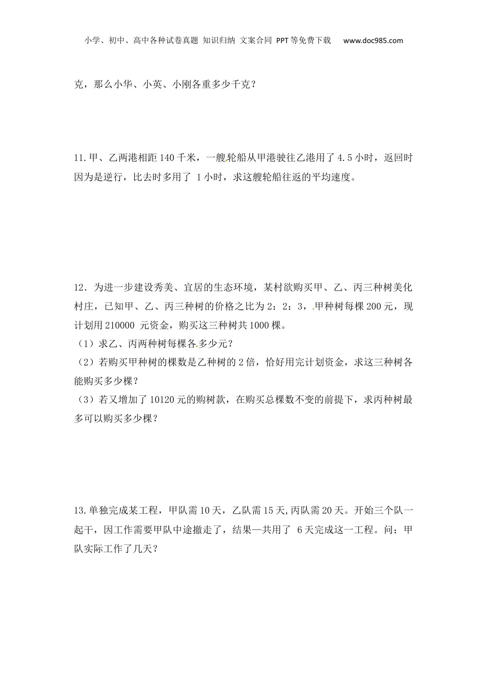 小学、初中、高中各种试卷真题知识归纳文案合同PPT等免费下载www.doc985.com小学典型应用题综合(二)【基础训练】1.学校运回12立方米的土,把这些土平铺在一条长100米、宽2.5米的校园主干道上,可以铺几厘米厚?2.小华看一本书,已经看了3天,平均每天看46页.已知看了3天后还剩下28页,这本书一共有多少页?[来源:学科网ZXXK]3.—辆货车和一辆客车同时从甲、乙两地相对而行,相遇时,客车比货车多行100千米。已知客车和货车的速度比是6:5,求甲、乙两地相距多少千米?4.文化用品商店按批发价买进一批练习本,每本0.35元,零售价每本0.4元。当卖到剩200本练习本时,已经收回全部成本,还获利10元。商店买进练习本多少本?5.李老师买了2个书包和8个文具盒共用去116元,已知每个书包比每个文具盒贵18元.书包和文具盒的单价各是多少元?小学、初中、高中各种试卷真题知识归纳文案合同PPT等免费下载www.doc985.com6.有一份稿件,甲打字员单独打10天完成,乙打字员单独打8天完成,.乙每天比甲多打4页。这份稿件一共有多少页?7.甲、乙、丙三人数学考试的平均分是84分,加上丁的成绩后,四人的平均分比84分提髙了1.5分。丁的成绩是多少分?8.某工程队修一条路,第一天修了全长的,第二天修了余下的,第三天修了第二天余下的,第四天修了8千米,刚好修完。求这条路的总长。9.某工厂要加工500个零件,已经加工了3天,每天加工96个,余下的要2天完成。这2天平均每天要加工多少个?10.小华和小英共重67千克,小刚和小华共重65千克,小英和小刚共重62千小学、初中、高中各种试卷真题知识归纳文案合同PPT等免费下载www.doc985.com克,那么小华、小英、小刚各重多少千克?11.甲、乙两港相距140千米,一艘轮船从甲港驶往乙港用了4.5小时,返回时因为是逆行,比去时多用了1小时,求这艘轮船往返的平均速度。12.为进一步建设秀美、宜居的生态环境,某村欲购买甲、乙、丙三种树美化村庄,已知甲、乙、丙三种树的价格之比为2:2:3,甲种树每棵200元,现计划用210000元资金,购买这三种树共1000棵。(1)求乙、丙两种树每棵各多少元?(2)若购买甲种树的棵数是乙种树的2倍,恰好用完计划资金,求这三种树各能购买多少棵?(3)若又增加了10120元的购树款,在购买总棵数不变的前提下,求丙种树最多可以购买多少棵?13.单独完成某工程,甲队需10天,乙队需15天,丙队需20天。开始三个队一起干,因工作需要甲队中途撤走了,结果—共用了6天完成这一工程。问:甲队实际工作了几天?小学、初中、高中各种试卷真题知识归纳文案合同PPT等免费下载www.doc985.com14.刘叔叔在停车场交了13元的停车费,而停车场的收费标准为:1小时内收费5.5元,超过1小时,每超过30分钟时加收1.5元,刘叔叔在停车场停车几小时?15.某车间要生产一批电视机零件900个,由甲组单独做12天完成,由乙组单独做18天完成,先由甲组做7天,剩下的两组合作,还要几天完成?16.工厂里生产了一批长方体的包装箱,长0.6米,宽0.4米,高0.5米,要用一辆卡车把它们拉走,这辆卡车厢的底面积是7.2平方米,且只能码两层,问最多可以装多少个包装箱?小学、初中、高中各种试卷真题知识归纳文案合同PPT等免费下载www.doc985.com【拔高训练】1.城南小教六年级有甲、乙两个班,共有学生116人。如果从甲班调出全班人数的到乙班,那么两班人数同样多。甲班原有学生多少人?2.王军去人才市场应聘。在人才市场有两家公司愿意聘用他,合同期都是3年。两家公司给出的工资方案如下:甲公司:年薪3万元,一年后每年加薪300元。乙公司:月薪2500元,一年后每月加薪50元。王军选择哪家公司挣的钱多?3.甲、乙、丙三个商场都进了一批相同的饮料:每大瓶10元,每小瓶2.5元。为了抢占市场,它们分别推出三种优惠措施:甲商场买大瓶送小瓶;乙商场一律打九折;丙商场满30元打八折。下面是三位顾客的购买情况,请你建议这些顾客去哪家商场购买花钱最少,并填在表中。(如果有多个答案都要写出来)小学、初中、高中各种试卷真题知识归纳文案合同PPT等免费下载www.doc985.com4.小狗和小猴参加100米赛跑预赛,当小狗跑到终点时,小猴才跑到90米处。决赛时,聪明的小猴突然提...