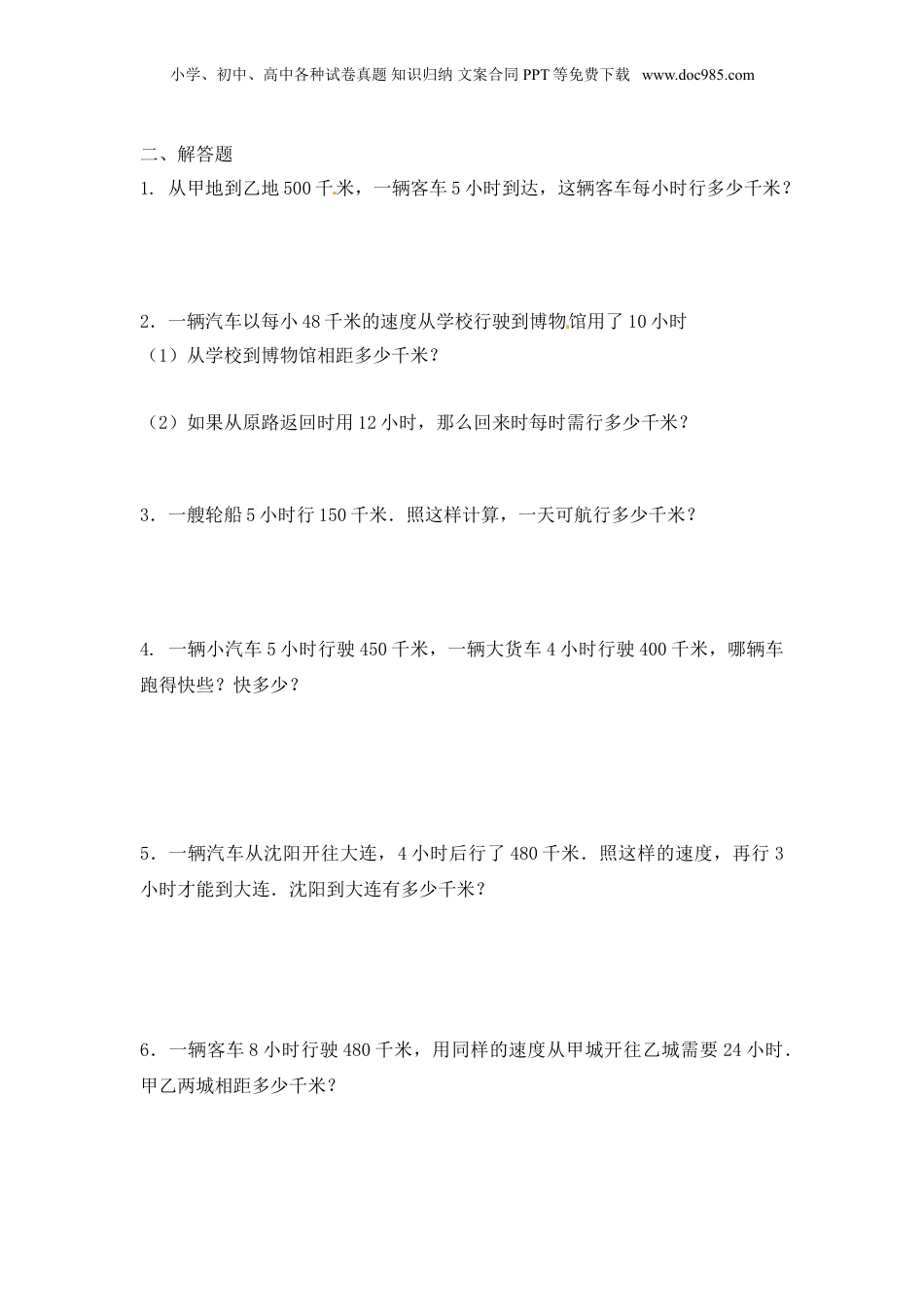 小学、初中、高中各种试卷真题知识归纳文案合同PPT等免费下载www.doc985.com类型五路程问题【知识讲解】1.路程问题路程问题是专门讲物体运动的速度,时间和路程的应用题。一共走了多长的路叫做路程,每小时(或每分钟)行的路程叫做速度,行了几小时(或几分钟)叫做时间。2.速度,时间和路程之间的关系速度×时间=路程路程÷速度=时间路程÷时间=速度3.相遇问题两个运动的物体同时由两地出发相向而行,在途中相遇。这类应用题叫做相遇问题。数量关系:相遇时间=总路程÷(甲速+乙速)总路程=(甲速+乙速)×相遇时间4.追及问题两个运动物体在不同地点同时出发(或者在同一地点而不是同时出发,或者在不同地点又不是同时出发)作同向运动,在后面的,行进速度要快些,在前面的,行进速度较慢些,在一定时间之内,后面的追上前面的物体。这类应用题就叫做追及问题。数量关系:追及时间=追及路程÷(快速-慢速)追及路程=(快速-慢速)×追及时间【典型例题】【例题1】南京到上海的水路长392千米,一艘轮船从南京开出每小时行49千米,经过几时船到上海?【分析】由题意可知392千米是路程,每小时49千米是轮船速度,问题是求时间,根据数量关系式:路程÷速度=时间可解答出时间。【解答】392÷49=8(小时)答:经过8时船到上海。小学、初中、高中各种试卷真题知识归纳文案合同PPT等免费下载www.doc985.com【小结】:解决此类问题首先要弄清已知条件和所求问题,再选取合适的数量关系式进行解答。【例题2】:甲在乙的后面28千米,两人同时相向而行,甲每小时行16千米,乙每小时行9千米,问甲几小时追上乙?【分析】:本题属于追击问题,甲每小时比乙多行16-9=7千米,也就是甲每小时可以追近乙16-9=7千米,这是速度差,已知甲在乙后面28千米,28千米里包含着几个(16-9)千米,也就是追击所需要的时间,列式28÷(16-9)=4(小时)。【解答】28÷(16-9)=4(小时)答:甲4小时追上乙。【小结】:解答本题的关键是认清题目中的路程和速度差,本题用到的数量关系式是追及时间=追及路程÷(快速-慢速)。【巩固练习】一、选择1.小明家到学校1400米,从学校回家要用20分钟,他每分钟走多少米?求的是()。A.时间B.路程C.速度D.数量2.一条鲸3秒游了63米,一只袋鼠2秒跳了36米,()速度快。A.鲸B.袋鼠C.一样快3.一辆汽车的速度是每小时35千米,5小时行多少千米?用到的公式是()。A.路程÷时间=速度B.速度×时间=路程C.路程÷速度=时间4.一辆汽车t小时行了s千米,它行1千米需要()小时。A.s÷tB.s×tC.t÷s5.北京到天津的公路长120千米,货车要行2小时,货车的速度是()。A.60时B.60千米/分C.60千米/时D.240千米/时6.小明从学校回家要用15分钟,他每分钟走70米,他家到学校有多少米?这道题要我们求的是()。A.时间B.路程C.速度D.数量7.李伟昨天先从家出发走了400米买了张报纸,然后又走了600米去超市买了一瓶洗涤剂,共用了20分钟.他的平均速度是每分钟行()米。A.20B.35C.50D.70小学、初中、高中各种试卷真题知识归纳文案合同PPT等免费下载www.doc985.com二、解答题1.从甲地到乙地500千米,一辆客车5小时到达,这辆客车每小时行多少千米?2.一辆汽车以每小48千米的速度从学校行驶到博物馆用了10小时(1)从学校到博物馆相距多少千米?[来源:Z。xx。k.Com](2)如果从原路返回时用12小时,那么回来时每时需行多少千米?[来源:学科网ZXXK]3.一艘轮船5小时行150千米.照这样计算,一天可航行多少千米?4.一辆小汽车5小时行驶450千米,一辆大货车4小时行驶400千米,哪辆车跑得快些?快多少?5.一辆汽车从沈阳开往大连,4小时后行了480千米.照这样的速度,再行3小时才能到大连.沈阳到大连有多少千米?[来源:学科网]6.一辆客车8小时行驶480千米,用同样的速度从甲城开往乙城需要24小时.甲乙两城相距多少千米?小学、初中、高中各种试卷真题知识归纳文案合同PPT等免费下载www.doc985.com7.南京到北京的公路长840千米,一辆汽车从南京开往北京,每小时行70千米,行11小时后,还剩多少千米?8.一辆汽车从甲地开往乙地,用6小时;返回时只用了4小...