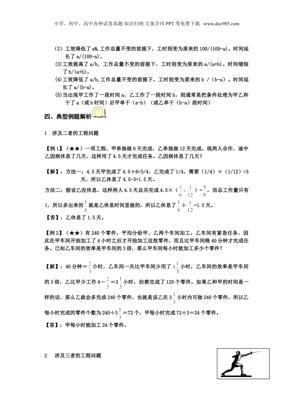 小学、初中、高中各种试卷真题知识归纳文案合同PPT等免费下载www.doc985.com小升初专项训练工程篇一、小升初考试热点及命题方向罗巴切夫斯基是俄国数学家。曾经有一位承包商向他请教过一个工程问题:某项工程,若甲、乙单独去做,甲比乙多用4天完成;若甲先做2天后,再和乙一起做,则共用7天可完成,问甲、乙两人单独做此工程各需多少天完成?答案:设甲、乙两人每人完成该项工程的一半,以题意,甲、乙两人单独完成,甲比乙多用4天,所以每人单独完成一半时,甲比乙多用2天。另外,已知甲先做2天,然后与乙合作,7天完成,这就是说,甲、乙共同完成全部工作时(每人做一半),相差刚好2天,那么很明显,甲在7天中正好完成了工程的一半,而乙在5天中也完成了工程的一半。这样,甲单独完成要14天,乙单独完成要10天。工程问题在历届考试中之所以难,是因为工程问题中比例和单位“1”综合。还有就是学生欠缺一些固定的条件的理解和转化能力。二、考点预测13年的这一题型必然将继续出现,题型的出题热点在利用通项表达式(即字母表示)总结出已知条件中等式的内在规律和联系,这一类题型主要考察学生根据已有条件进行归纳与猜想的能力,希望同学们多加练习。三、知识要点在工程问题中,一般要出现三个量:工作总量、工作时间(完成工作总量所需的时间)和工作效率(单位时间内完成的工作量)。【基本公式】:这三个量之间有下述一些关系式:工作效率×工作时间=工作总量;工作总量÷工作时间=工作效率;工作总量÷工作效率=工作时间。为叙述方便,把这三个量简称工量、工时和工效。【规律总结】:不要求记忆,但要求能够理解和运用。(1)工效提高了a%,工作总量不变的前提下,工时则变为原来的100/(100+a)。时间缩短了a/(100+a)。希望考入重点中学?学科网是我们成就梦想的地方!深刻理解公式的用法!小学、初中、高中各种试卷真题知识归纳文案合同PPT等免费下载www.doc985.com(2)工效降低了a%,工作总量不变的前提下,工时则变为原来的100/(100-a)。时间延长了a/(100-a)。(3)工效提高了a/b,工作总量不变的前提下,工时则变为原来的a/(a+b)。时间缩短了b/(a+b)。(4)工效降低了a/b,工作总量不变的前提下,工时则变为原来的b/(b-a)。时间延长了a/(b-a)。(5)当出现甲工作了一段时间a,乙工作了一段时间b,则通常是把条件处理为甲乙和干了a(或b时间)后甲单干(a-b)(或乙单干(b-a)段时间)四、典型例题解析1涉及二者的工程问题【例1】(★★)一项工程,甲单独做6天完成,乙单独做12天完成。现两人合作,途中乙因病休息了几天,这样用了4.5天才完成任务。乙因病休息了几天?【解】:方法一:4.5天甲完成了4.5÷6=3/4,乙完成了1/4,需要(1/4)÷(1/12)=3天,所以乙休息了4.5-3=1.5天。方法二:假设乙没休息,这样两人4.5天总共完成4.5×()=,而总工作量只有1,所以多出来的就是乙休息时间里做的,所以乙休息了÷=1.5天。【答】:乙休息了1.5天。【例2】(★★)有240个零件,平均分给甲、乙两个车间加工。乙车间有紧急任务,因此在甲车间开始加工了4小时之后才开始加工这批零件,而且比甲车间晚40分钟才完成任务。已知乙车间的效率是甲车间的3倍,那么甲车间每小时能加工多少个零件?【解】:40分钟=小时,乙车间一共比甲车间少用了小时,乙车间的效率是甲车间的3倍,乙比甲少工作4-=3小时,但都完成了120个零件。如果乙和甲的时间是一样的话,那么乙就会多完成240个零件,也就是说乙在3小时内可做240个零件,所以乙每小时完成的零件个数为240÷3=72个,甲每小时完成72÷3=24个零件。【答】:甲每小时能加工24个零件。2涉及三者的工程问题小学、初中、高中各种试卷真题知识归纳文案合同PPT等免费下载www.doc985.com【例3】(★★★)一项工程,甲队单独做24天完成,乙队单独做30天完成。现在甲、乙两队先合做8天,剩下的由丙队单独做了6天完成了此项工程。如果从开始就由丙队单独做,需要几天?【解】:方法一:设工作总量为[24,30]=120单位,则甲队每天完成240÷24=5单位,乙队每天完成240÷30=4单位。前8天,甲、乙两队共完成(5+4)×8=72单...