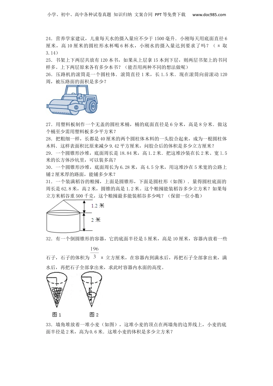 小学、初中、高中各种试卷真题知识归纳文案合同PPT等免费下载www.doc985.com小学数学小升初周长、面积、体积相关问题应用题闯关1.王大妈家的柜式空调长0.4米,宽0.2米,高1.7米,为了防灰尘,王大妈准备用布做一只长方体套子把这只空调罩起来,请你帮她算一下,做这只套子至少需用多少平方米的布?(接头处共需用布0.2平方米)2.一间教室,长9米,款6米,高3米,门窗13.5平方米.要把教室四周和屋顶粉刷一遍,每平方米付材料和工资费用10.5元,一共要付多少元?3.长10米,宽8米,高3.5米的教室,抹上石灰,扣除门窗黑板面积9.8平方米,抹石灰的面积有多少平方米?4.一个长方体的饮料盒,长6厘米,宽4厘米,高8厘米,在它的四周贴一圈商标纸,商标纸的面积是多少平方厘米?5.一个圆柱体的容器中,放有一个长方体铁块.现在打开一个水龙头往容器中注水,3分钟时,水恰好没过长方体的顶面,又过了18分钟,水灌满容器.已知容器的高度是50厘米.长方体的高度是20厘米,那么长方体底面积与容器底面面积的比等于多少?6.一个长方体玻璃鱼缸(鱼缸的上面没有玻璃),长5分米,宽3分米,高3.5分米.制作这个鱼缸至少需要多少平方分米的玻璃?7.用一根长40分米的铁丝做一个长方体的框架,使它的高为4分米,长、宽的比是1:1,再把它五个面糊上纸,做成一个长方体的灯笼,至少需要多少平方分米的纸?8.王老师家买了一个金鱼缸,从外面量长8分米,宽4分米,高6.5分米,(1)如果要把鱼缸放在柜子上,要占多大的面积?(2)请你算一算,制作这个鱼缸要用多少玻璃?9.阅读短文,解决问题。国家游泳中心又被称为“水立方”(WaterCube),是北京为2008年夏季奥运会修建的主游泳馆.“水立方”的长、宽、高分别为177米、177米、30米,设计采用了泡沫理论,建筑外墙分布着3000个不规则的泡泡气枕,整个外墙表面覆盖面积达到11万平方米,比德国世界杯安联球场的外墙表面覆盖面积还要大5万平方米.“水立方”具有整体重量轻(总用钢量6900吨,每平方米用钢量仅120千克)、跨度大(最大跨度130米)的特点。“水立方”的总用钢量比相邻的鸟巢用钢量约少65.5%.相比之下,“水立方”显得更加节省能源。(1)“水立方”的体积是多少立方米?(只列式,不解答)(2)“水立方”的外墙表面覆盖面积比德国世界杯安联球场的外墙表面覆盖面积大百分之几?(百分号前保留一位小数)(3)鸟巢用钢量大约多少吨?10.一个有盖长方体不锈钢水箱,高是8分米,原来水箱里有水深5分米,后来放入一个体积6000立方厘米的铁块后(水淹没铁块)水深5.4分米,这个水箱一共能存水多少立方分米?11.如图,左边是一个装满了果汁的饮料盒,右边是一个茶杯,茶杯的底面直径是10厘米,高是8厘米。如果把饮料盒内的果汁全部倒入右边的茶杯里,能倒满几杯?小学、初中、高中各种试卷真题知识归纳文案合同PPT等免费下载www.doc985.com12.一个长方体水池,长20米、宽9米,池中水深1.57米.池底有根出水管,水管内直径为2分米,放水时水流速度平均每秒2米,放完这池水需要多少分钟?13.牧民们打算在草原附近修建一共圆形的牛栏,半径为50米。(1)如果每隔2米安装一根木桩,一圈一共要安装多少根木桩?(2)如果用粗铁丝把这个牛栏围成5圈,(接头处忽略不计)至少需要铁丝多少米?14.一辆自行车轮胎的外直径是70厘米,小强骑着自行车通过一座1000米长的大桥,如果车轮平均每分钟转100周,要用多长时间通过大桥?(得数保留一位小数)15.某文具店搞促销,其中一种直径7毫米的圆柱形铅笔“买一送一”。为了方便,商店把每两支这样的铅笔用胶带捆扎(接头处忽略不计),捆扎这样的两支铅笔至少需要多长的胶带?(结果保留整数)16.一条“机器蛇”长1.2米,直径0.06米,重1.8千克.你看它扭动着身躯,在地上蜿蜒爬行,一会儿前进,一会儿后退,简直跟真蛇一样,它最快的爬行速度可达20米/分。(1)如果用“机器蛇”围成一个圆,这个圆的面积是多少?(2)如果这条机器“蛇”从中间断开,它的横截面的面积是多少?17.在一块半径为10米的圆形菜地上种水果,西瓜占总面积的20%,剩下的地按1:3的比例中西红柿和茄子,西红柿...