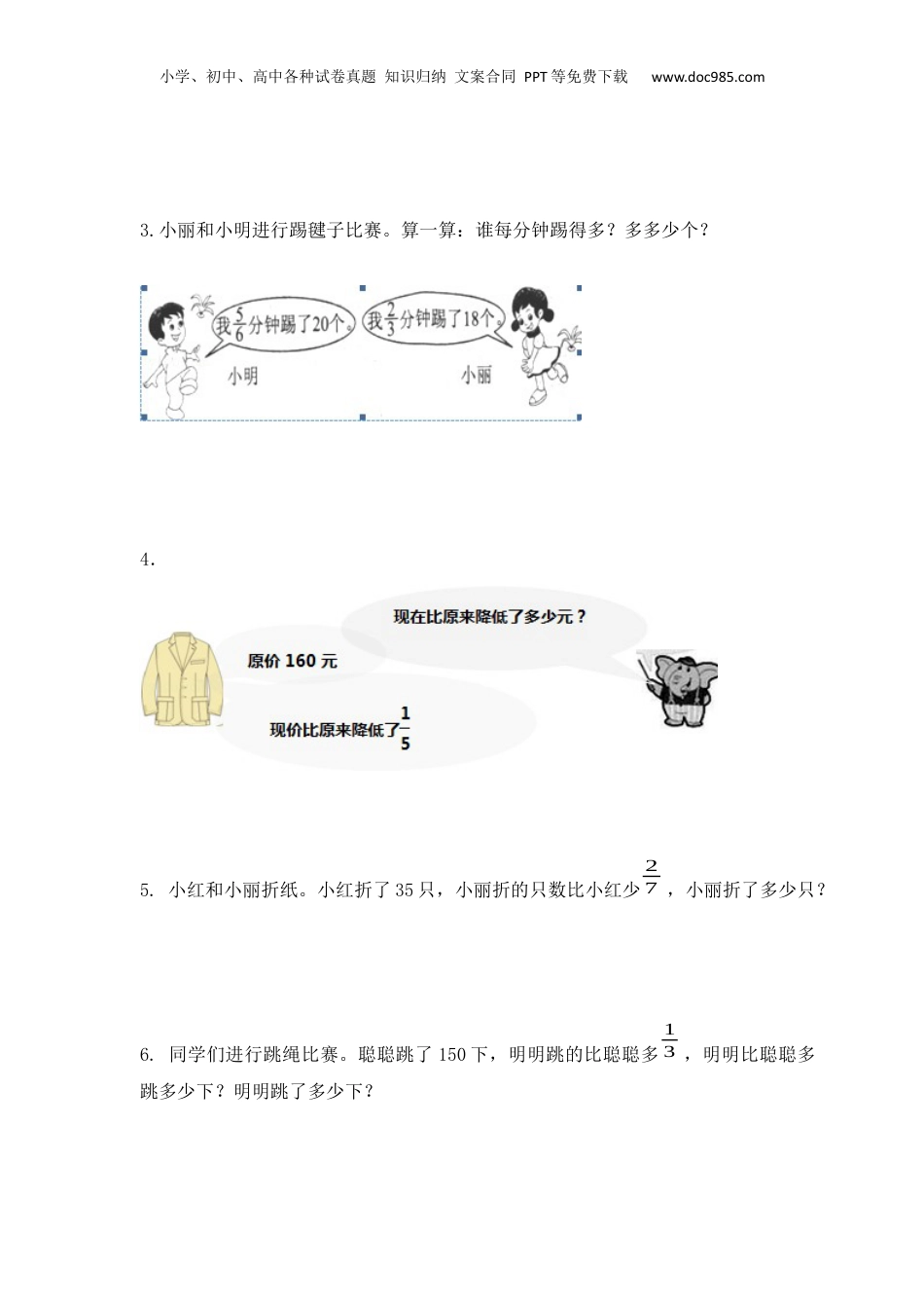 小学、初中、高中各种试卷真题知识归纳文案合同PPT等免费下载www.doc985.com应用题综合练习一、选择题1.某人去年养鸡4000只,今年比去年多养,算式:4000×(1+)表示某人()的只数。A.今年养B.今年比去年多养C.去年养D.去年比今年少2.6年级男生有110人,男生比女生少,求女生人数的算式是()A.110×(1+)B.110×(1﹣)C.110÷(1+)D.110÷(1﹣)3.如图,剩下的160km相当于全长的()A.B.1+C.1﹣D.60+4.第一组比第二组多25%,是把()看作单位“1”。A.第一组B.第二组C.总组数5.小强和小刚身高比是4:5,小强的身高是小刚身高的(),X,K]A.20%B.25%C.80%D.125%[来源:Z|xx|k.Com]6.一支钢笔现在的售价是5元,比原价降低了1元,比原价降低了()。A20%B.25%C16.7%D83.3%小学、初中、高中各种试卷真题知识归纳文案合同PPT等免费下载www.doc985.com.[来源:学科网ZXXK]..7.一个半圆形花坛的半径是2米,则这个花坛的周长是()米。A.3.14B.6.28C.10.288.一种玩具车车轮的半径是3厘米,它在路面上滚动一周,滚动了()厘米。A.3B.9.42C.18.84D.28.269.一直挂钟的时针长9厘米,一昼夜这根时针走过的面积是多少平方厘米?正确列式是()A.9×2×3.14B.3.14×92×2C.3.14×9210.要统计天河公园各种树林所占百分比的情况,应选用()A.条形统计图B.折线统计图C.扇形统计图D.统计表11.要清楚地反映果园里各种果树的棵数与总棵数之间的关系,应选用()A.条形B.折线C.扇形12.60平方米的教室与4平方厘米的邮票.它们的面积比是()A.15:1B.1500:1C.150000:1二、解答题。1.人体中的血液约占体重的,血液里约是水.小东的体重是39千克,他的血液里大约含水多少千克?2.一辆小汽车行千米,用汽油升。小学、初中、高中各种试卷真题知识归纳文案合同PPT等免费下载www.doc985.com3.小丽和小明进行踢毽子比赛。算一算:谁每分钟踢得多?多多少个?4.5.小红和小丽折纸。小红折了35只,小丽折的只数比小红少27,小丽折了多少只?6.同学们进行跳绳比赛。聪聪跳了150下,明明跳的比聪聪多13,明明比聪聪多跳多少下?明明跳了多少下?[来源:Z,xx,k.Com]小学、初中、高中各种试卷真题知识归纳文案合同PPT等免费下载www.doc985.com[来源:学|科|网]7.某地区农民人均年收入增长情况如图所示,2003年人均收入为2520元,1998年人均年收入为多少元?[来源:学.科.网Z.X.X.K]8.修一段路,甲队10天完成,乙队单独要15天完成,如果两队共同修这段路,要多少天才能完成?9.一个工人3天完成一批零件,第1天完成总数的,第2天完成总数的,第3天完成25个,这批零件共有多少个?10.(2012•綦江县)爸爸花180元钱给我买了一套服装,上衣的价钱是裤子的2倍,上衣和裤子各花了多少钱?小学、初中、高中各种试卷真题知识归纳文案合同PPT等免费下载www.doc985.com11.(2013•长沙)一所学校共有810人,其它年级的学生是六年级的5倍,六年级学生多少人?其它年级一共多少人?12.一部手机和一部电话共2240元,手机的单价是电话机的7倍,手机和电话机的单价各是多少元?13.龙场乡今年的玉米产量比去年增加20%,今年的玉米产量是8400吨,那么去年的产量是多少吨?14.一套桌椅的价钱共400元,其中椅子的价钱是桌子的60%.桌子和椅子的单价各是多少?小学、初中、高中各种试卷真题知识归纳文案合同PPT等免费下载www.doc985.com15.王浩测的树干的周长是125.6厘米,这棵树横截面的面积是多少平方厘米?16.如图,地面上平躺着一个半径为0.5米的球.如果要将这个球滚到墙边,需要转动几圈?(结果保留整数)17.光明小学操场是一个长方形,周长是360m,长与宽的比是3:2,这个操场的面积是多少平方米?小学、初中、高中各种试卷真题知识归纳文案合同PPT等免费下载www.doc985.com18.一座电视塔的圆形塔底的半径是30m,现在要在它的周围种植20m宽的环形草坪(如图),如果在草坪的外围围一圈贴栅栏,这圈铁栅栏长多少米?草坪的面积有多大?[来源:学科网ZXXK]19.如图是某工厂2010年完成产值情况统计图。(1)已知第三季度完成产值1000万元,全年完成产值多少万元?...
