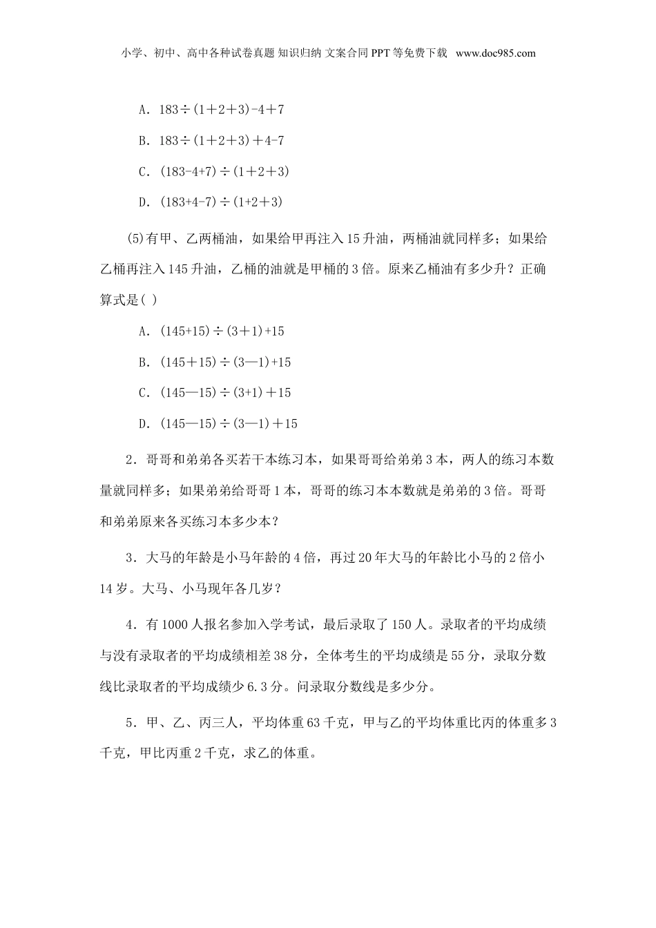 小学、初中、高中各种试卷真题知识归纳文案合同PPT等免费下载www.doc985.com训练B卷班级______姓名______得分______1.选择题(把表示正确算式的字母编号填在括号里)(1)甲、乙两人共储蓄640元,乙、丙两人共储蓄600元,甲、丙两人共储蓄440元。甲储蓄多少元?正确算式是()A.(640+600+440)÷2-440B.(640+600+440)÷2-600C.(640+600+440)÷2-640D.(640+600+440)÷2(2)一个除式,商是18,余数是4,被除数与除数的和是270,被除数是多少?正确算式是()A.270÷(1+18)×18-4B.270÷(1+18)×18+4C.(270-4)÷(1+18)×18-4D.(270-4)÷(1+18)×18+4(3)有甲、乙两筐苹果,平均每筐重52千克,现从甲筐中取出5千克放入乙筐,则两筐苹果重量相等。甲筐苹果原来重多少千克?正确算式是()A.(52×2+5×2)÷2B.(52×2+5)÷2C.(52+5×2)÷2D.(52×2-5×2)÷2(4)甲、乙、丙三人共做了183道数学题,乙做的题比丙的2倍少4道,甲做的题比丙的3倍多7道。丙做了多少道题?正确算式是()小学、初中、高中各种试卷真题知识归纳文案合同PPT等免费下载www.doc985.comA.183÷(1+2+3)-4+7B.183÷(1+2+3)+4-7C.(183-4+7)÷(1+2+3)D.(183+4-7)÷(1+2+3)(5)有甲、乙两桶油,如果给甲再注入15升油,两桶油就同样多;如果给乙桶再注入145升油,乙桶的油就是甲桶的3倍。原来乙桶油有多少升?正确算式是()A.(145+15)÷(3+1)+15B.(145+15)÷(3—1)+15C.(145—15)÷(3+1)+15D.(145—15)÷(3—1)+152.哥哥和弟弟各买若干本练习本,如果哥哥给弟弟3本,两人的练习本数量就同样多;如果弟弟给哥哥1本,哥哥的练习本本数就是弟弟的3倍。哥哥和弟弟原来各买练习本多少本?3.大马的年龄是小马年龄的4倍,再过20年大马的年龄比小马的2倍小14岁。大马、小马现年各几岁?4.有1000人报名参加入学考试,最后录取了150人。录取者的平均成绩与没有录取者的平均成绩相差38分,全体考生的平均成绩是55分,录取分数线比录取者的平均成绩少6.3分。问录取分数线是多少分。5.甲、乙、丙三人,平均体重63千克,甲与乙的平均体重比丙的体重多3千克,甲比丙重2千克,求乙的体重。小学、初中、高中各种试卷真题知识归纳文案合同PPT等免费下载www.doc985.com6.有一个班的同学去划船。他们算了一下,如果增加一条船,正好每条船坐6个人;如果减少一条船,每条船必须坐9个人。这个班共有多少同学去划船?7.有14个纸盒,其中有装1只球的,也有装2只和3只球的,这些球共有25只。装1只球的盒子数等于装2只球与3只球的盒数的和。装1、2、3只球的盒子各有多少个?8.已知大小酒瓶共50个,每个大瓶装酒1千克,每个小瓶装酒0.75千克,大瓶比小瓶多装酒15千克,大、小瓶各有多少个?9.本学期数学课进行了五次测验,小明的成绩第二次比第一次多10分,第三次比第二次少5分,第四次比第三次多4分,前4次的平均成绩是85分。如果第五次比第四次少13分,那么小明全学期五次测验的平均成绩是多少分?10.甲级茶叶2千克和乙级茶叶5千克的价格相等,买6千克甲级茶叶和7千克乙级茶叶共付款601.92元,每千克甲级茶叶和每千克乙级茶叶的价格各是多少元?11.有甲、乙、丙三个书架,共有图书450本,如果从甲架拿出60本放入乙架,再从乙架拿出120本放入丙架,最后再从丙架拿出50本放入甲架,则三个书架图书本数一样多。原来三个书架各有图书多少本?12.某人领得奖金240元,有2元、5元、10元三种人民币,共50张,其中2元与5元的张数一样多,那么2元、5元、10元各有多少张?B卷小学、初中、高中各种试卷真题知识归纳文案合同PPT等免费下载www.doc985.com1.选择题:(1)B(2)D(3)A(4)D(5)B2.(3×2+1×2)÷(3-1)+1=5(本)(弟)5+3×2=11(本)(哥)3.解:设小马现年x岁,则大马现年4x岁4x+20=2(x+20)-14x=3(小马)4x=12(大马)4.1000-150=850(人)(55×1000+38×850)÷1000-6.3=81(分)5.甲+乙比2个丙多3×2=6(千克)乙比丙多6-2=4(千克)(63×3-4-2)÷3+4=65(千克)6.解法一:(6+9)÷4(9-6)=5(条)6×(5+1)=36(人)解法二:解:设有船x条6(x+1)=9(x-1)x=56×(5+1)=36...